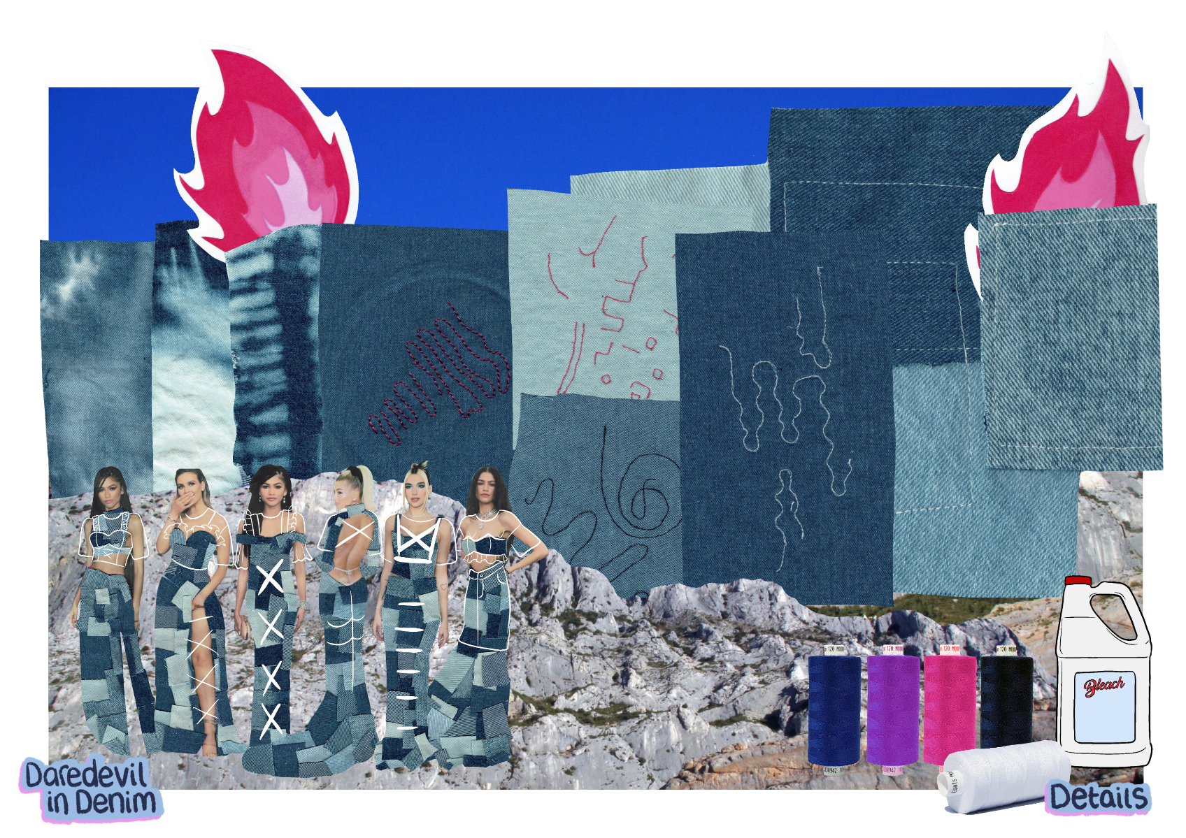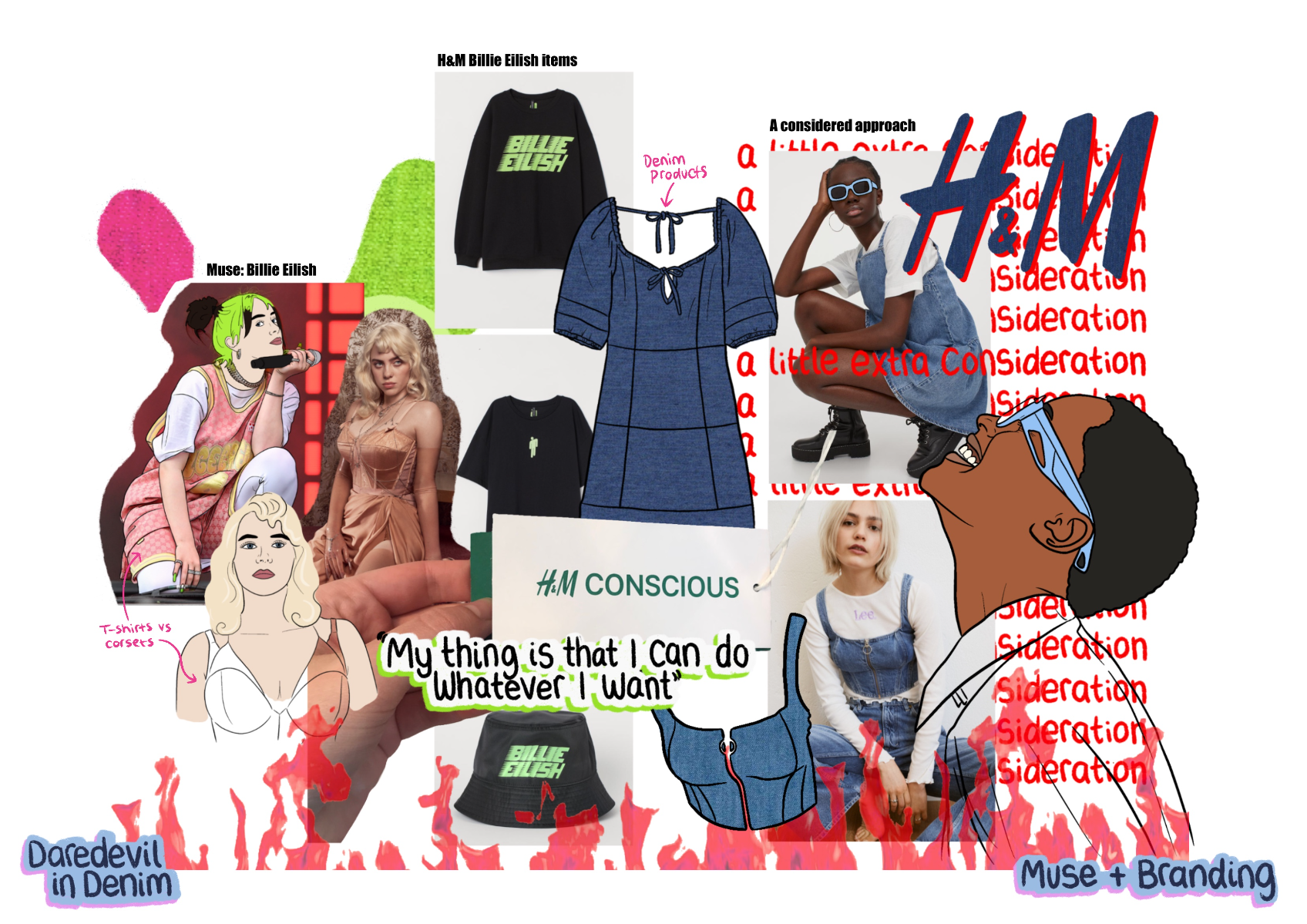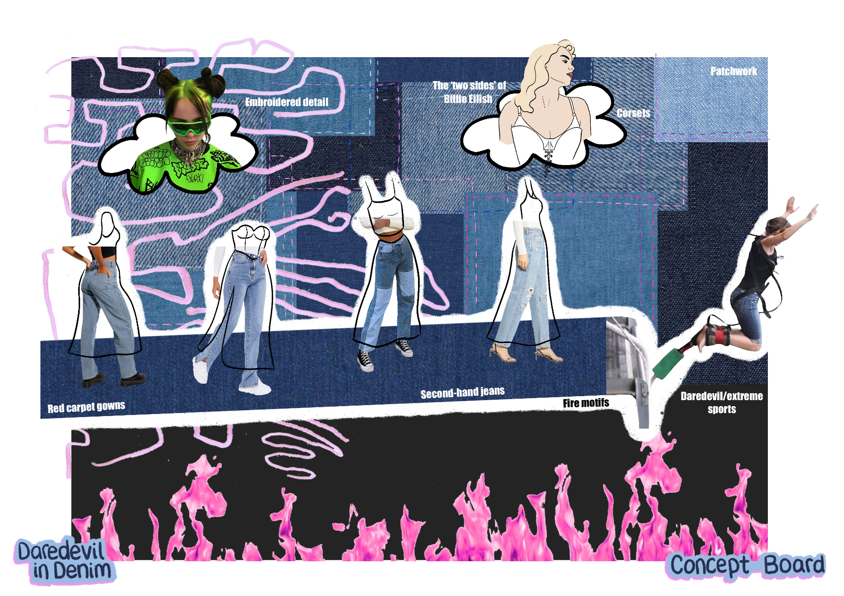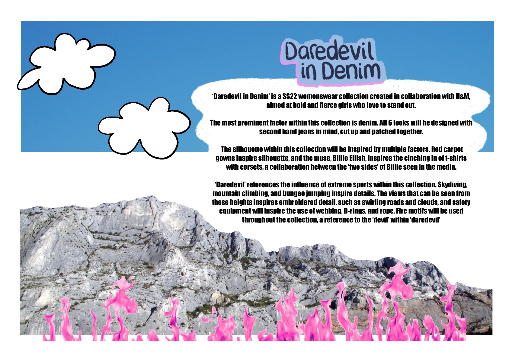 'Daredevil in Denim' is a SS22 womenswear collection created in collaboration with H&M. The most prominent factor is the use of second-hand jeans, patched together to create each look. Red carpet gowns inspire silhouette, alongside the 'two sides' of Billie Eilish seen in the media (t-shirts cinched in by corset tops). 'Daredevil' references the influence extreme sports have on this collection, inspiring details, such as embroidery inspired by the views, and harness detailing. Fire motifs are used as a reference to the 'devil' in 'daredevil'.