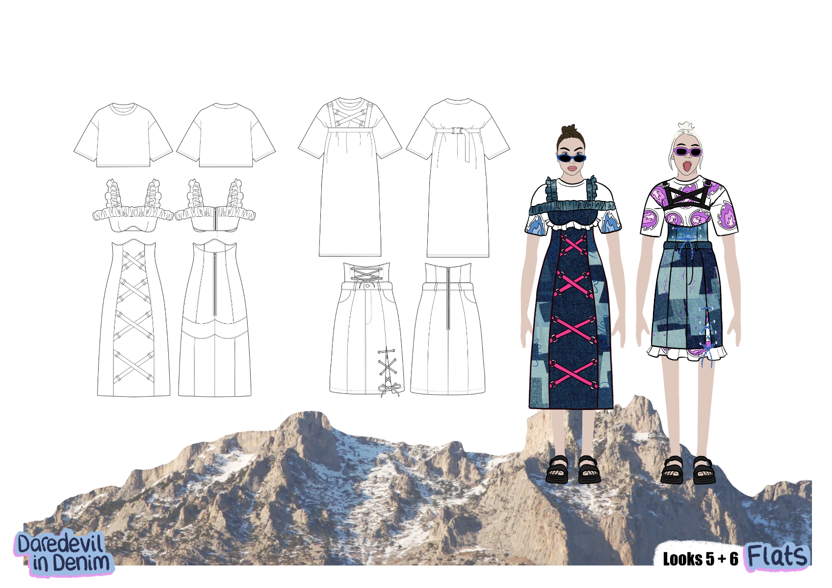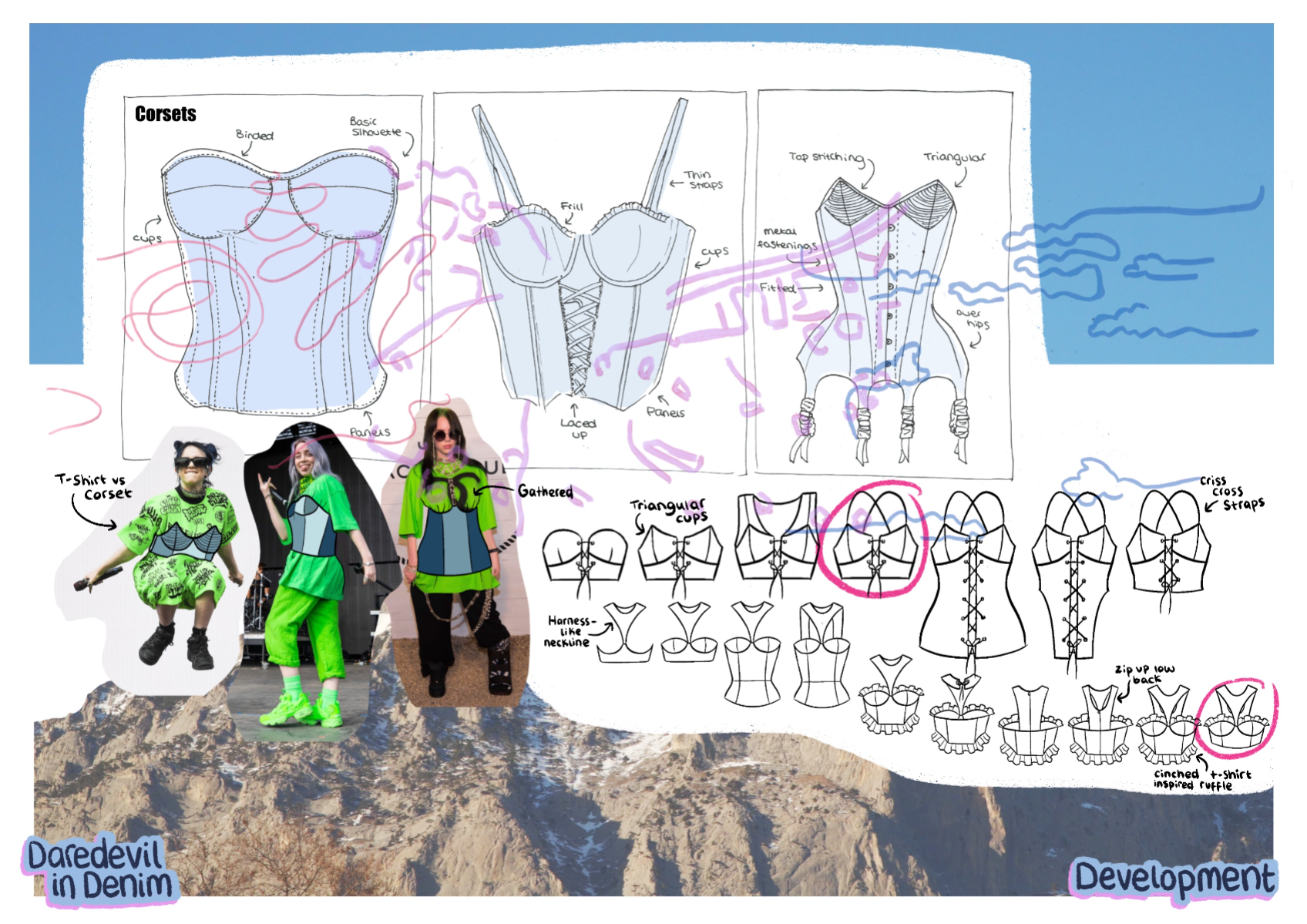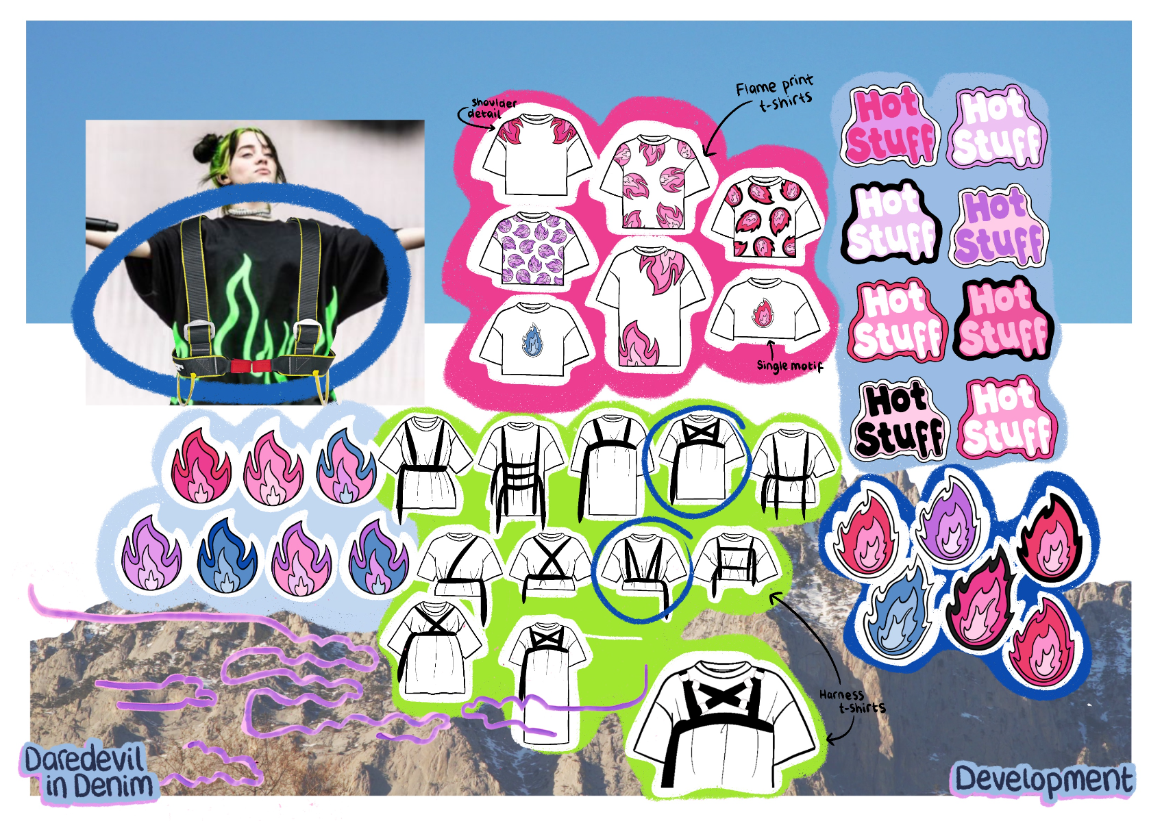 'Daredevil in Denim' is a SS22 womenswear collection created in collaboration with H&M. The most prominent factor is the use of second-hand jeans, patched together to create each look. Red carpet gowns inspire silhouette, alongside the 'two sides' of Billie Eilish seen in the media (t-shirts cinched in by corset tops). 'Daredevil' references the influence extreme sports have on this collection, inspiring details, such as embroidery inspired by the views, and harness detailing. Fire motifs are used as a reference to the 'devil' in 'daredevil'.