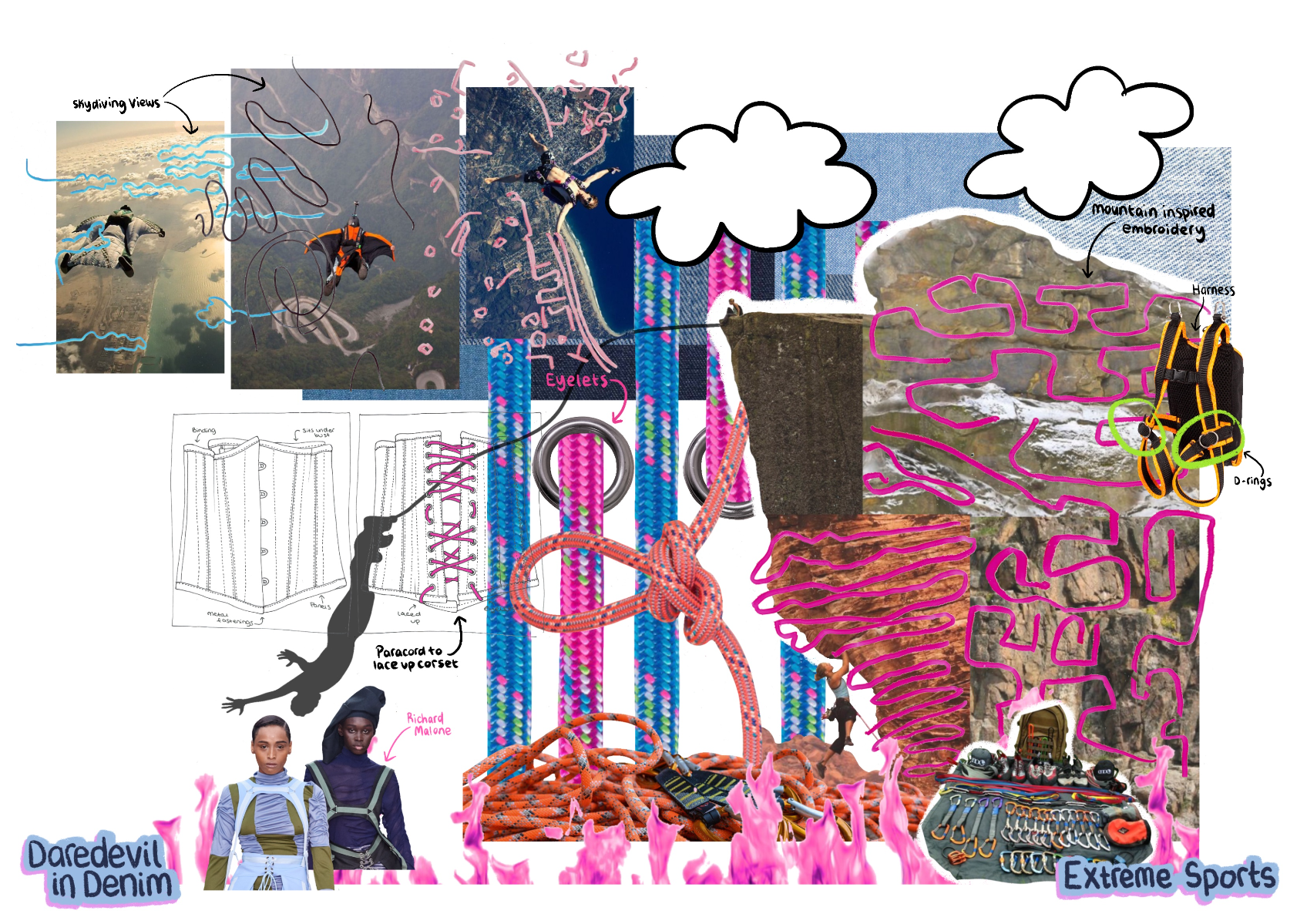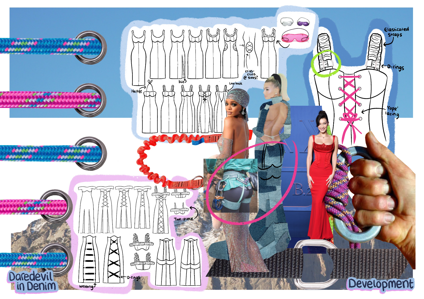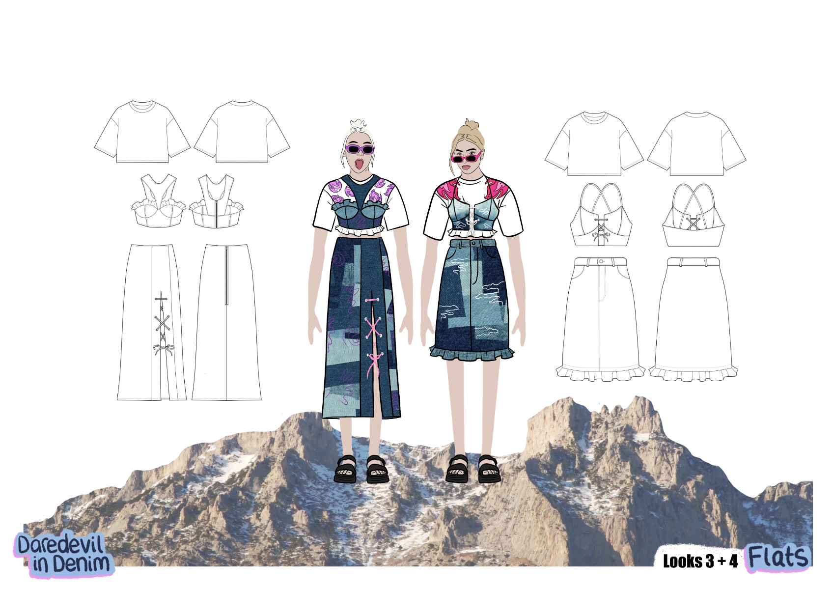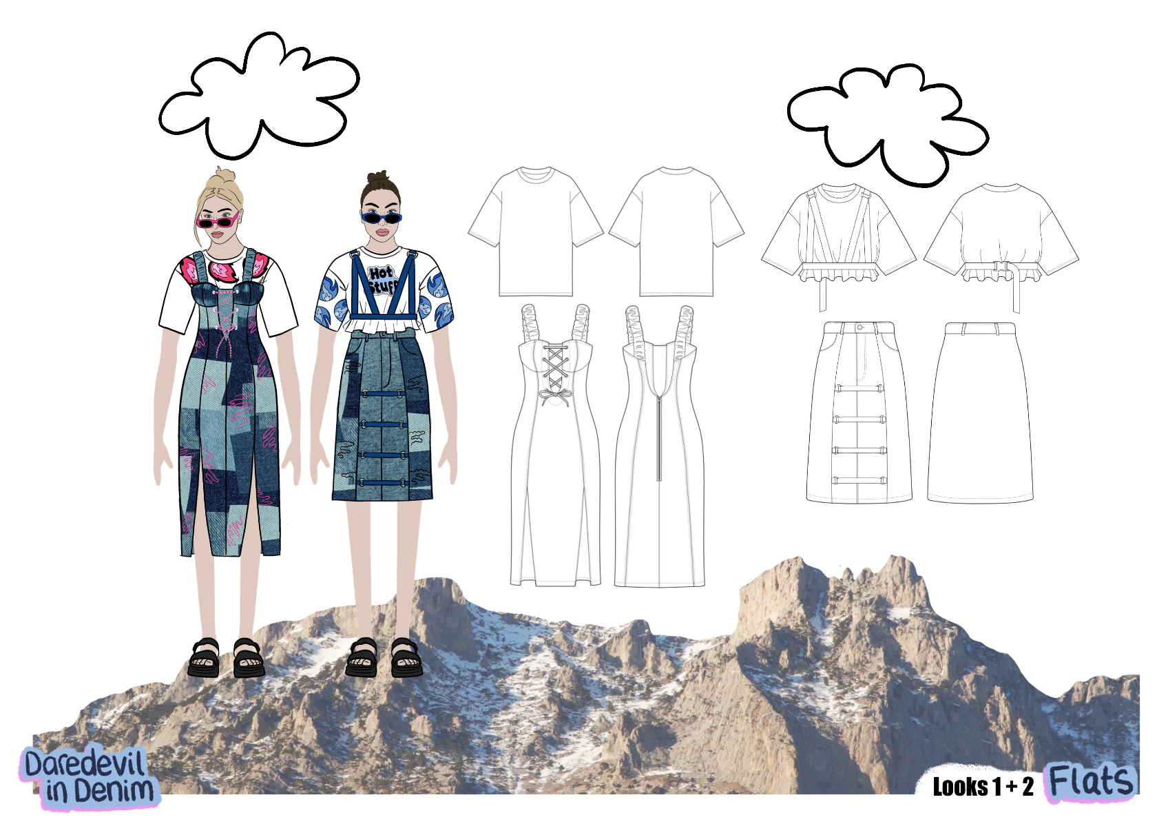 'Daredevil in Denim' is a SS22 womenswear collection created in collaboration with H&M. The most prominent factor is the use of second-hand jeans, patched together to create each look. Red carpet gowns inspire silhouette, alongside the 'two sides' of Billie Eilish seen in the media (t-shirts cinched in by corset tops). 'Daredevil' references the influence extreme sports have on this collection, inspiring details, such as embroidery inspired by the views, and harness detailing. Fire motifs are used as a reference to the 'devil' in 'daredevil'.