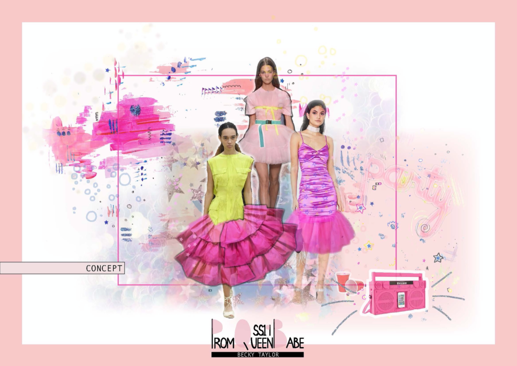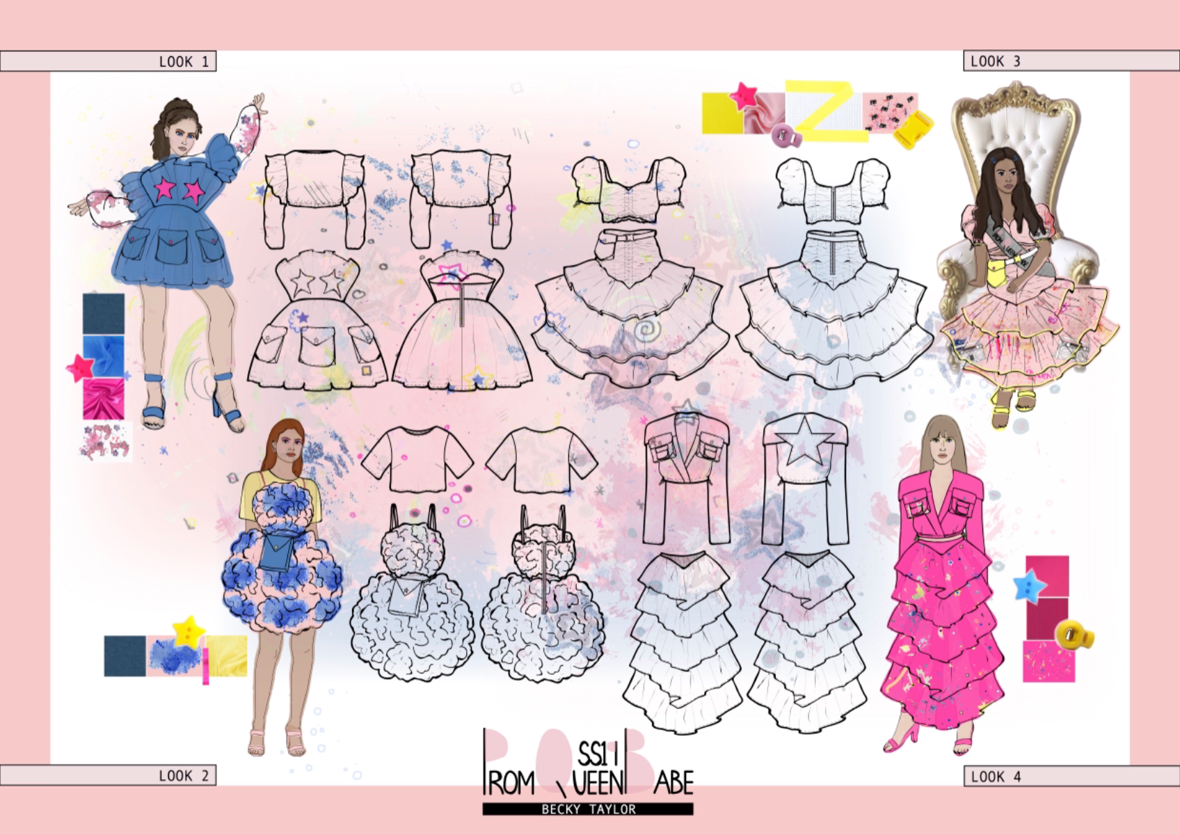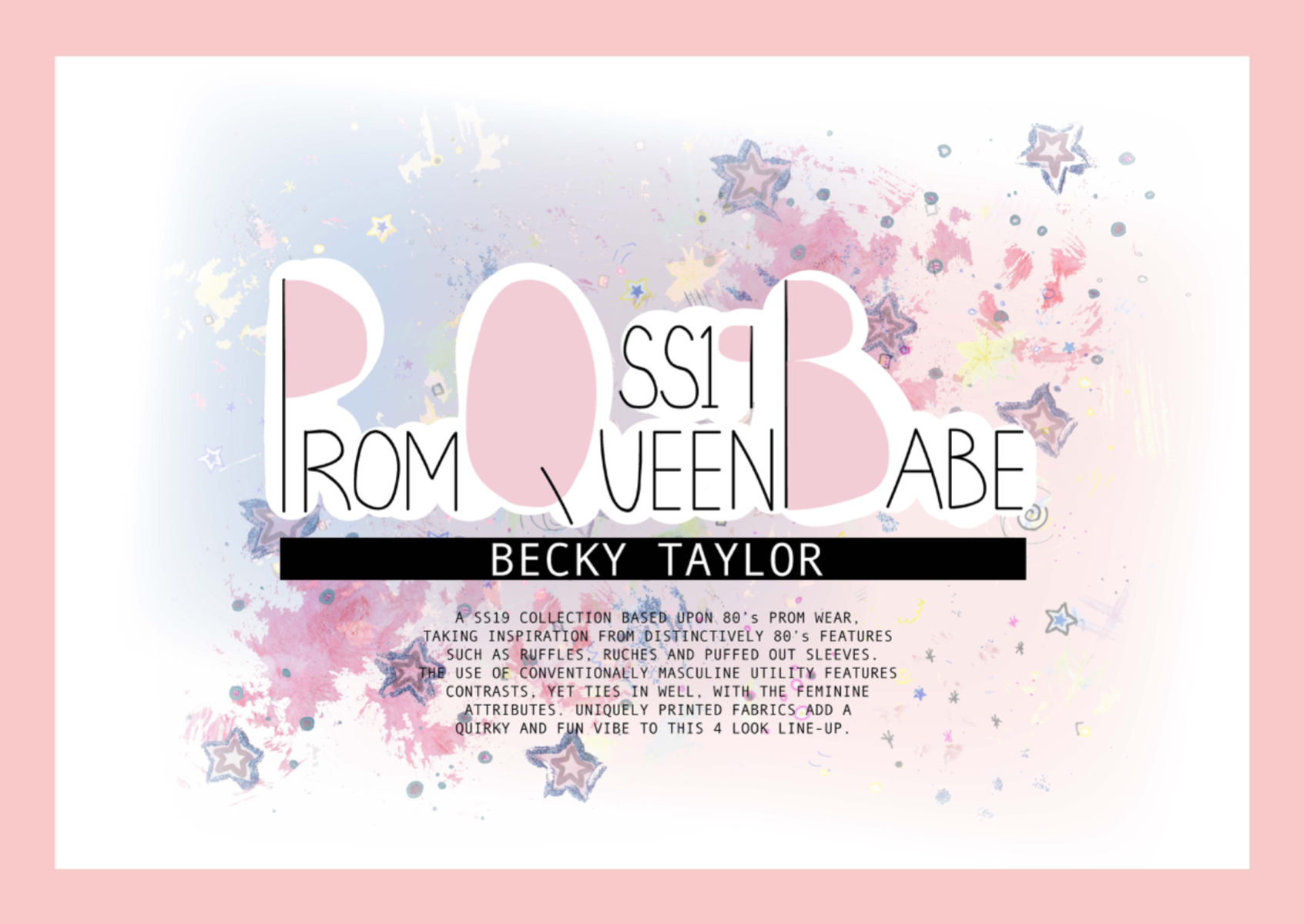 A SS19 collection inspired by overly feminine 80’s prom wear vs conventionally masculine utility features. Uniquely printed fabrics also add a quirky and fun vibe to this 4 look line-up.