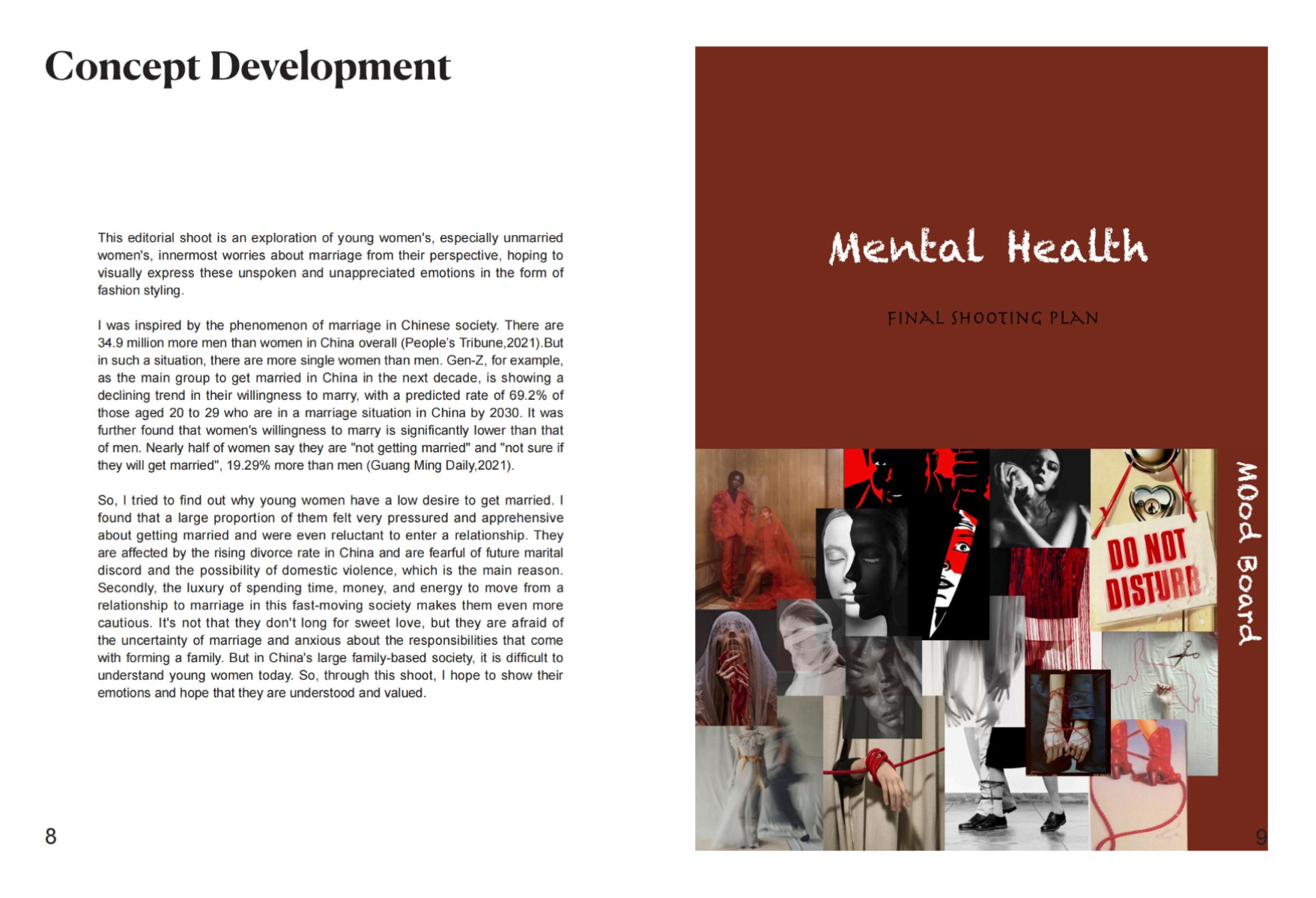 This fashion styling project explores mental health through a conceptual lens, using contrasting silhouettes, symbolic colors, and narrative-driven visual storytelling. Inspired by contemporary social pressures faced by young women, the work blends editorial styling, prop design, and expressive posing to reveal inner conflict, vulnerability, and resilience. Through mood boards, iterative test shoots, and refined creative direction, the project demonstrates my ability to translate emotion into fashion imagery while engaging with cultural context. It reflects my approach to styling: visually compelling, conceptually grounded, and deeply connected to human experience.