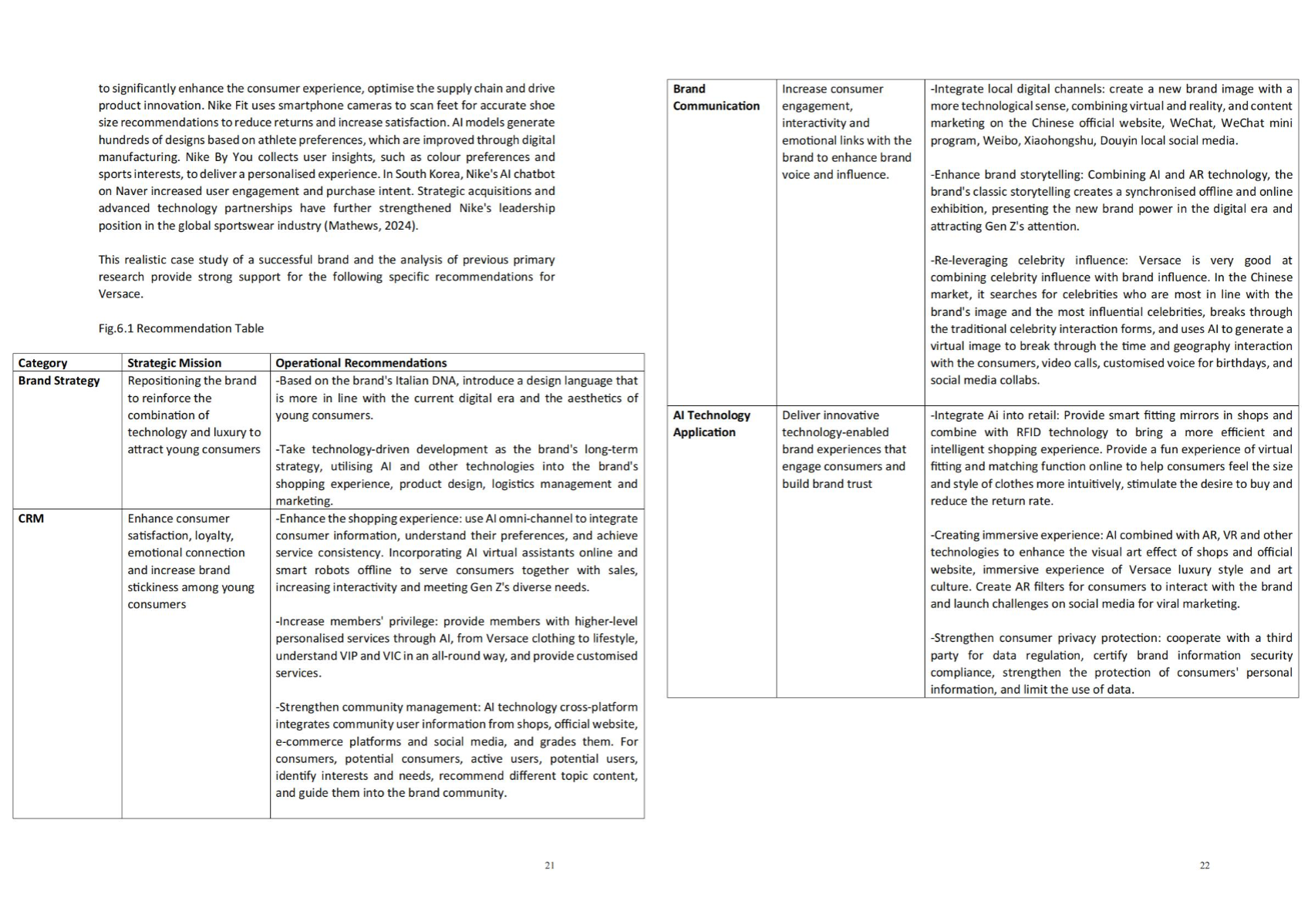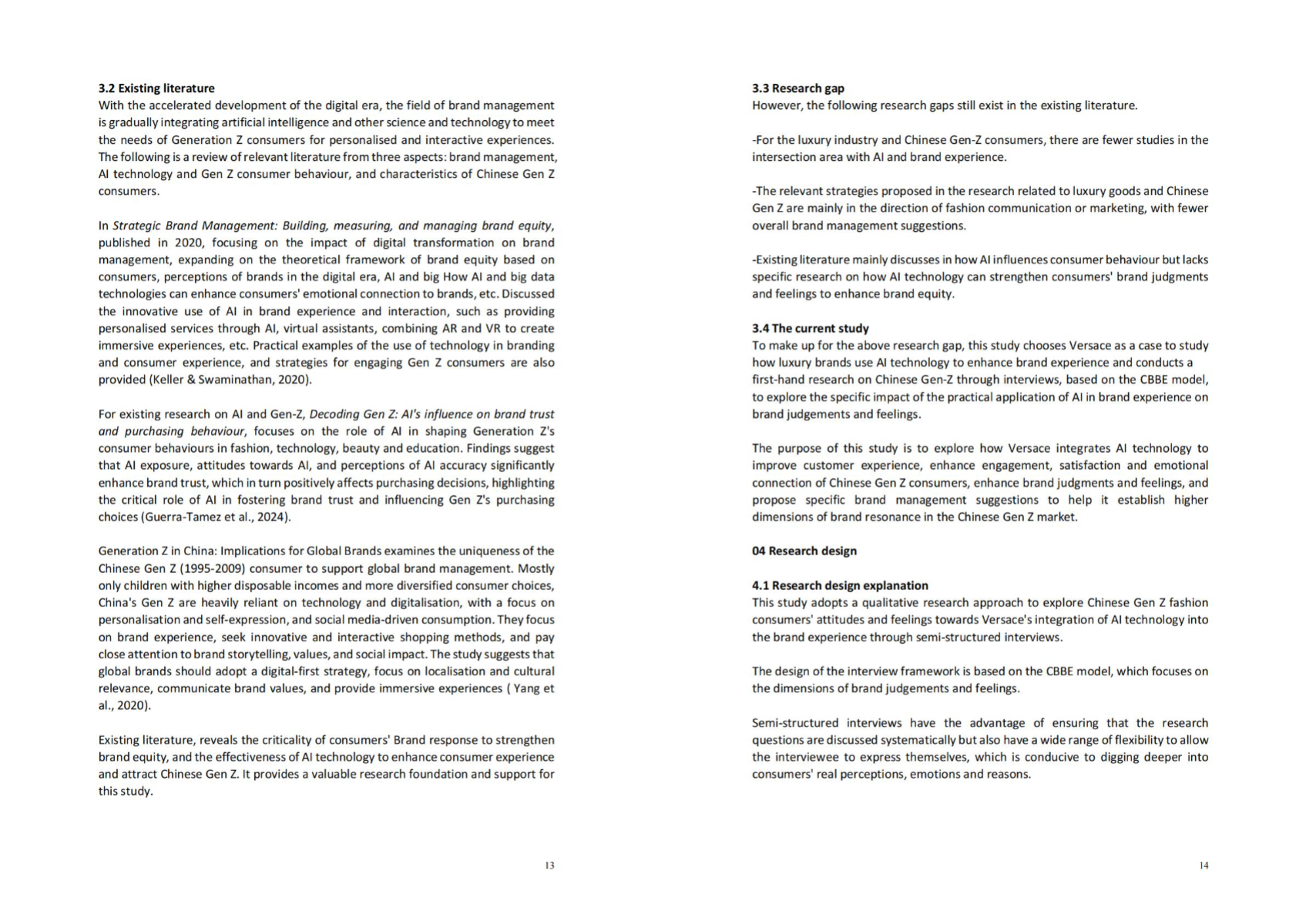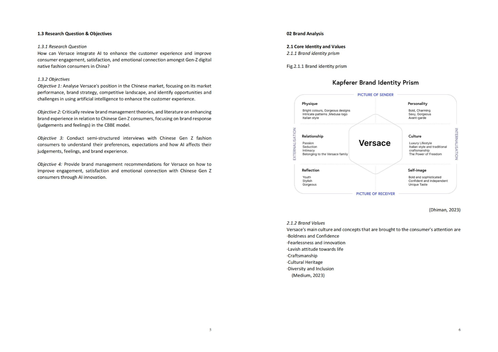 This study investigates how Versace can integrate Artificial Intelligence (AI) to enhance customer experience among Chinese Gen Z consumers. Using the CBBE framework and semi-structured interviews, the research analyses how AI-driven personalisation, interactivity, and immersive experiences influence brand judgments and feelings. Findings show that AI can improve efficiency, engagement, and emotional connection, while challenges remain around data privacy and trust. The study provides strategic recommendations for brand positioning, customer relationship management, communication, and AI implementation in the Chinese luxury market.