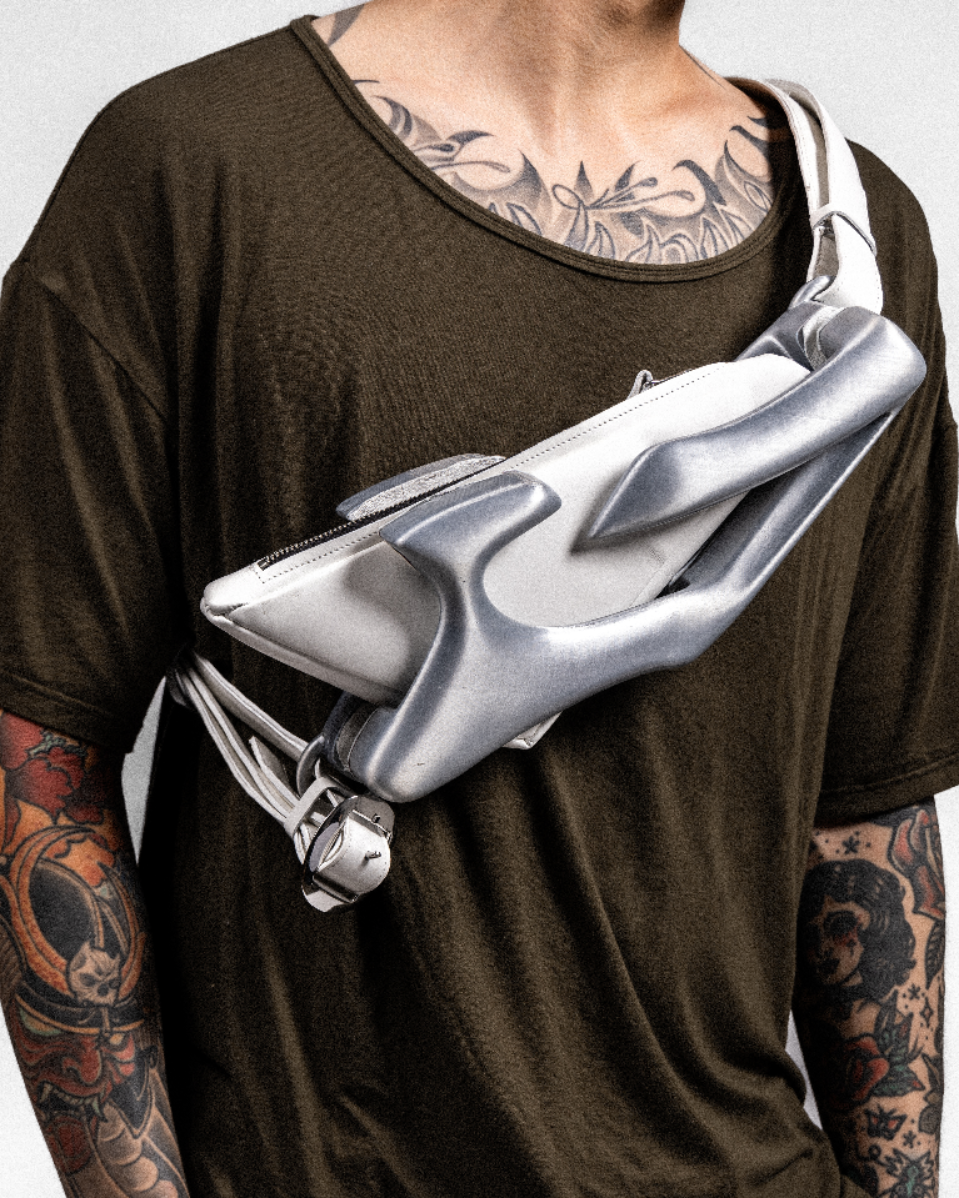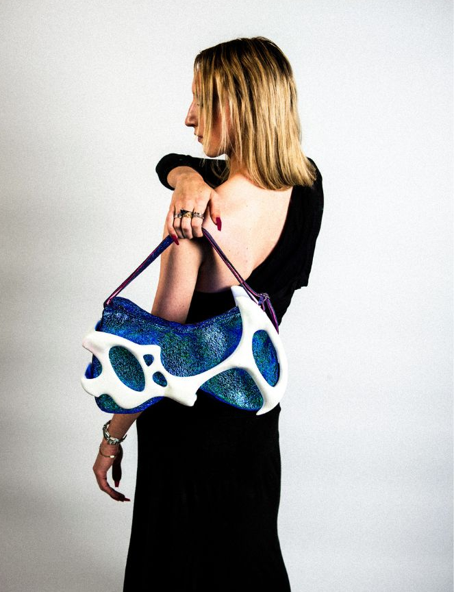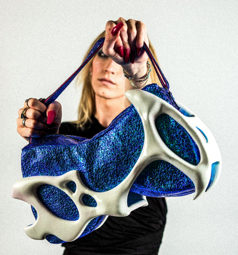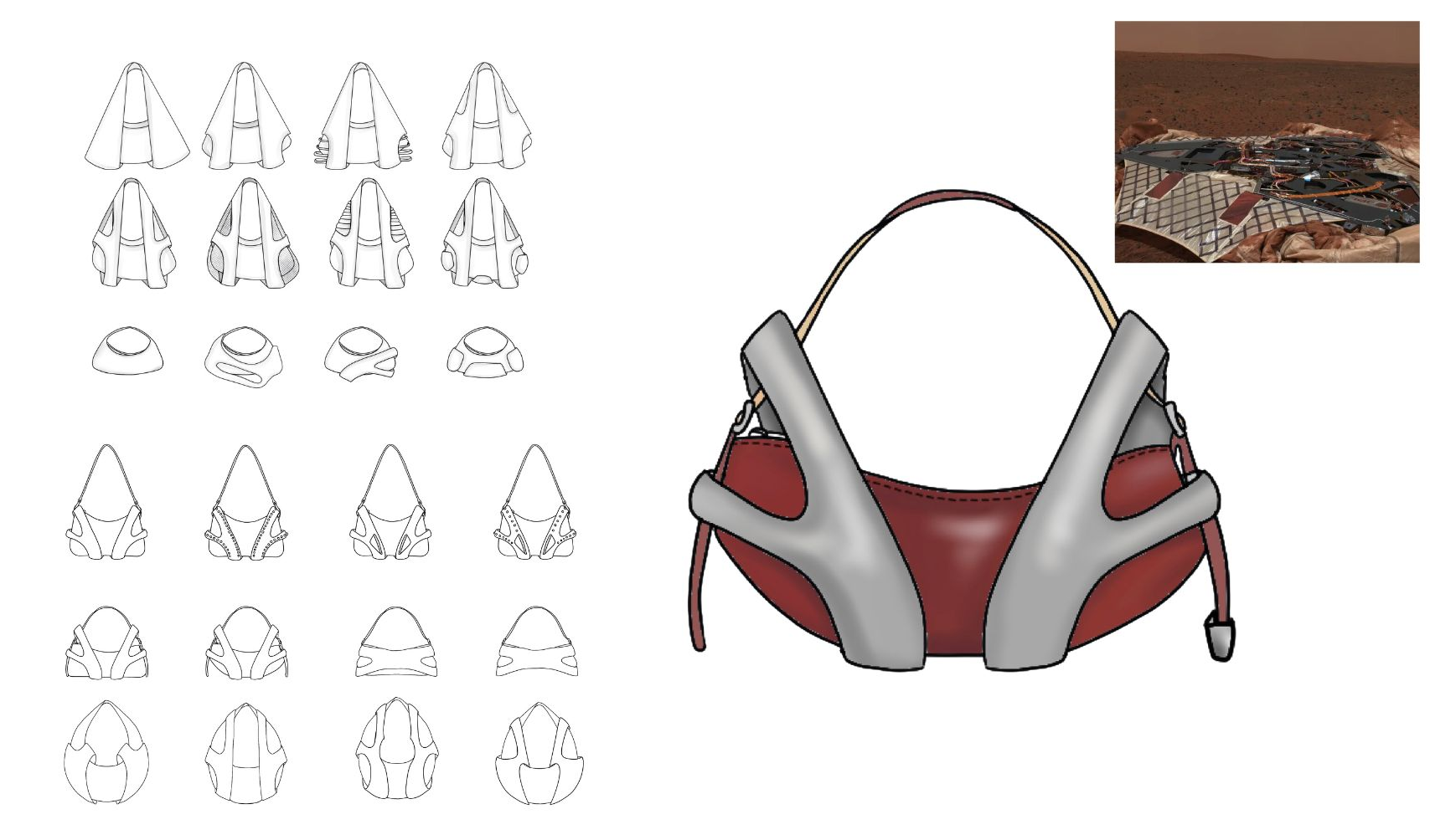 This collection visually represents a planetary life cycle of exploration, evolution, and adaptation. It begins with elemental stabilization of the environment. Followed by emergence of flora, transforming the atmosphere and enabling adaption of complex life. My Adaptation bags are inspired by deep sea life and the development of organisms having harder shells for digging. They feature 3D modeled cages in Rhino3D, contrasting the leather of the exterior.