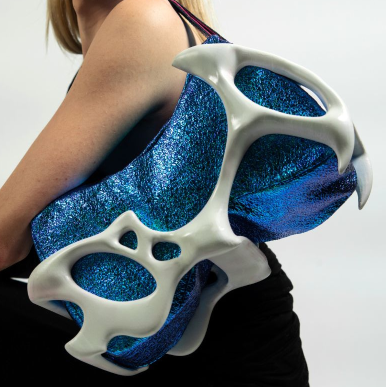 This collection visually represents a planetary life cycle of exploration, evolution, and adaptation. It begins with elemental stabilization of the environment. Followed by emergence of flora, transforming the atmosphere and enabling adaption of complex life. My Adaptation bags are inspired by deep sea creatures developing hard shells for burrowing and digging thus I contrast the soft exterior bag with a 3D modeled cage in Rhino3D.