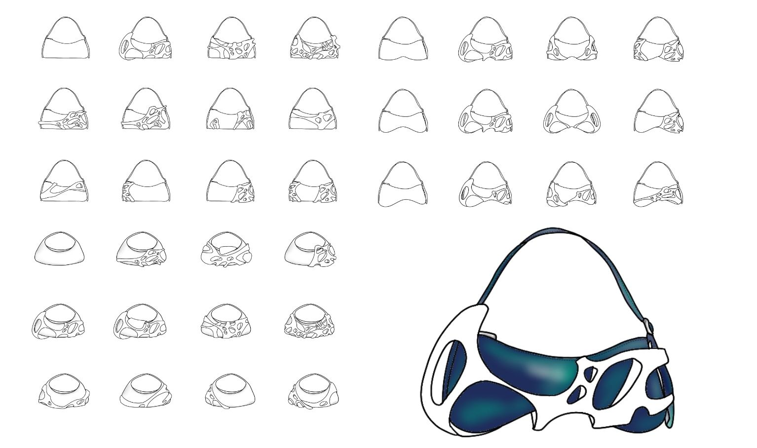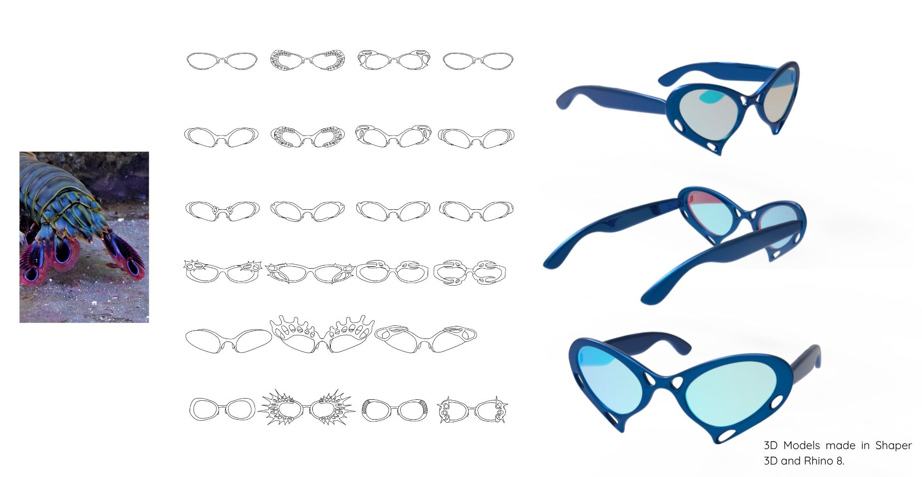 This collection visually represents a planetary life cycle of exploration, evolution, and adaptation. It begins with elemental stabilization of the environment. Followed by emergence of flora, transforming the atmosphere and enabling adaption of complex life. My Adaptation eyewear is inspired by deep sea creatures. It is modeled in Rhino3D.