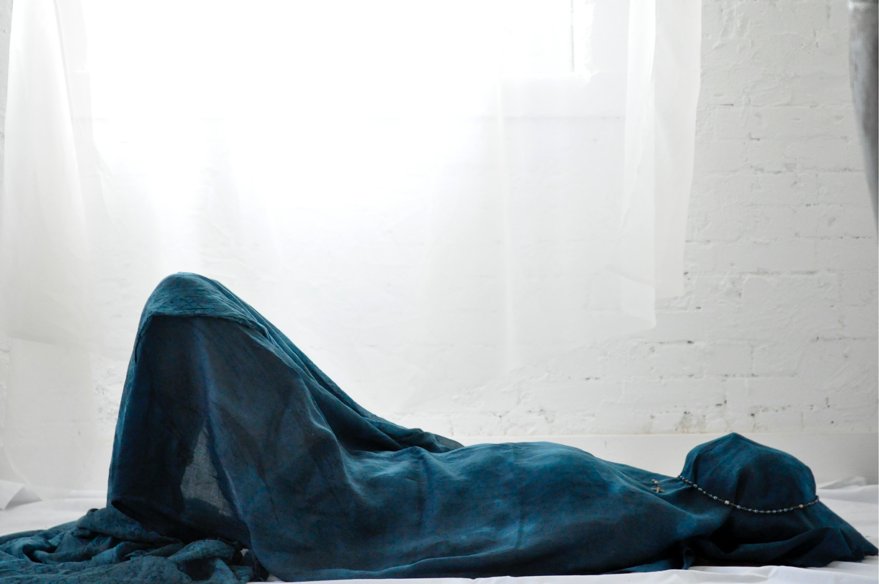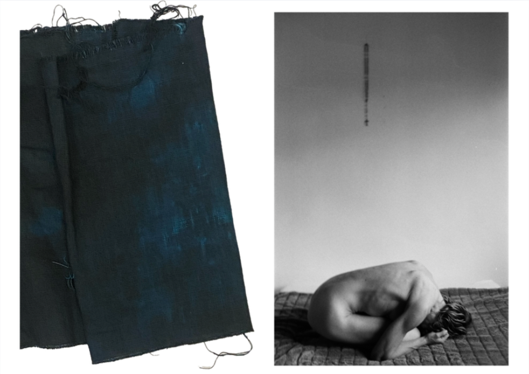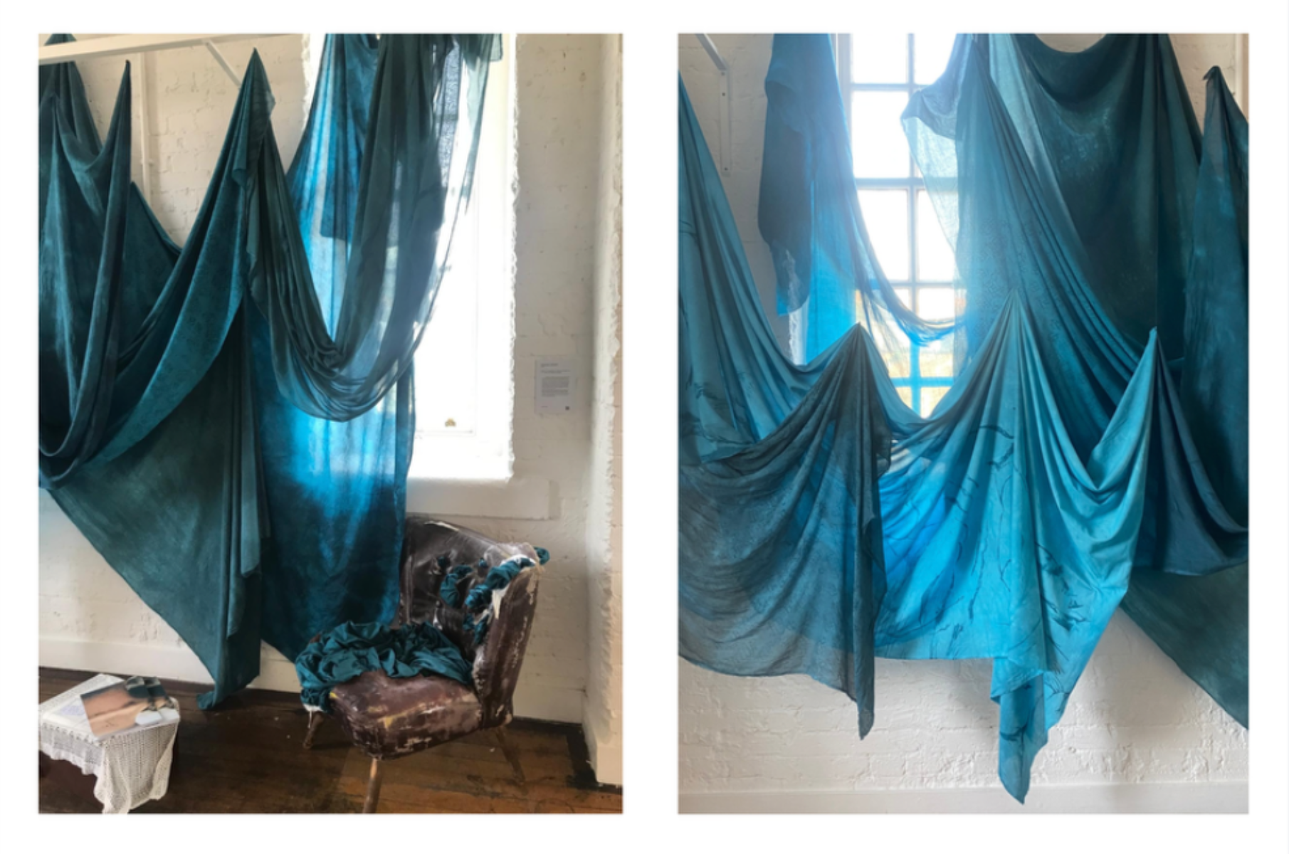‘Hermit’ is a tale of a young women’s silent battle with post-traumatic stress disorder that has been neglected by the medical system. The title Hermit refers to her living in solitude as religious discipline; immersed in suffering, in order to be reborn. The making has become a meditation, a nurse caring for her. The imperfections and subtleties of the dyeing process of the blue palette with the daylight shining through, convey a feeling of hope that exists within a time of melancholy. The fabric is infused with her presence. Erratic and fragmented prints of the body and lace, the texture is scarred into the material. A chair in disrepair, where the owner has frantically tried to patch up the damage. She is inviting you into her sanctuary, the diary extracts in the book aiding you to feel and experience with the young protagonist.