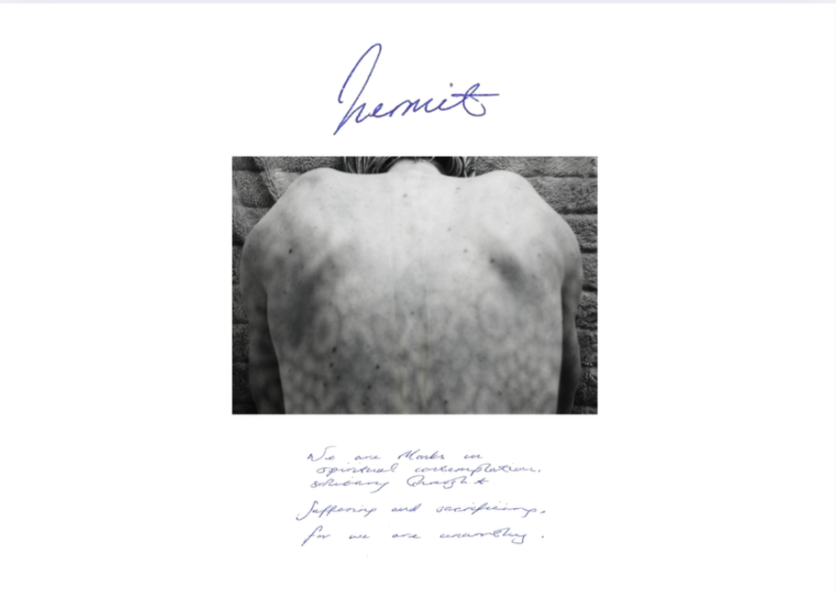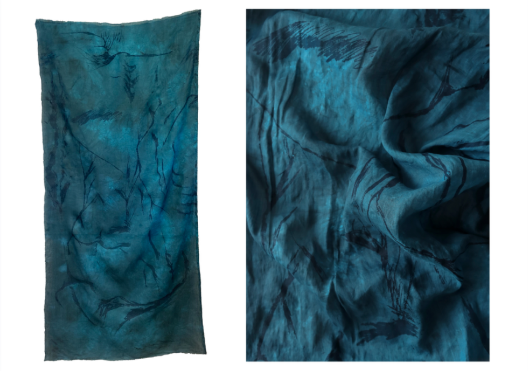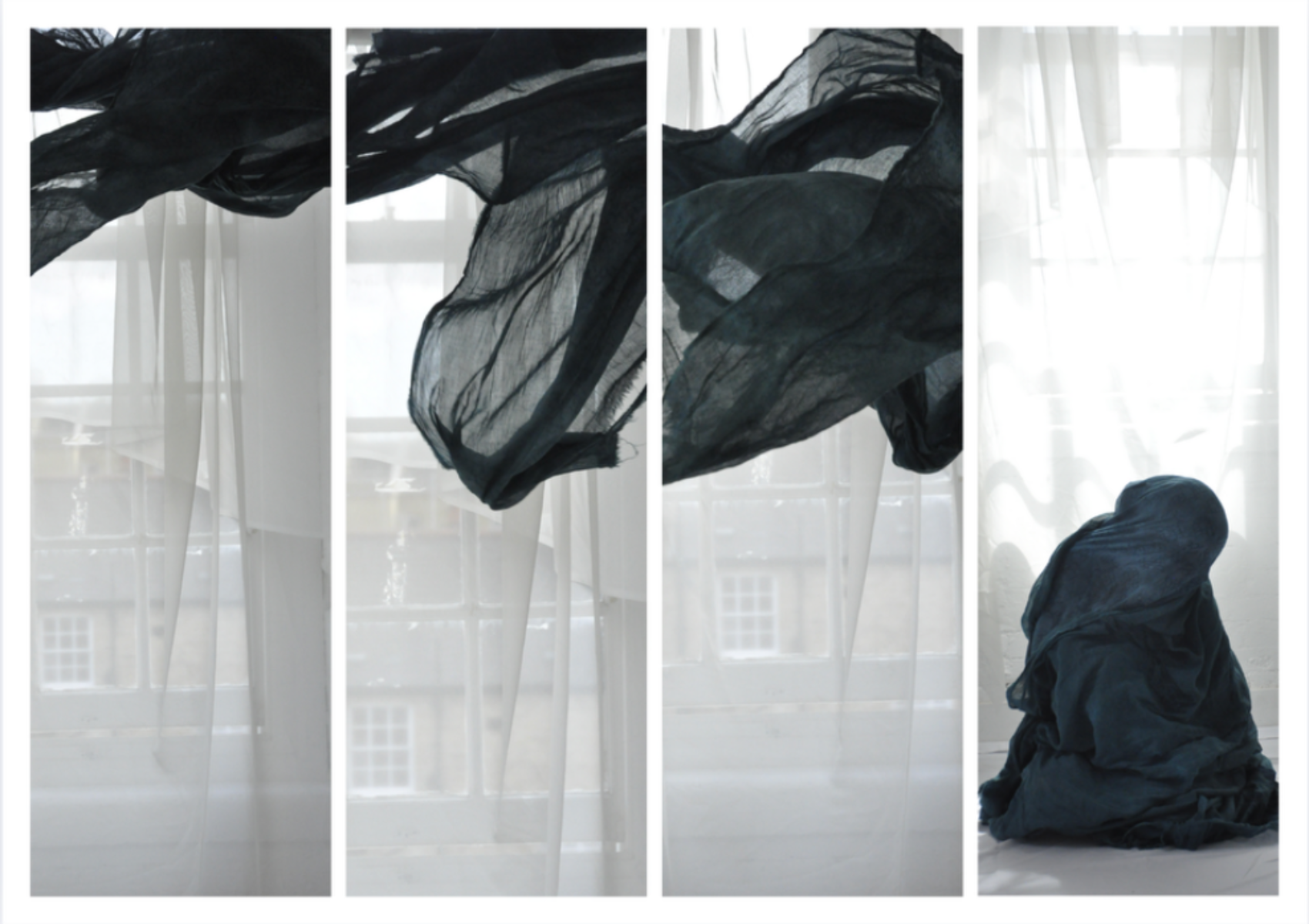 ‘Hermit’ is a tale of a young women’s silent battle with post-traumatic stress disorder that has been neglected by the medical system. The title Hermit refers to her living in solitude as religious discipline; immersed in suffering, in order to be reborn. The making has become a meditation, a nurse caring for her. The imperfections and subtleties of the dyeing process of the blue palette with the daylight shining through, convey a feeling of hope that exists within a time of melancholy. The fabric is infused with her presence. Erratic and fragmented prints of the body and lace, the texture is scarred into the material. A chair in disrepair, where the owner has frantically tried to patch up the damage. She is inviting you into her sanctuary, the diary extracts in the book aiding you to feel and experience with the young protagonist.