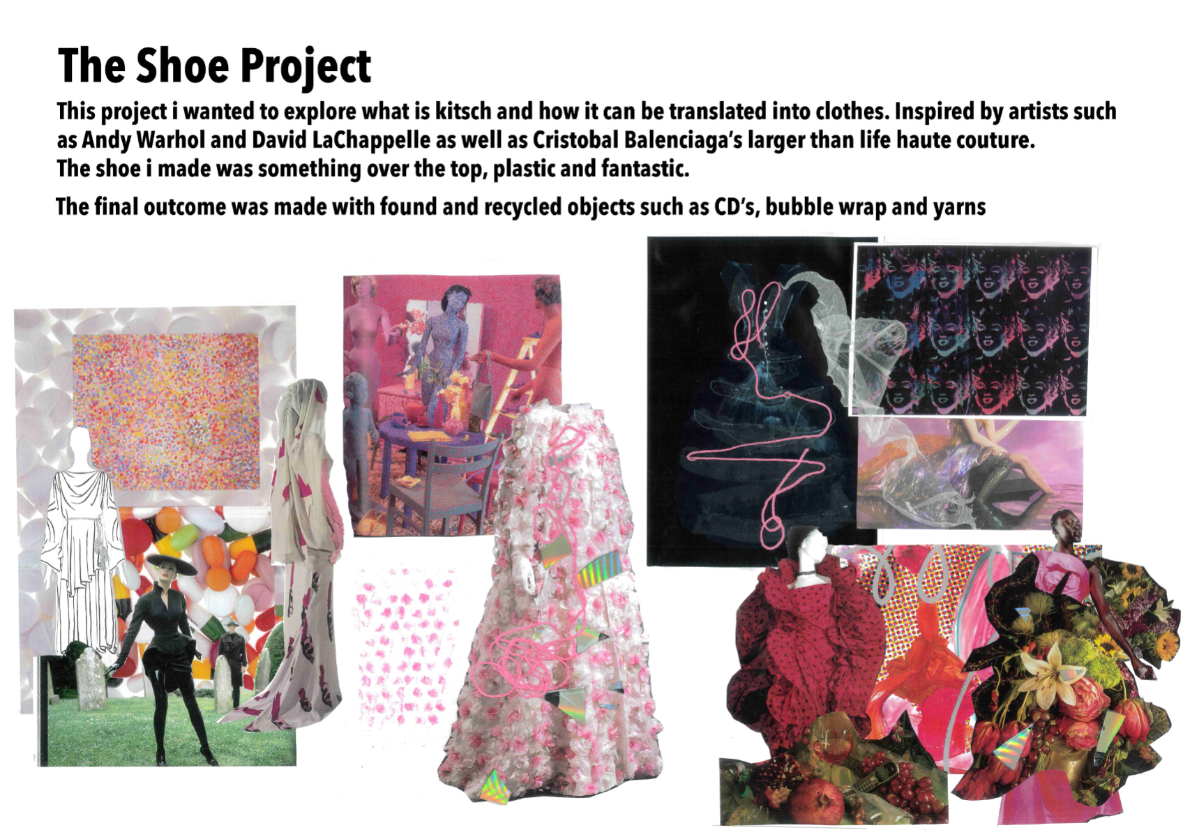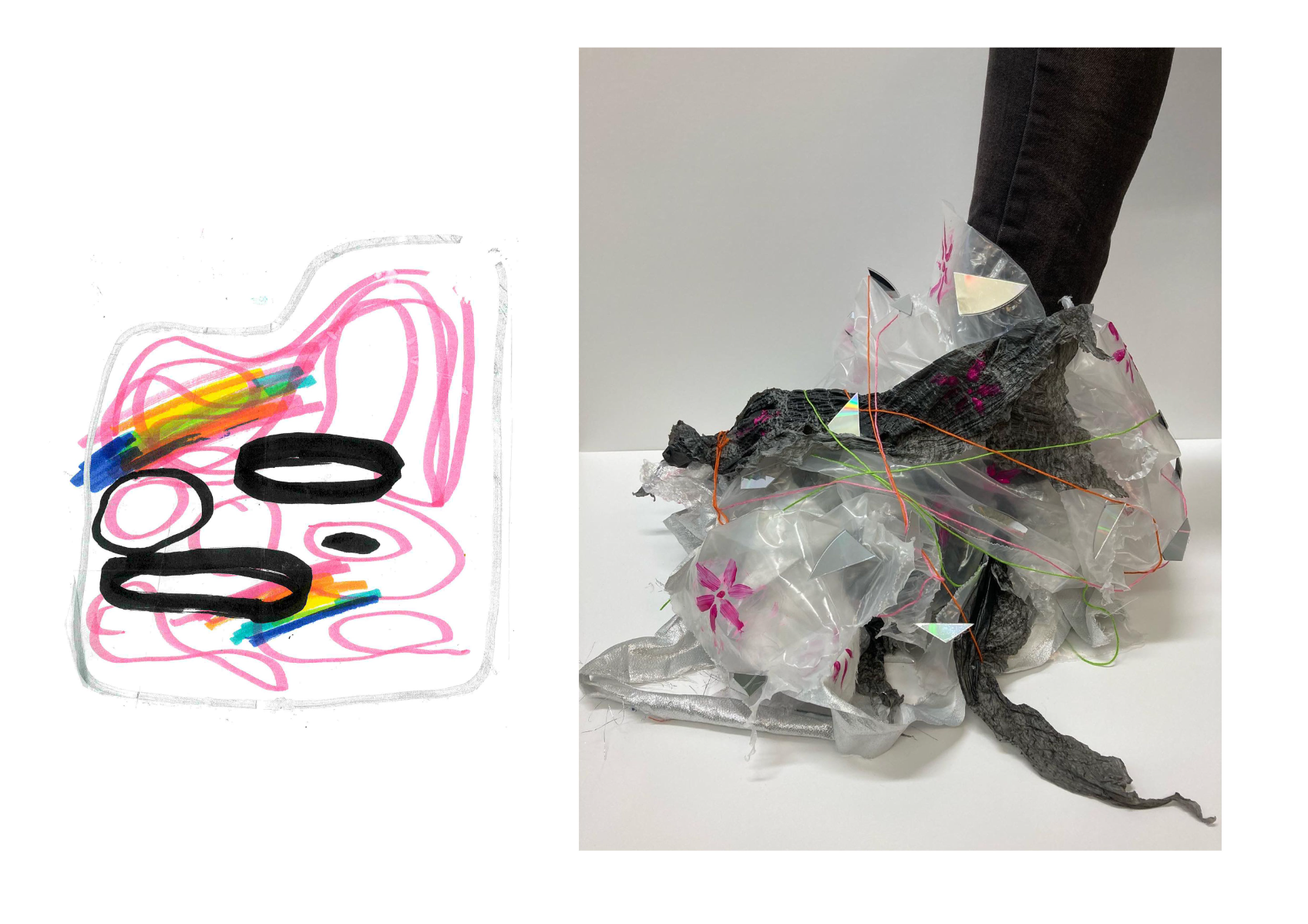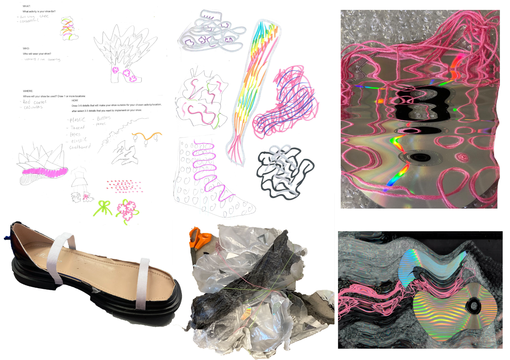 a day long project exploring shoe design. made using 100% upcycled materials