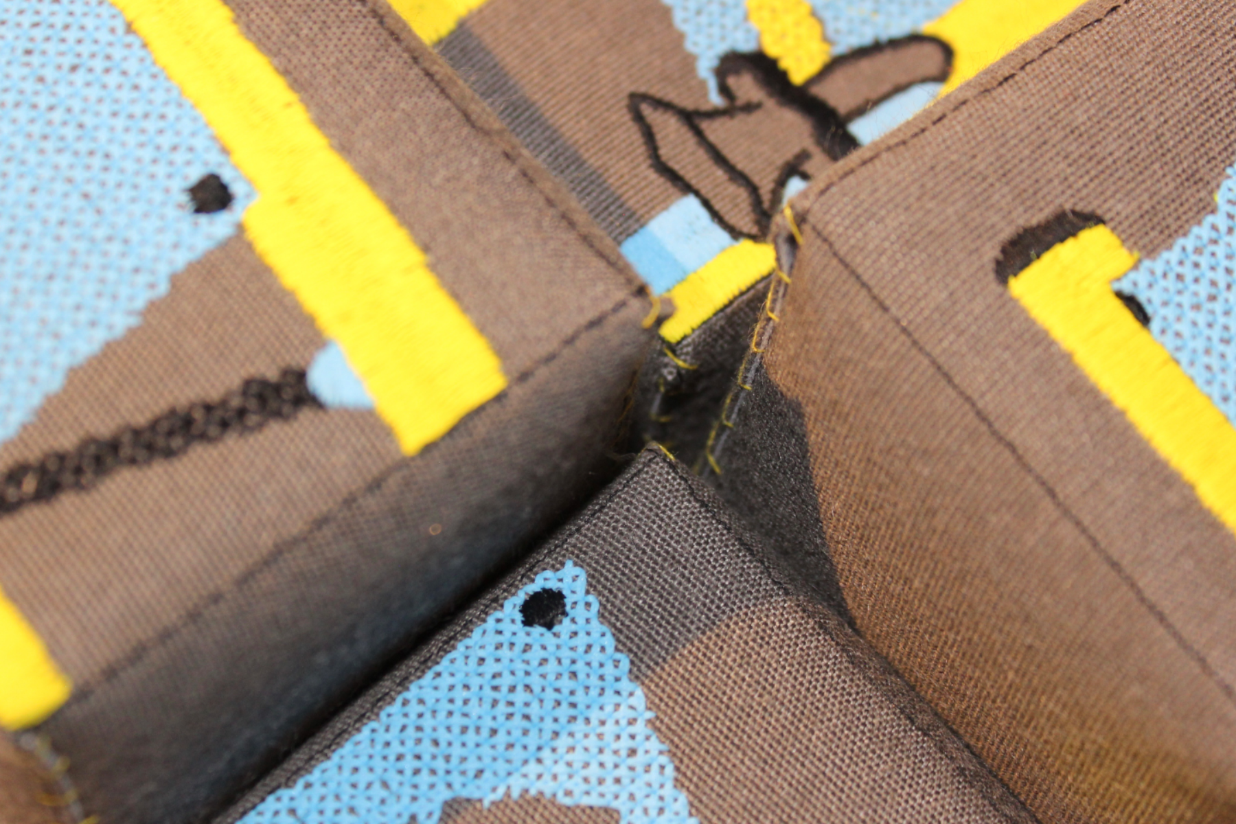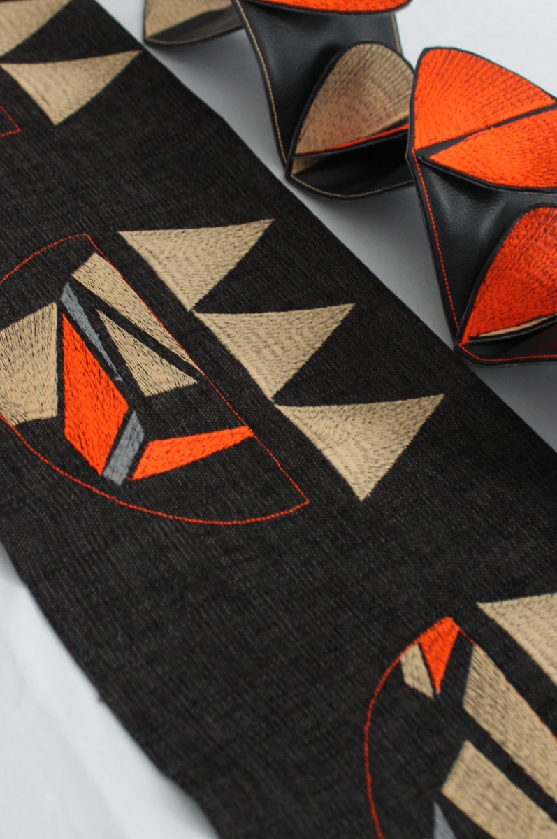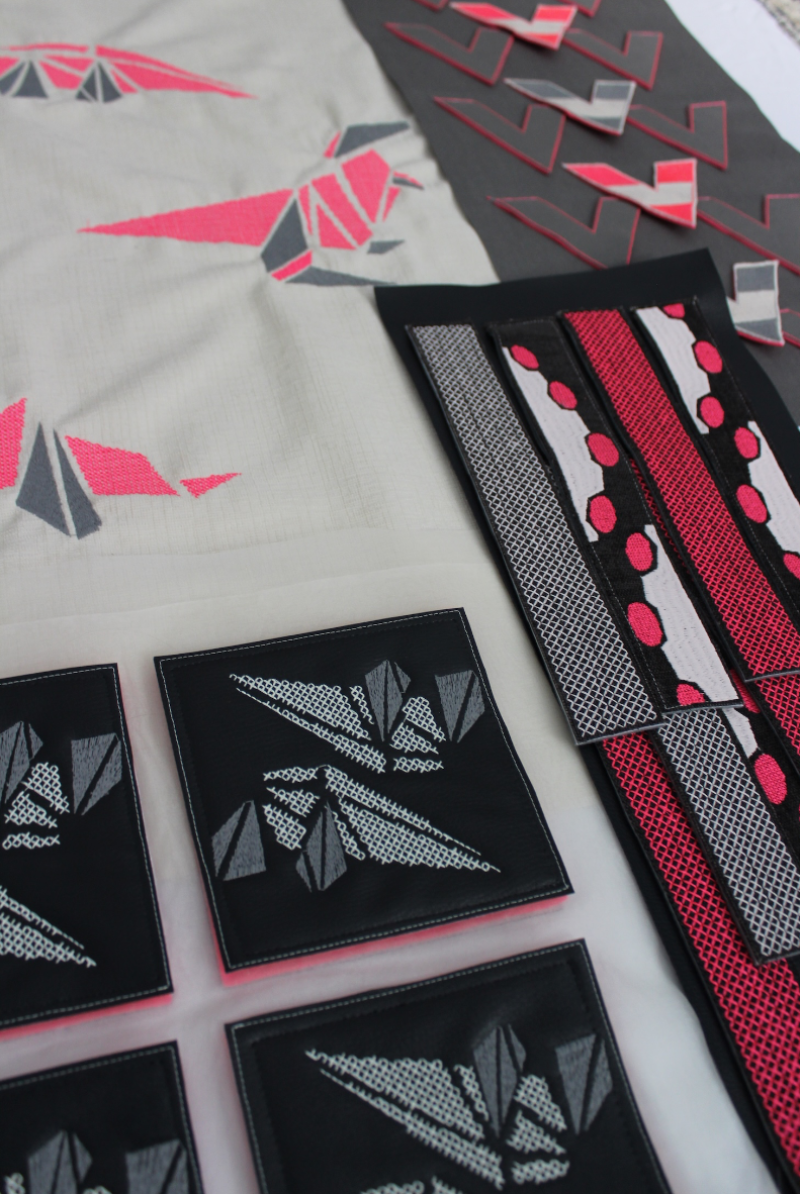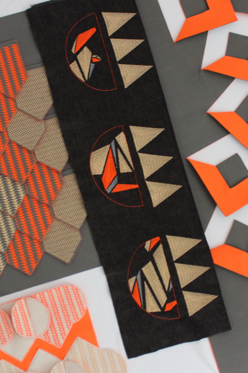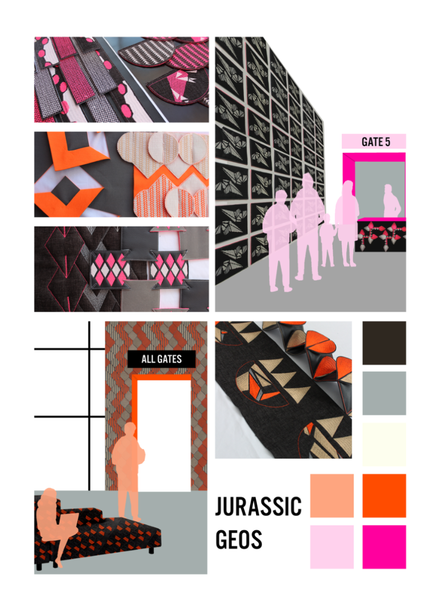 This project explores the ways in which geometric shapes can be used to create a contemporary collection which explores the role of graphic shapes in an interior space. The collection 'Jurassic Geos' has experimented with the role of layering and manipulated elements in order to create 3D aspects. As a result of this, the use of contrasting colours between neutrals and neons has allowed the different layers within the collection to be emphasised. Stitch has been incorporated throughout the collection to create texture within the pieces, however the use of CAD embroidery has allowed the graphic element to be conveyed. Therefore, the use of bold geometrics within this project has allowed me to incorporate 'Constructivist' influences.
