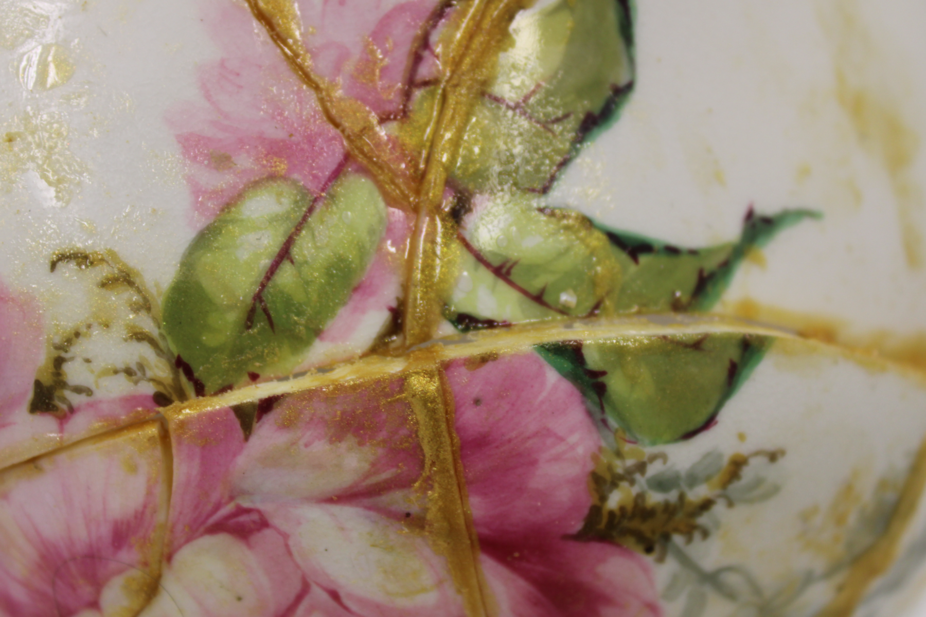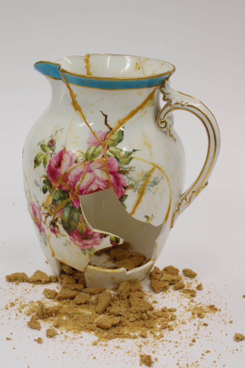 Ceramic jug with painted rose detail, glued back together post breaking with a hammer, using gold glue. Staged with a smashed packet of digestive biscuits. The image is a still from the performance 2023.