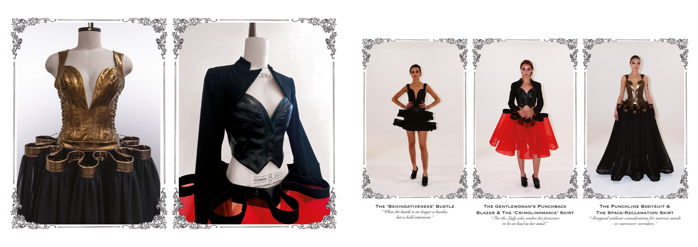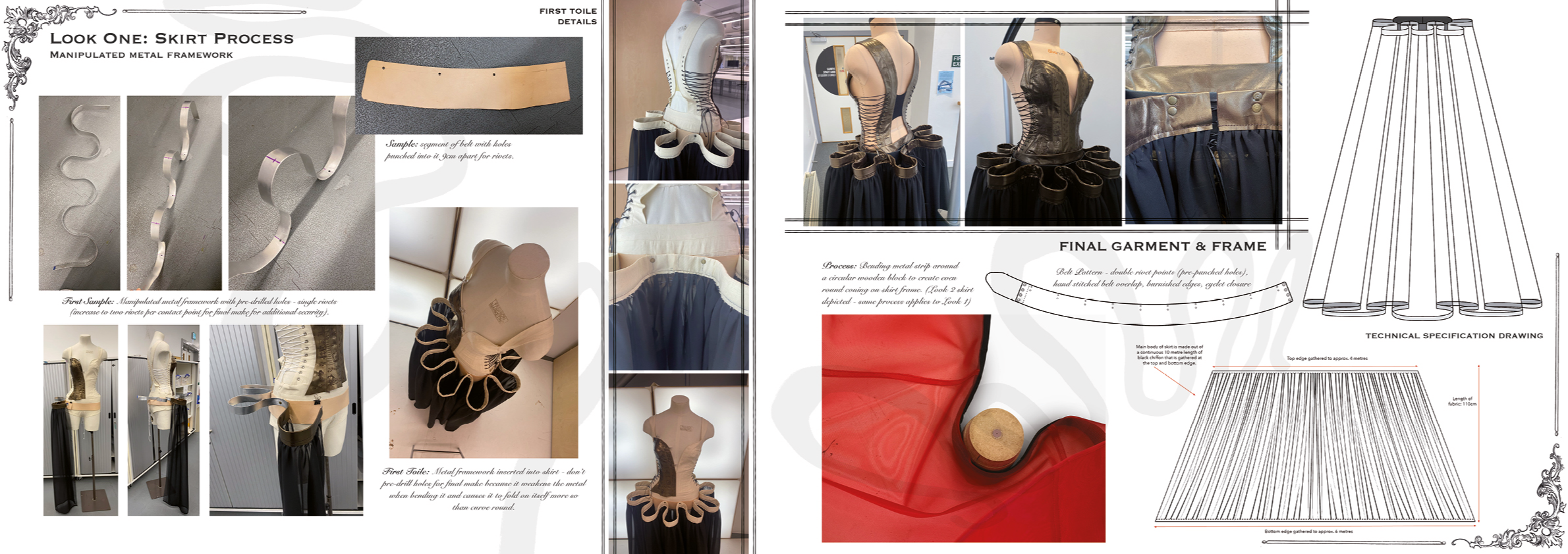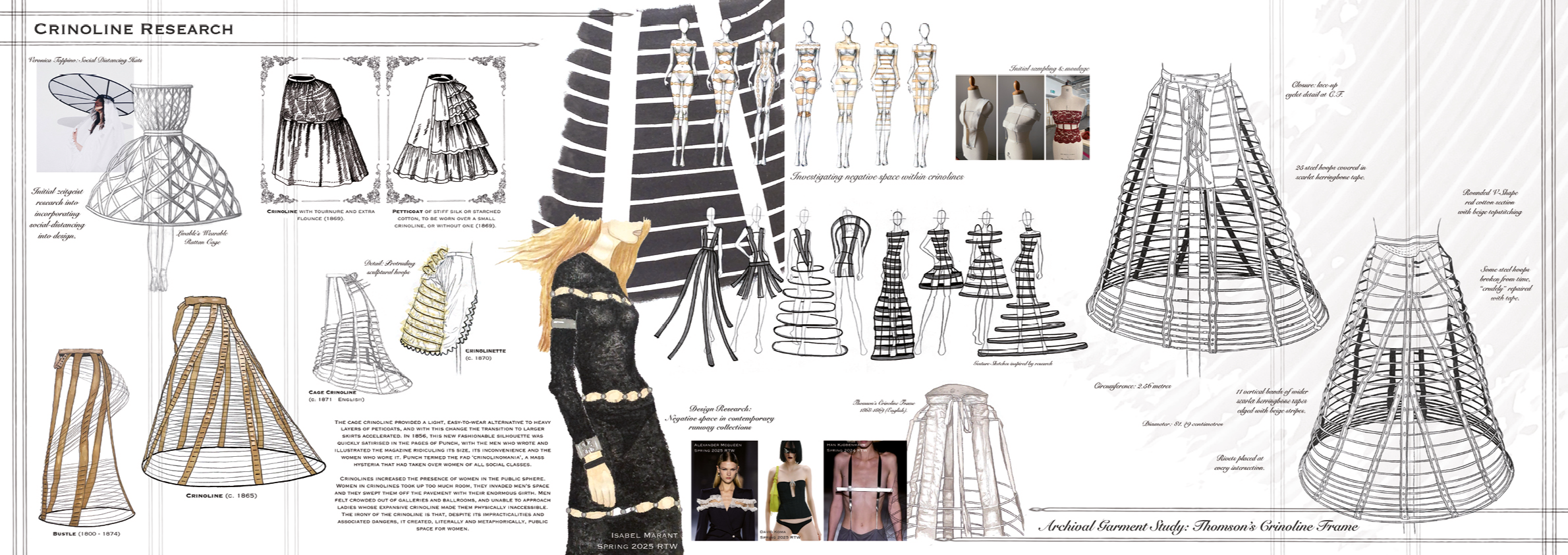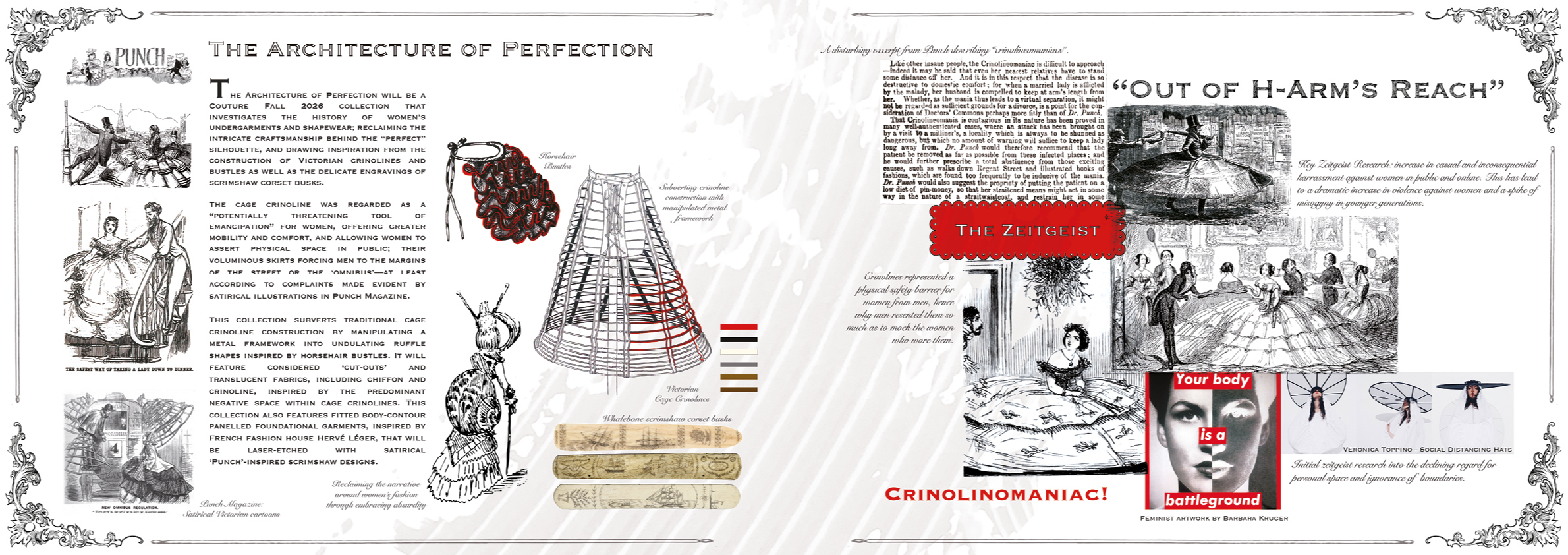 The Architecture of Perfection is a Couture A/W 2026 collection that investigates the history of women’s undergarments and shapewear; reclaiming the intricate craftsmanship behind the “perfect” silhouette, drawing inspiration from the construction of Victorian crinolines and bustles as well as the delicate engravings of scrimshaw corset busks. The cage crinoline was regarded as a “potentially threatening tool of emancipation” for women, offering greater mobility and comfort, and allowing women to assert physical space in public; their voluminous skirts forcing men to the margins of the street or the ‘omnibus’—at least according to complaints made evident by satirical illustrations in Punch Magazine. This collection subverts traditional cage crinoline construction by manipulating a metal framework into undulating ruffle shapes inspired by horsehair bustles. It features considered ‘cut-outs’ and translucent fabrics, including chiffon and crinoline, inspired by the predominant negative space within cage crinolines. This collection also features fitted body-contour panelled foundational garments that will be laser-etched with satirical ‘Punch’-inspired scrimshaw designs.