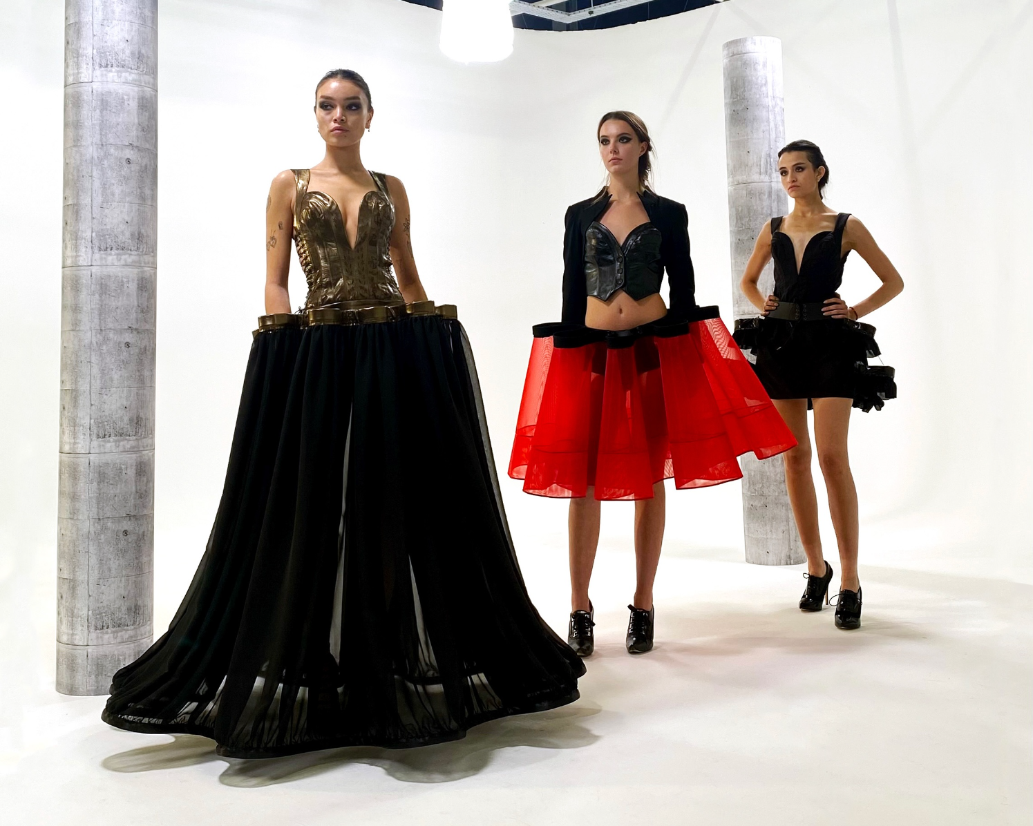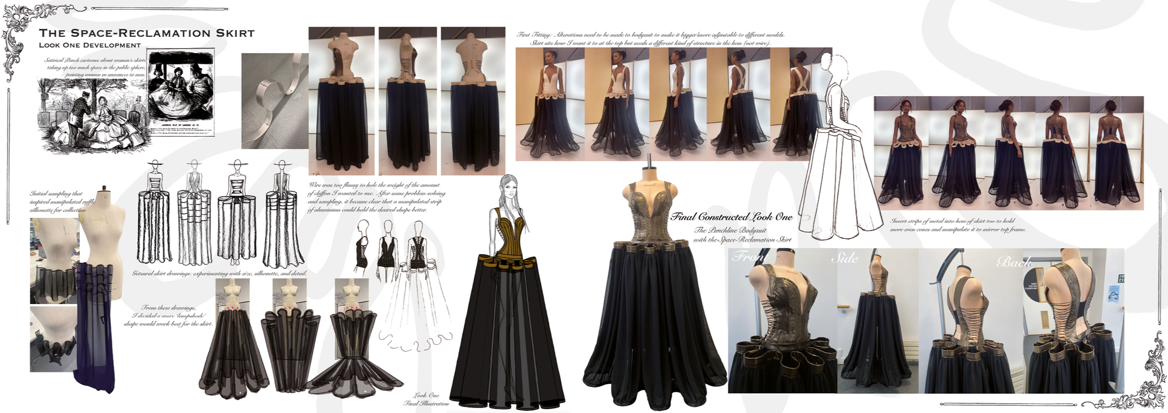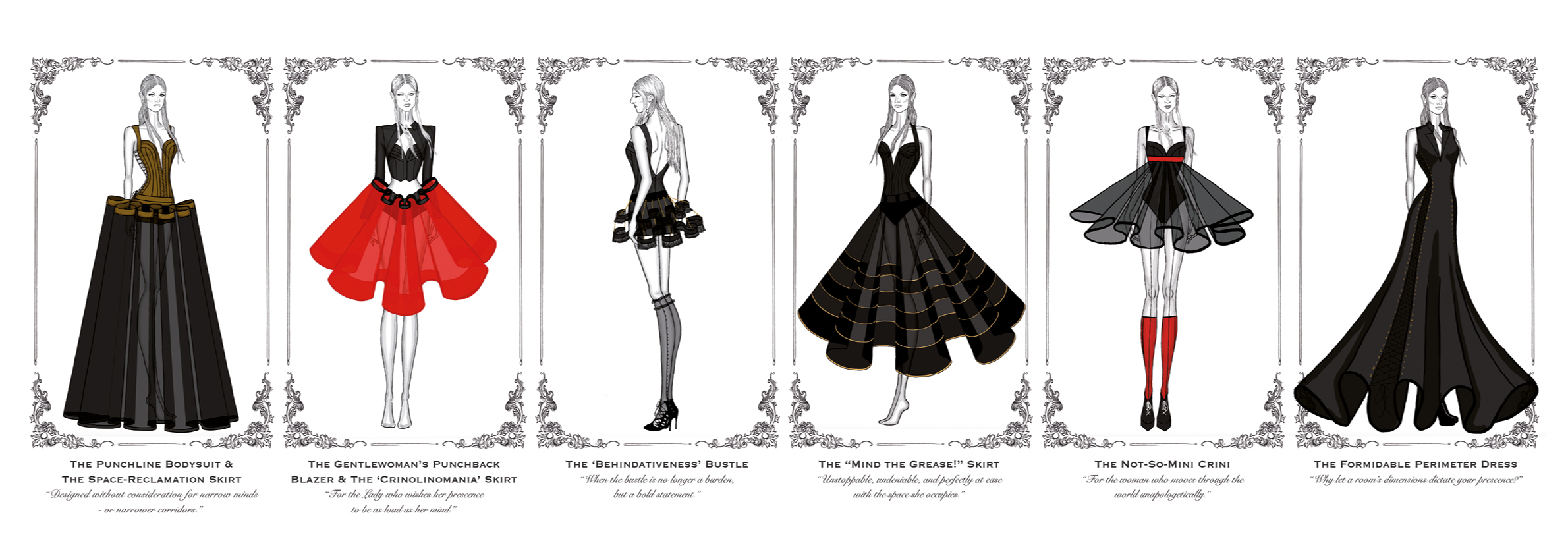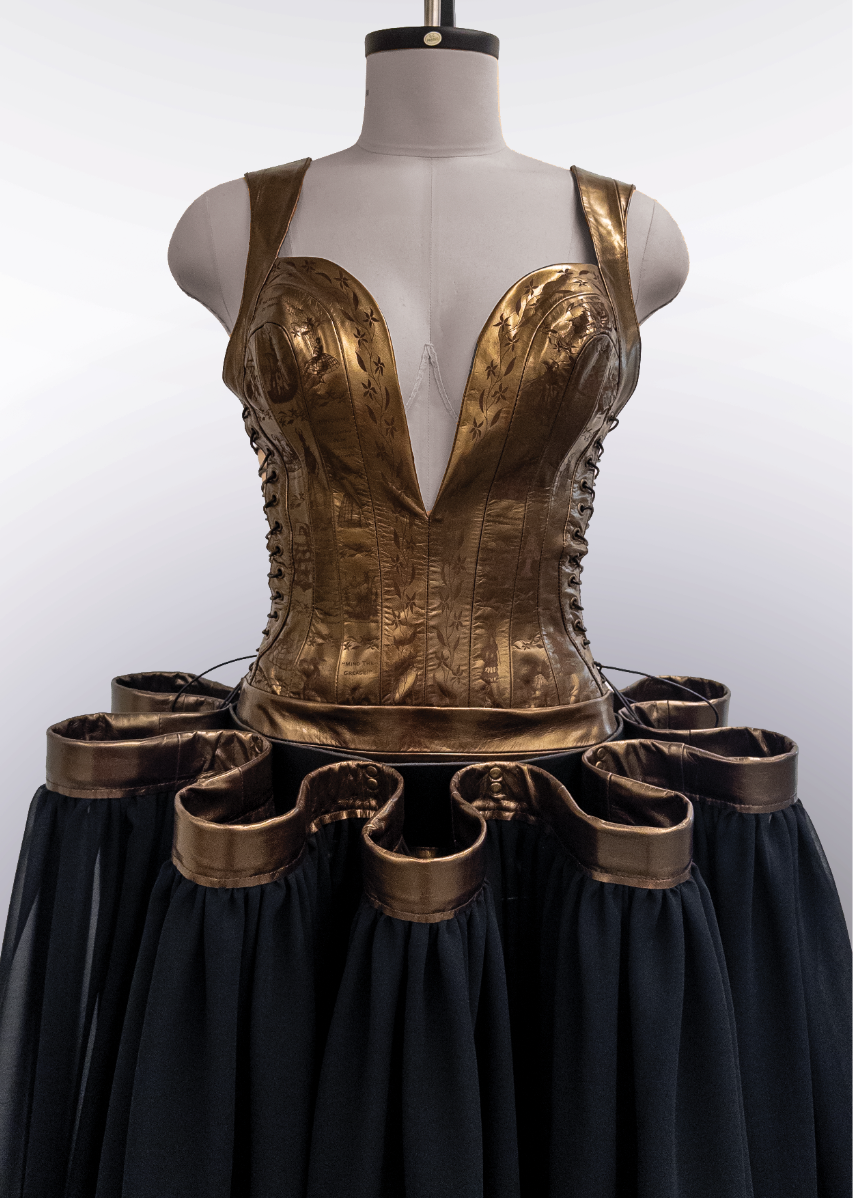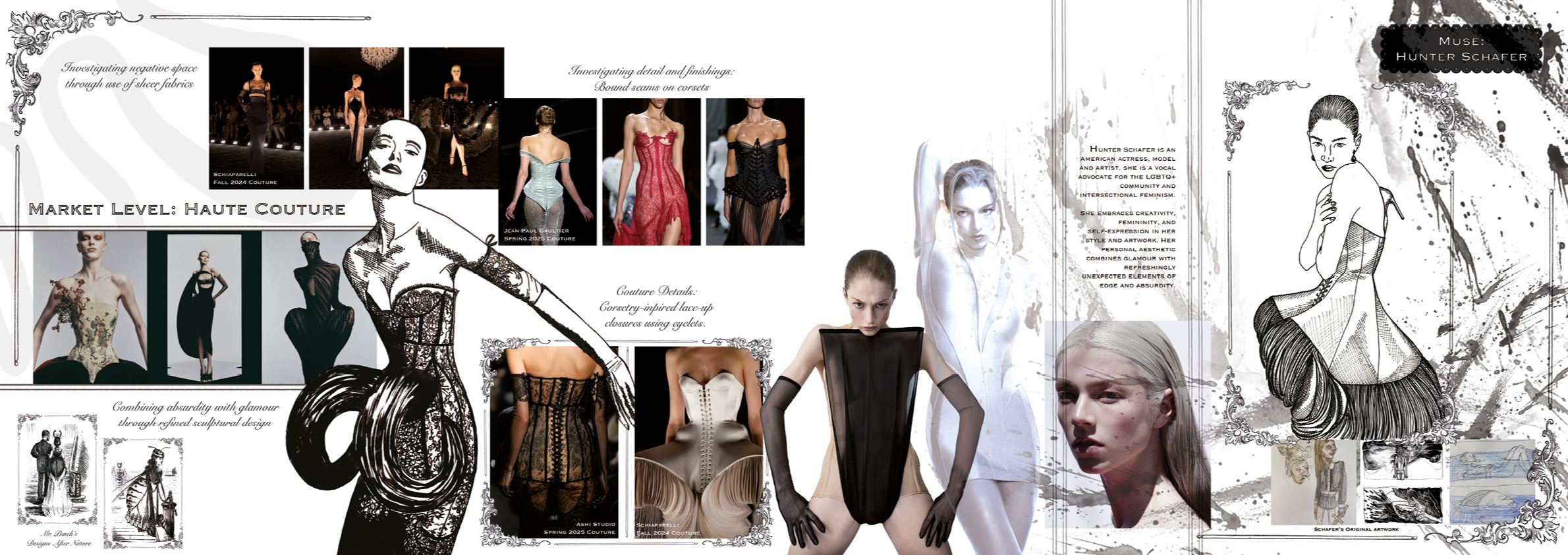 The Architecture of Perfection is a Couture A/W 2026 collection that investigates the history of women’s undergarments and shapewear; reclaiming the intricate craftsmanship behind the “perfect” silhouette, drawing inspiration from the construction of Victorian crinolines and bustles as well as the delicate engravings of scrimshaw corset busks. The cage crinoline was regarded as a “potentially threatening tool of emancipation” for women, offering greater mobility and comfort, and allowing women to assert physical space in public; their voluminous skirts forcing men to the margins of the street or the ‘omnibus’—at least according to complaints made evident by satirical illustrations in Punch Magazine. This collection subverts traditional cage crinoline construction by manipulating a metal framework into undulating ruffle shapes inspired by horsehair bustles. It features considered ‘cut-outs’ and translucent fabrics, including chiffon and crinoline, inspired by the predominant negative space within cage crinolines. This collection also features fitted body-contour panelled foundational garments that will be laser-etched with satirical ‘Punch’-inspired scrimshaw designs.