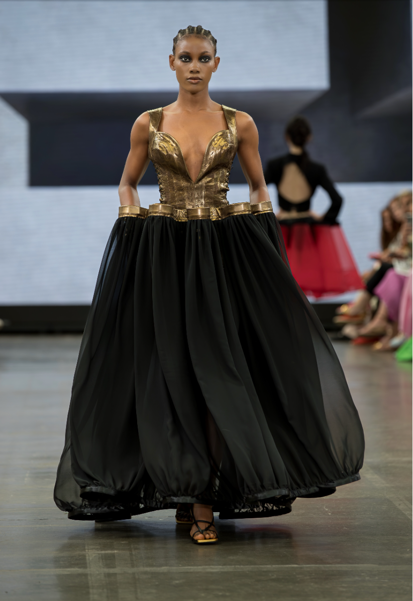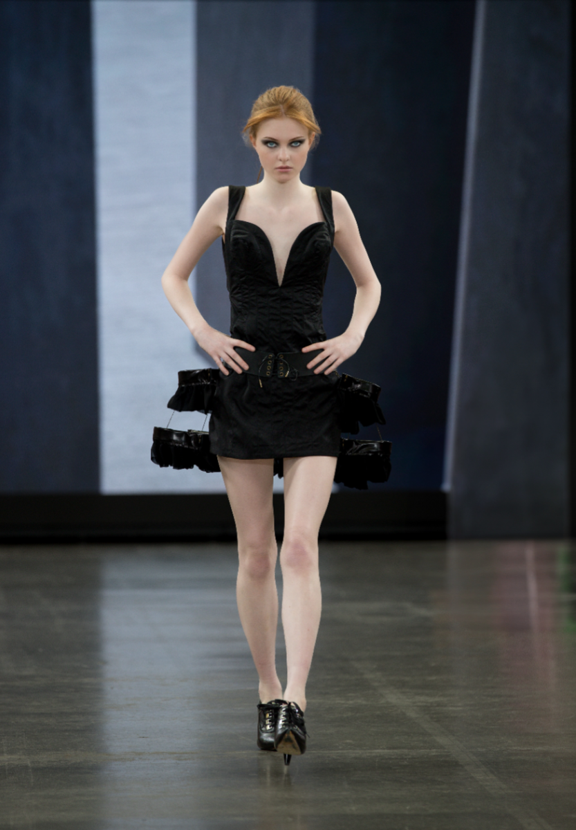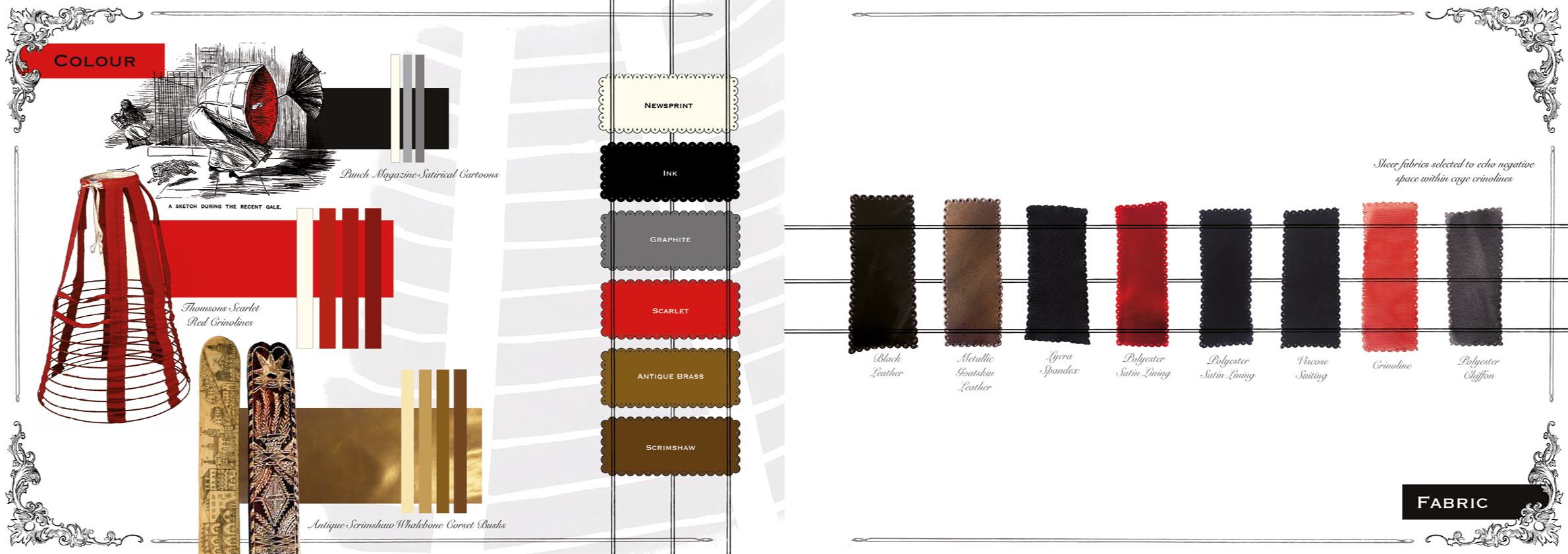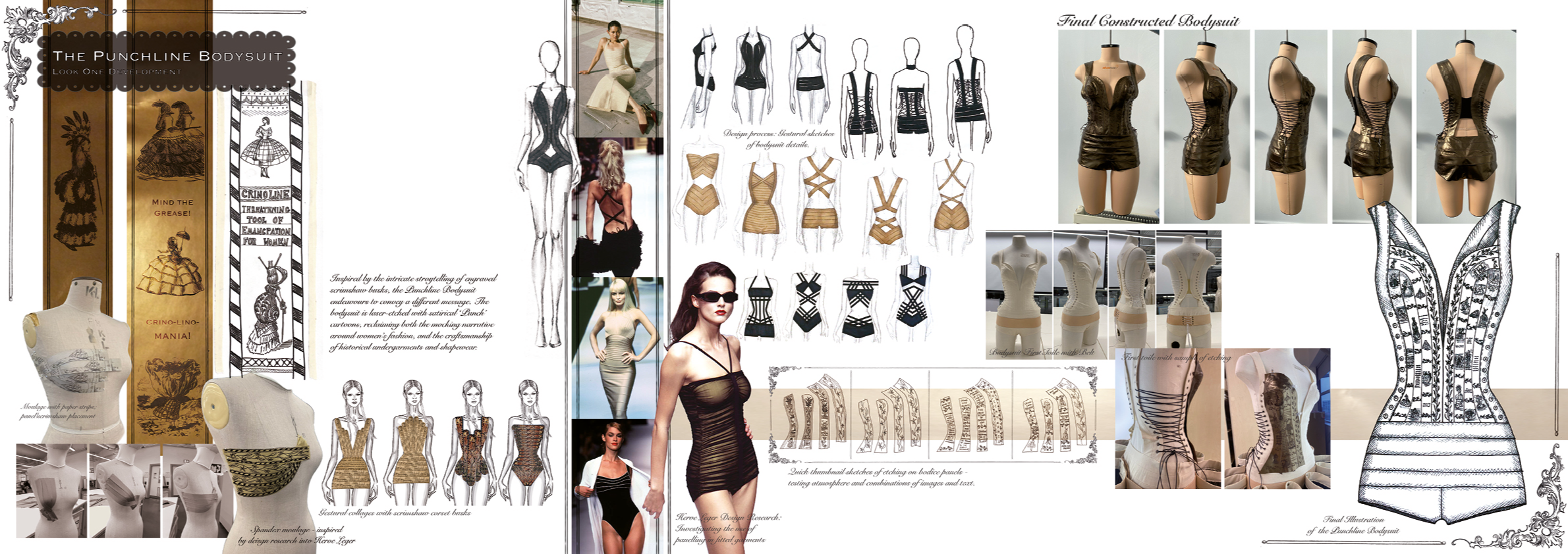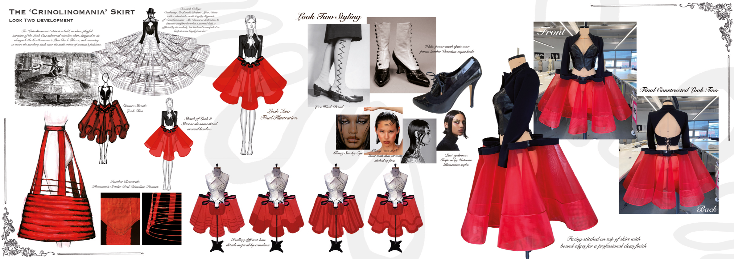 The Architecture of Perfection is a Couture A/W 2026 collection that investigates the history of women’s undergarments and shapewear; reclaiming the intricate craftsmanship behind the “perfect” silhouette, drawing inspiration from the construction of Victorian crinolines and bustles as well as the delicate engravings of scrimshaw corset busks. The cage crinoline was regarded as a “potentially threatening tool of emancipation” for women, offering greater mobility and comfort, and allowing women to assert physical space in public; their voluminous skirts forcing men to the margins of the street or the ‘omnibus’—at least according to complaints made evident by satirical illustrations in Punch Magazine. This collection subverts traditional cage crinoline construction by manipulating a metal framework into undulating ruffle shapes inspired by horsehair bustles. It features considered ‘cut-outs’ and translucent fabrics, including chiffon and crinoline, inspired by the predominant negative space within cage crinolines. This collection also features fitted body-contour panelled foundational garments that will be laser-etched with satirical ‘Punch’-inspired scrimshaw designs.
