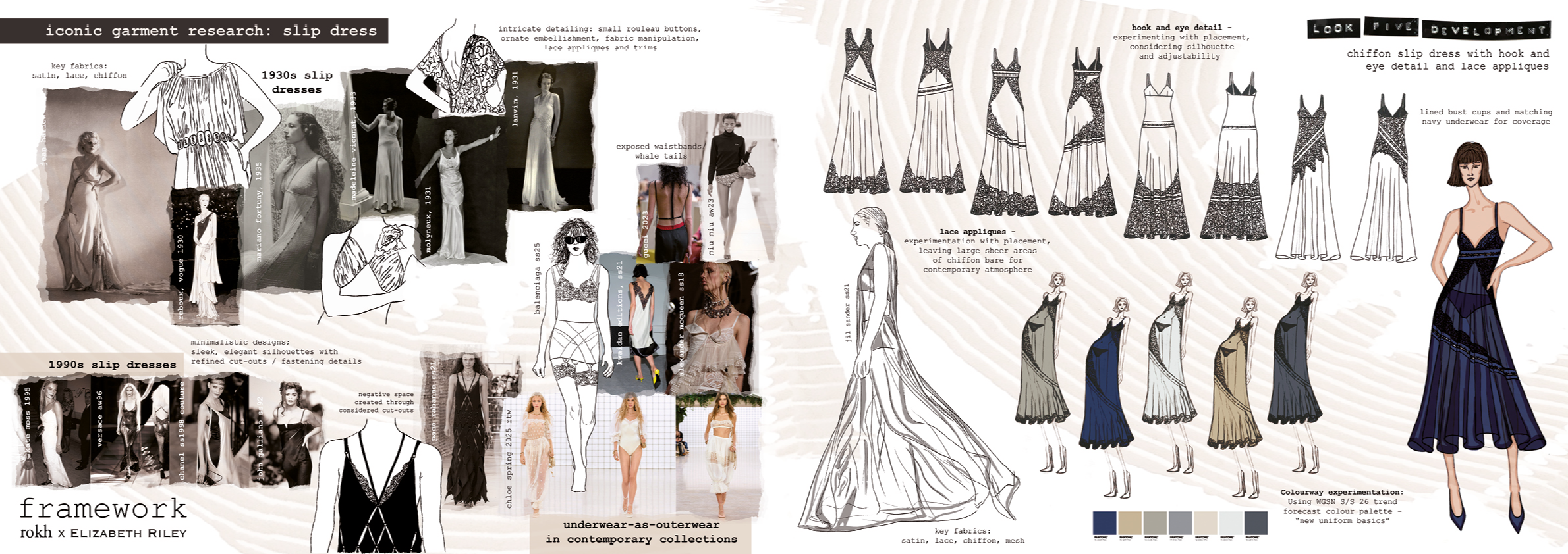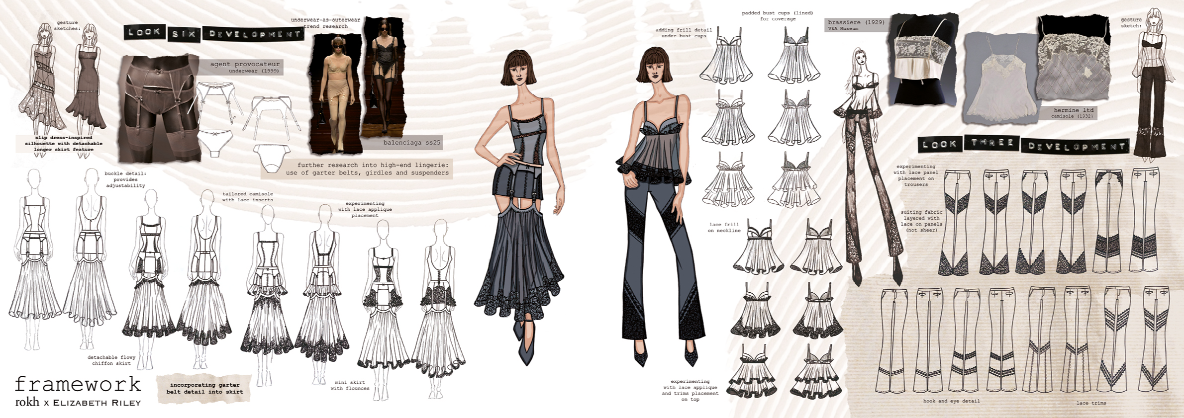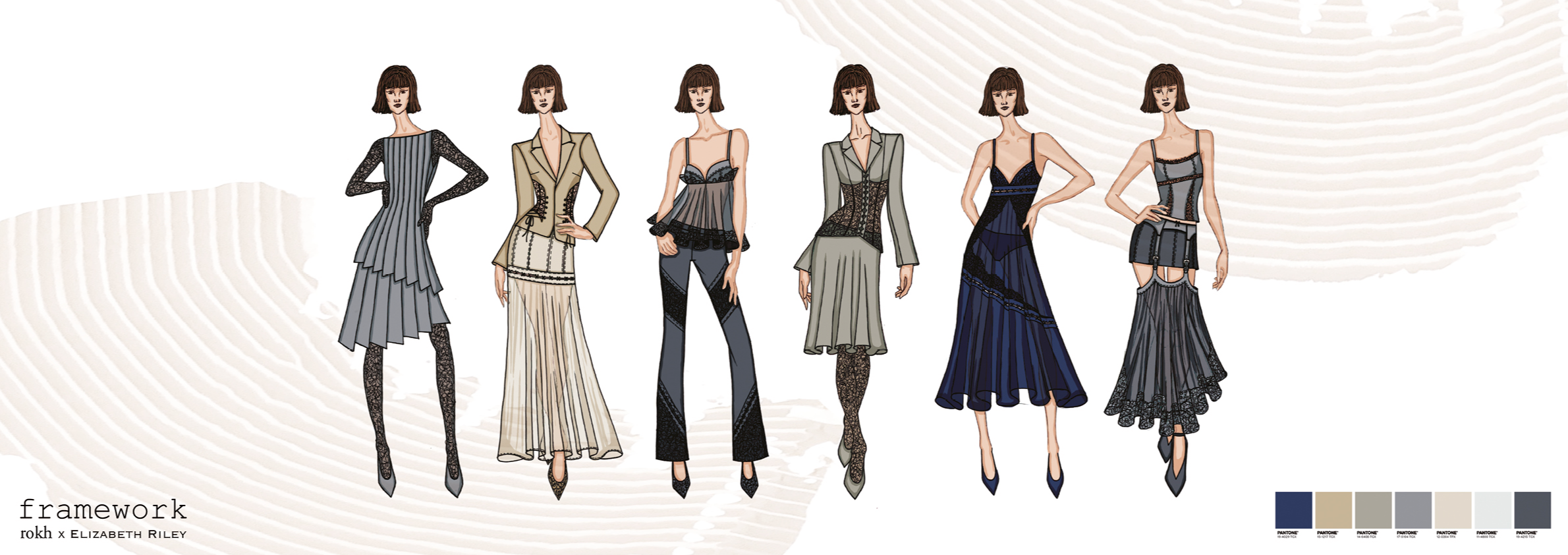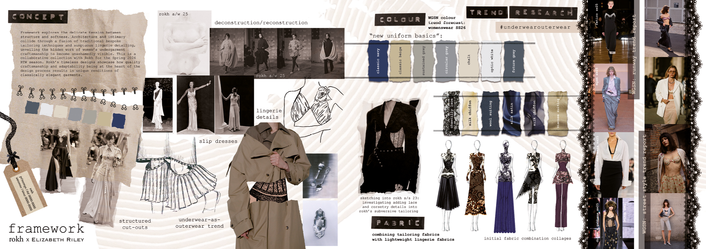 Framework explores the delicate tension between structure and softness. Architecture and intimacy collide through a fusion of traditional bespoke tailoring techniques and sumptuous lingerie detailing, unveiling the hidden work of women’s undergarment craftsmanship to become unashamedly visible. This is a collaborative collection with Rokh for the Spring 2026 RTW season. Rokh’s timeless designs showcase how quality craftsmanship and adaptability being at the heart of the design process results in unique renditions of classically elegant garments.