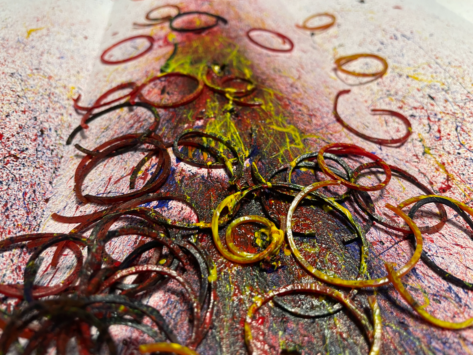 This childish-looking art is embedded with the remnant of pressure, stress, and all the bad things that students have to deal with to fit in the social norms established by the school or what are called "rules". Every school has rules that are created to teach students to be disciplined and to become qualified citizens in society. However, some rules are too strict or unnecessary in modern times. It can create more trouble than benefits. Many students may be able to tolerate and deal with it. But everybody has a limit. Like a rubber band that has flexibility and becomes an object that children use as a toy, a childhood game, accessory, and handcraft. But if the push and pull pressure was heavily used, It will snap and break apart, spreading pain and damage to everything around them without exception. It is the artwork of students' mental & physical that is shattered into pieces by the simple thing known as the "rules" that will become their lifelong scar forever.