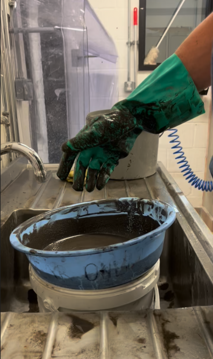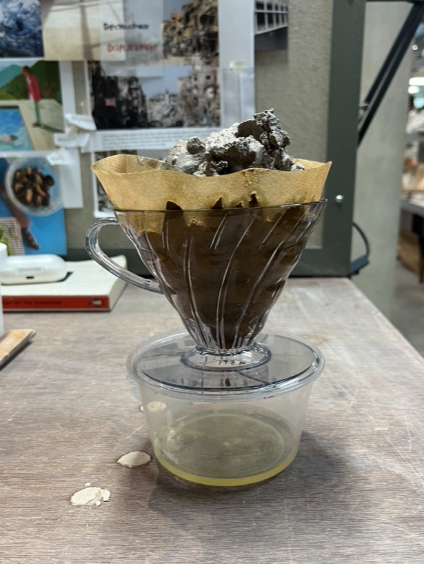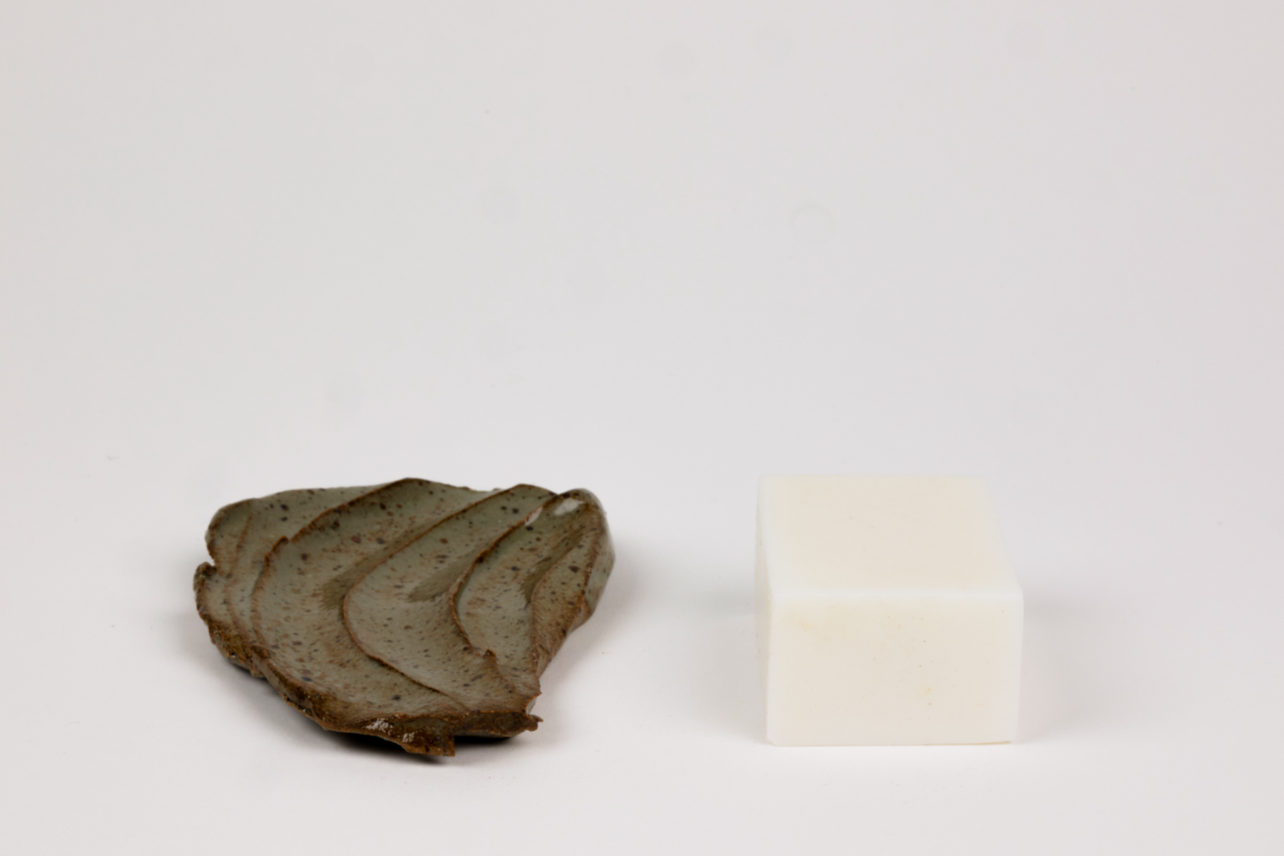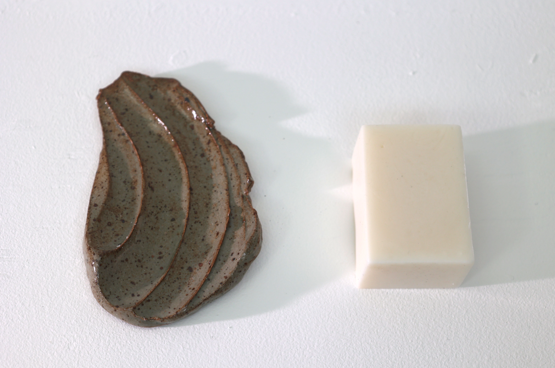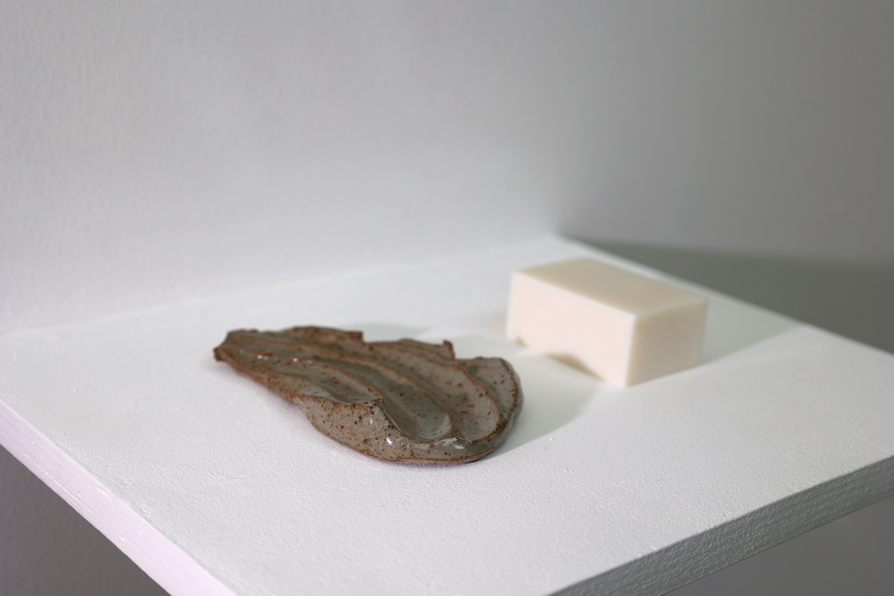 Duet is a bar of soap and a dish to hold it, both made with ash left in the wake of wildfires in Evia, Greece in the height of summer, 2024. I washed the ash, skimmed off the caustic lye that bubbles out at first and, ordinarily discarded, used it to make this bar of soap. With the dried remnants I make a glaze. It pools in the finger marks of a momentary act. Performed with the ease of a jazz musician, I am implicated permanently though the intense heat of the kiln. Yet unused, a rectangle of soap, willing us to remain in the present, smells only of its composite materials. Its cut edges are an invitation: wash, smooth its corners between your palms and leave the traces of your hand in mine.
