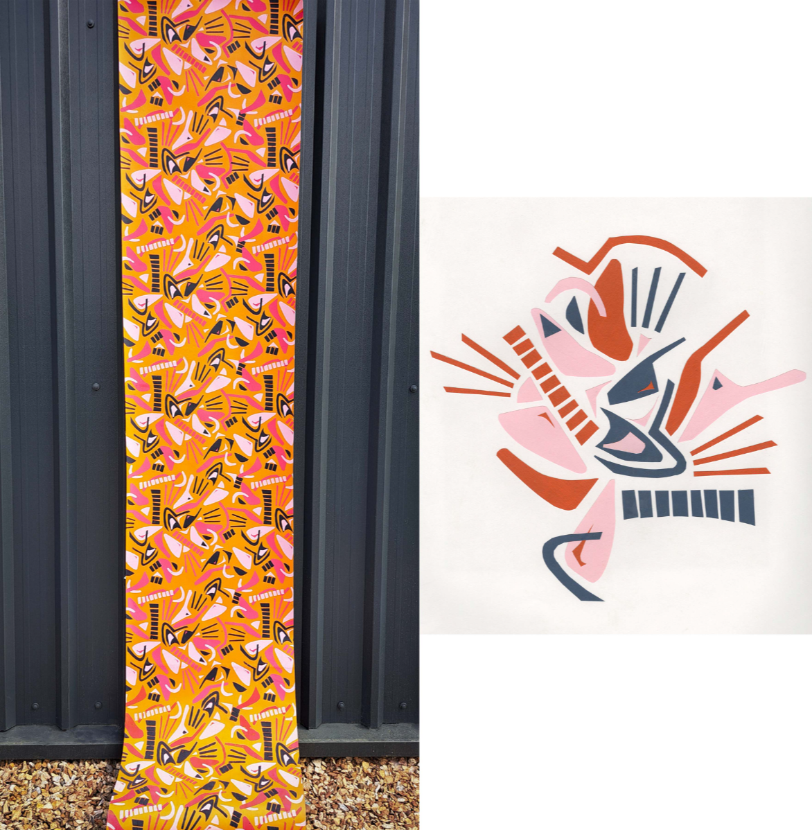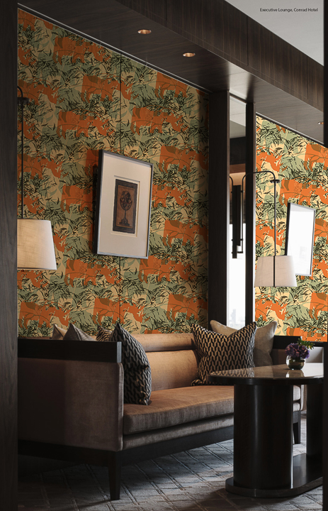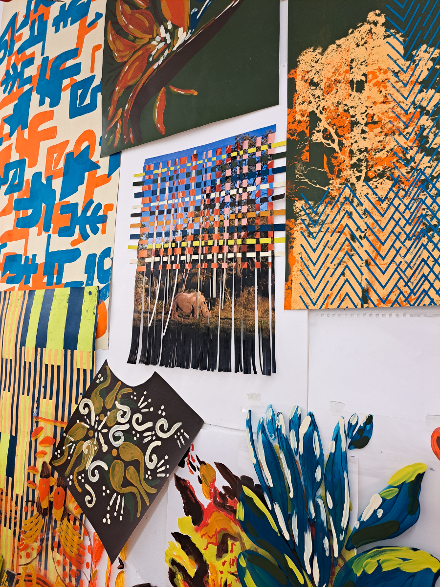 ‘Untamed Africa’ is an interiors collection that draws on my South African heritage and the beauty of the African bush. The collection brings together screen-printed wallpapers, digital weaves, digitally printed fabrics, and innovative hard surface samples to create a cohesive yet striking collection. Inspired by the anticipation of searching for wildlife in their natural environment, I explored themes of concealment and revelation through layering and distortion in both prints and weaves. This reflects how animals exist subtly within the landscape—hidden yet ever-present. My design approach is rooted in abstraction, where organic forms are reimagined through a contemporary lens. I drew not only from the natural world, but also from South African cultural practices such as beading and basket weaving to inform my geometric motifs. Research of South Africa’s complex history ran parallel to an exploration of its emerging design scene. I was particularly drawn to the bold style of contemporary South African design— which has often been overshadowed by the countries dark past. Through the use of graphic imagery, tactile surfaces, and a considered yet vibrant colour palette, this collection seeks to reframe South Africa’s past with optimism and respect. Material exploration played a central role in the development of the collection. I combined traditional techniques with contemporary processes to create surfaces that are texturally rich. The use of raffia in the weaves introduces a sense of place and authenticity, while the juxtaposition of materials—such as resin-coated paper weaves and the pairing of tufting with wood—brings a sculptural, unexpected dimension to the work.