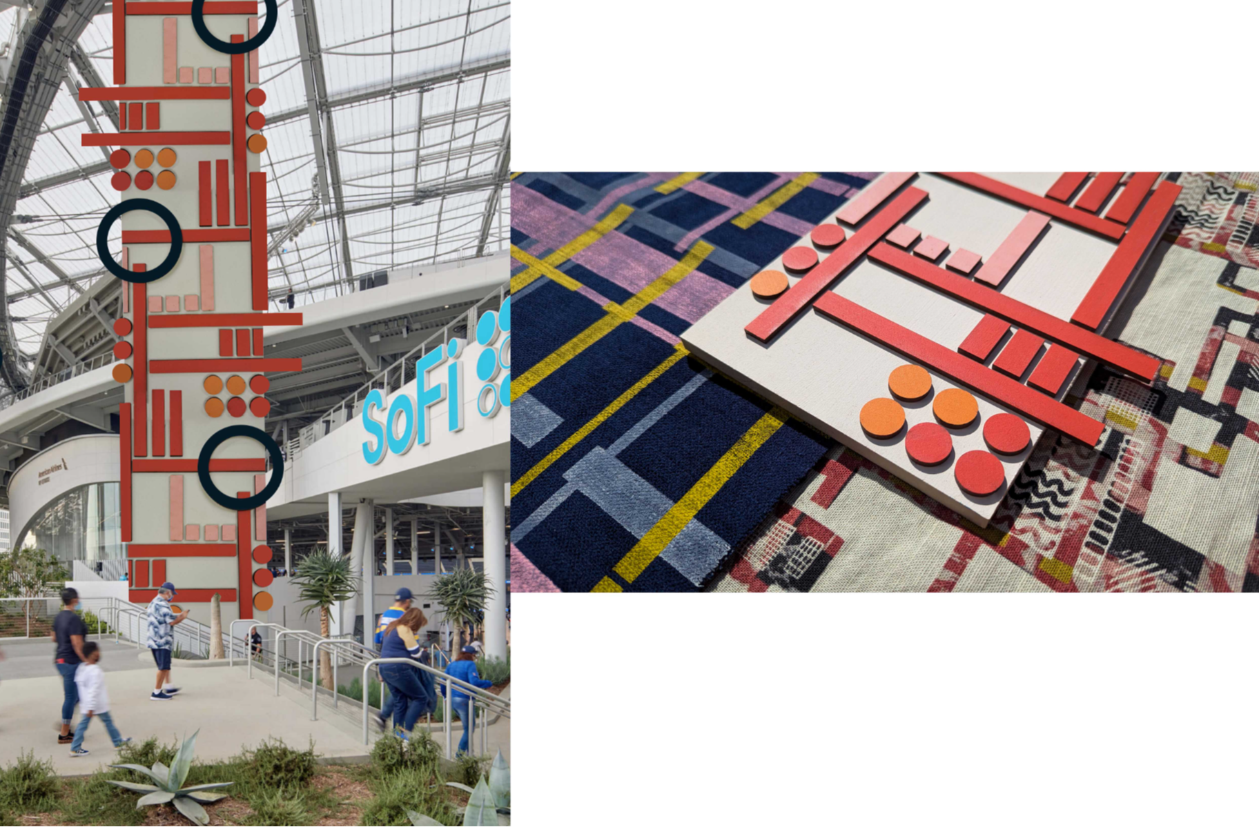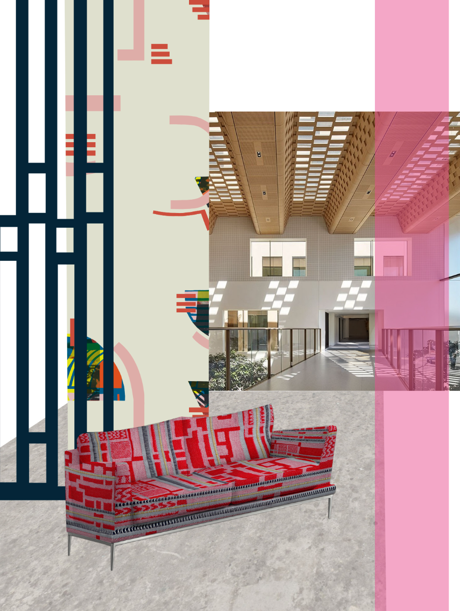 My graduate collection ‘In Motion’ is a vibrant celebration of energy and movement. ‘In Motion’ is an interiors collection featuring screen and digitally printed wallpapers, fabrics, tiles, and digital weaves. The collection is designed for leisure spaces, specifically gyms, changing rooms, and communal areas and is set within the hypothetical context of the 2028 Los Angeles Olympic Village. With the fitness industry continuing to grow post-pandemic, it is essential to design welcoming and inclusive environments. Research shows that 51% of UK gym-goers find fitness centres intimidating. This collection responds to that concern by creating spaces that are both energising and inviting. The concept of ‘In Motion’ was inspired by my visit to the 2024 Paris Paralympic Games, as well as my personal love of sport, particularly tennis and skateboarding. The bold graphic branding used throughout the Paralympics, on courts, signage, and merchandise, sparked the development of dynamic geometric motifs in my designs. I explored how colour, pattern, and form can reflect energy, movement, and excitement. The collection balances structured elements like wood and tiling with the softness of woven and printed textiles, creating an environment that feels luxurious yet playful. A vibrant, uplifting colour palette and abstract designs convey the joy I experienced at the Games. Accessibility is central to the project, as the target audience includes Paralympians and people with disabilities. With 24% of the UK population identifying as disabled (UK Government), it is vital to raise the profile of inclusive design. My good friend is a wheelchair user and another friend of mine competes at a high level in visually impaired tennis. My personal connection makes it even more important for me to research accessibility as I have seen first-hand how frustrating it can be when this isn’t well considered in design. I have made thoughtful design choices to enhance sensory engagement, for example, incorporating bright colours and graphic patterns that are more easily seen by people with sight loss or those with colour blindness. Using the laser cutter and puff binder allowed me to create raised and embossed textures to help visually impaired people feel the patterns instead, without compromising on the aesthetics of the overall collection. By considering these aspects in my designs, ‘In Motion’ is an interiors collection that can be enjoyed by all. vimeo link: https://vimeo.com/1081658131/9ae8f19f5a