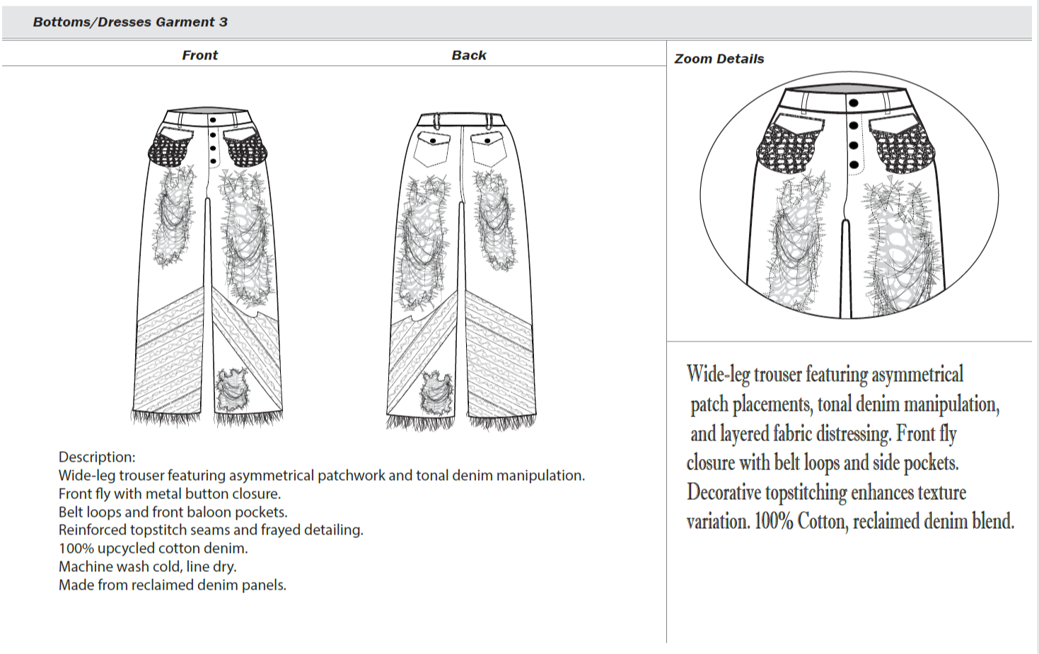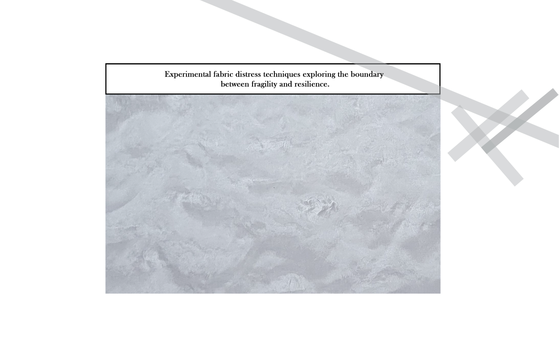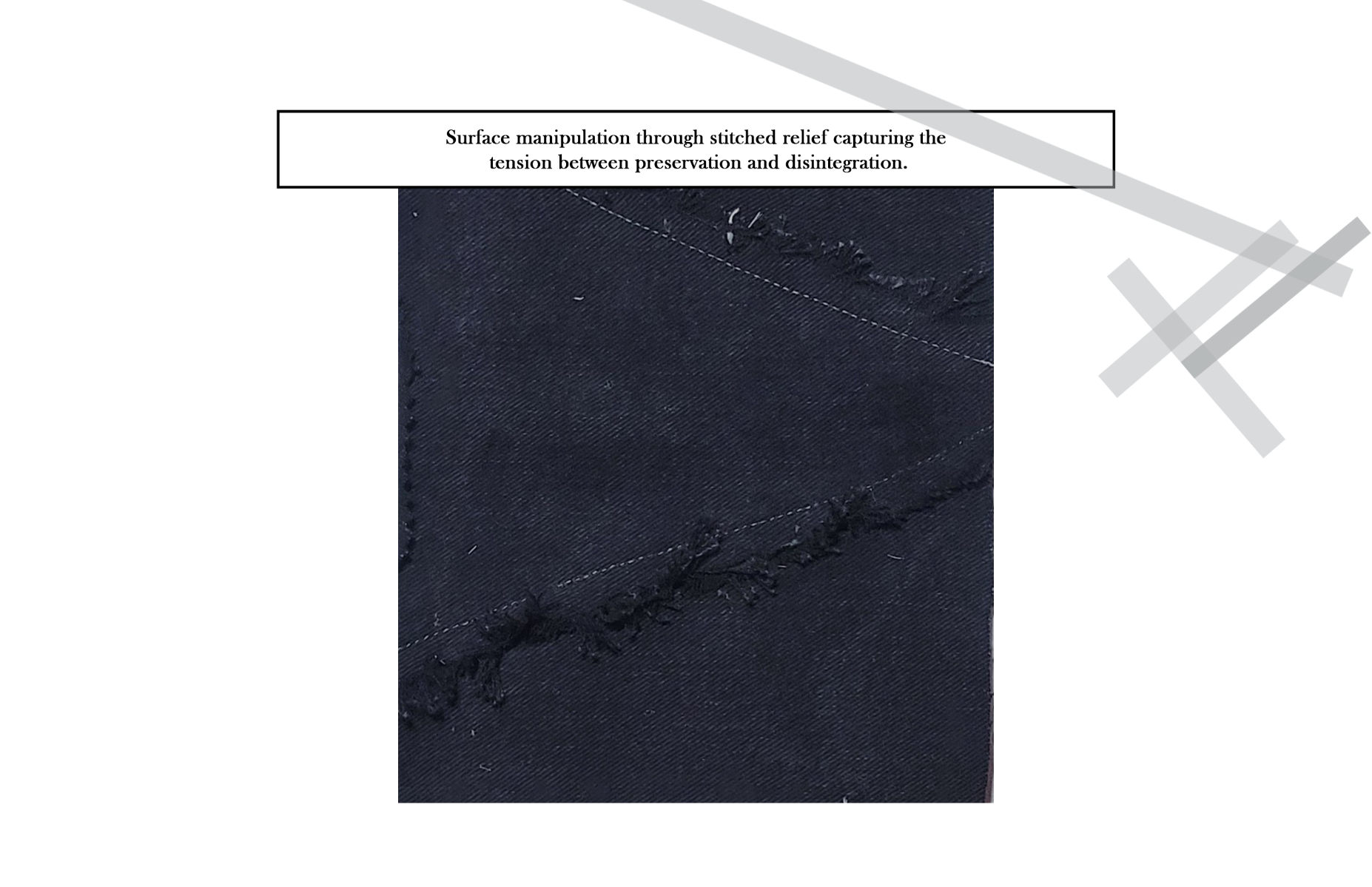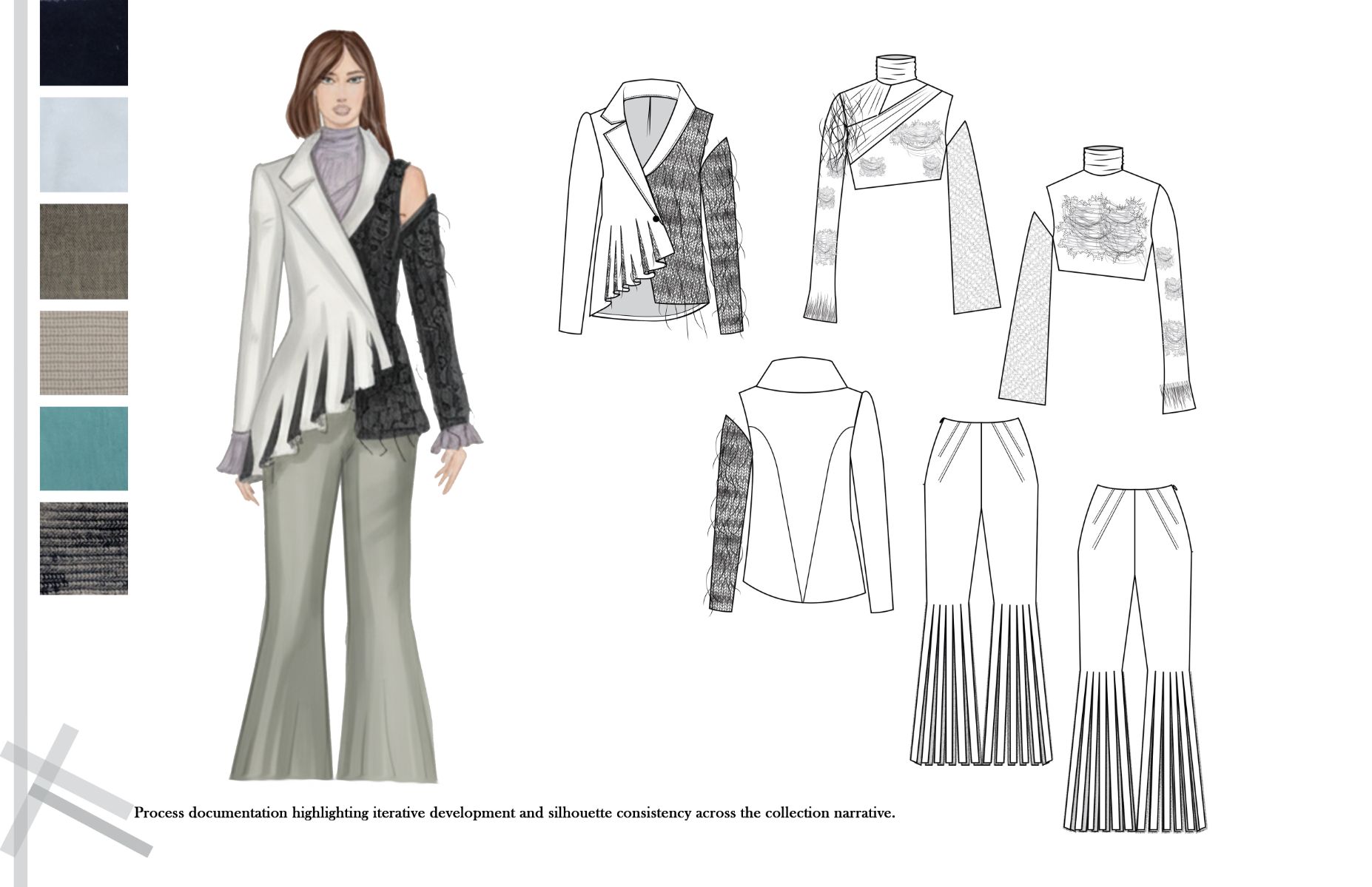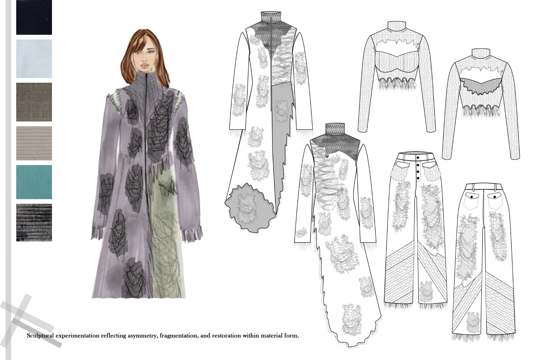 This collection explores reconstruction through refined craftsmanship and sustainable material innovation. Each garment merges couture tailoring with experimental surface techniques—distressed textiles, frayed seams, raw-edge manipulation, and layered patchwork. Upcycled denim, tweed, and organza are reinterpreted into structured yet fluid silhouettes, emphasizing contrast between decay and renewal. The design direction highlights technical precision, modular construction, and texture as a design language, achieving a balance between architectural form and organic imperfection.