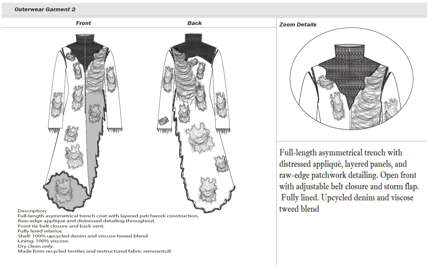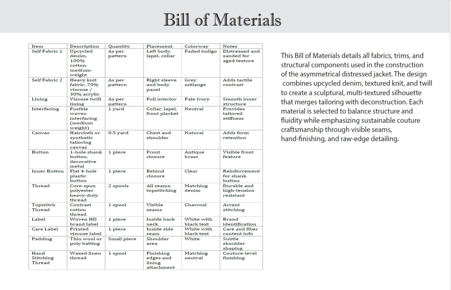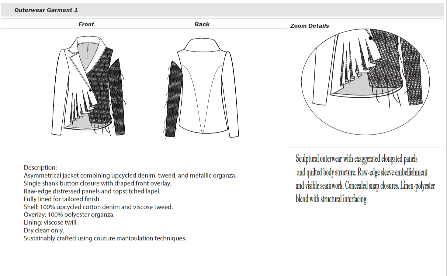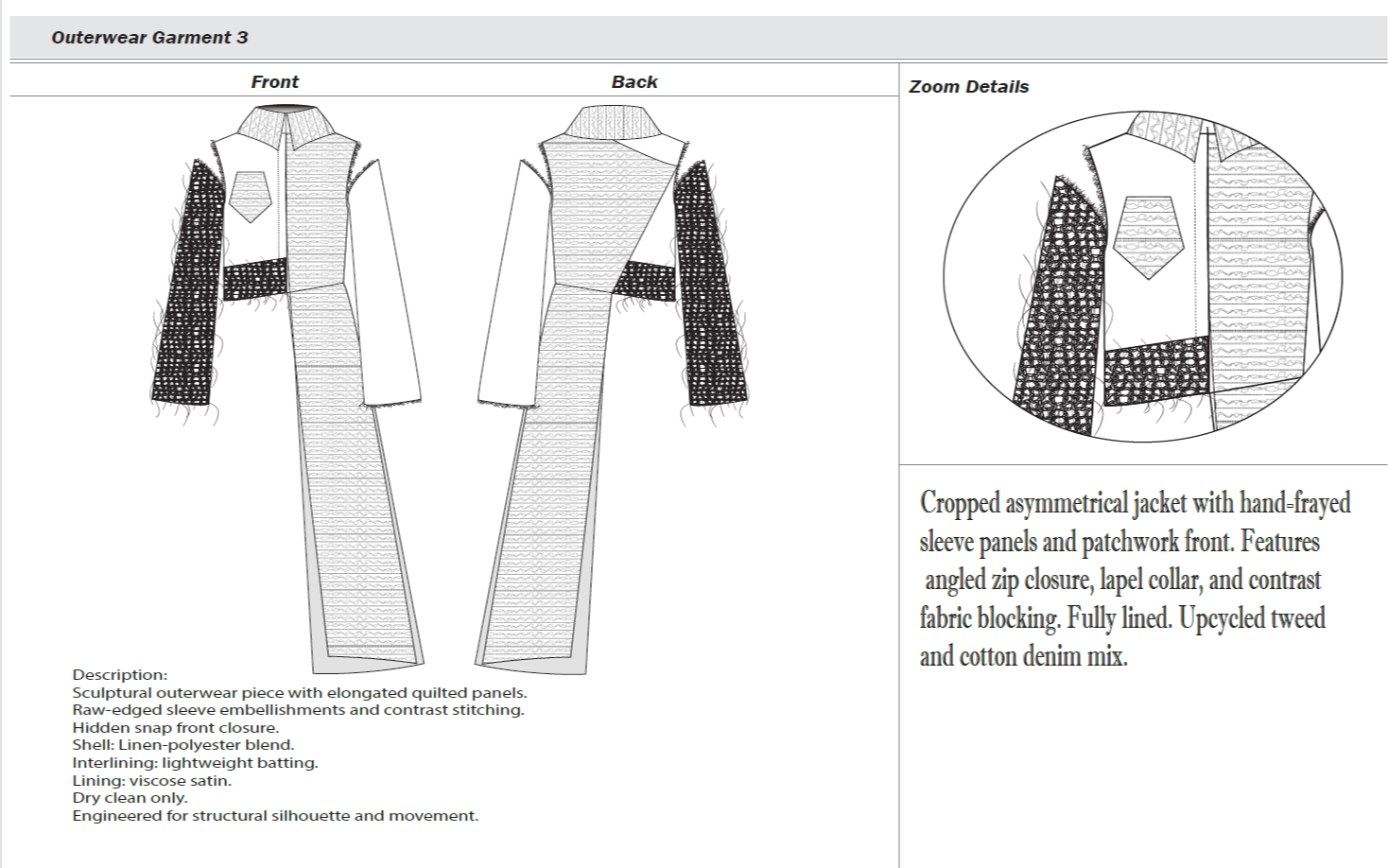 This collection explores reconstruction through refined craftsmanship and sustainable material innovation. Each garment merges couture tailoring with experimental surface techniques—distressed textiles, frayed seams, raw-edge manipulation, and layered patchwork. Upcycled denim, tweed, and organza are reinterpreted into structured yet fluid silhouettes, emphasizing contrast between decay and renewal. The design direction highlights technical precision, modular construction, and texture as a design language, achieving a balance between architectural form and organic imperfection.
