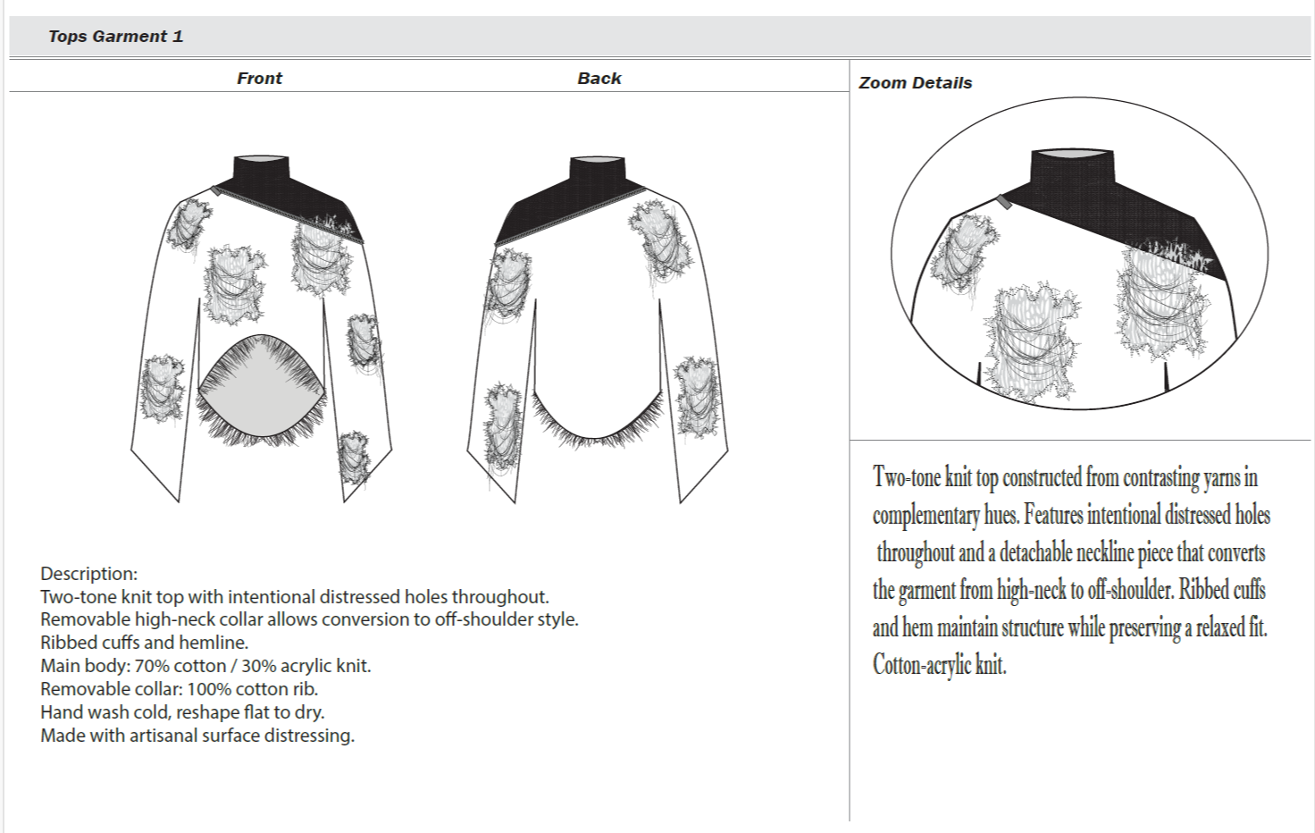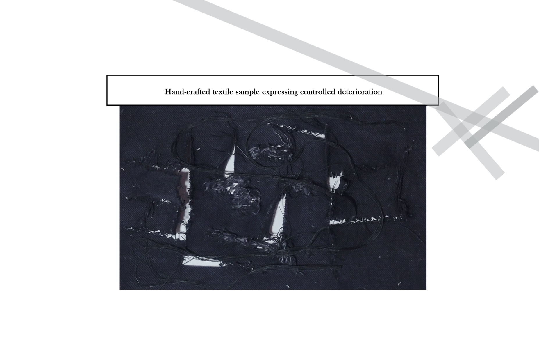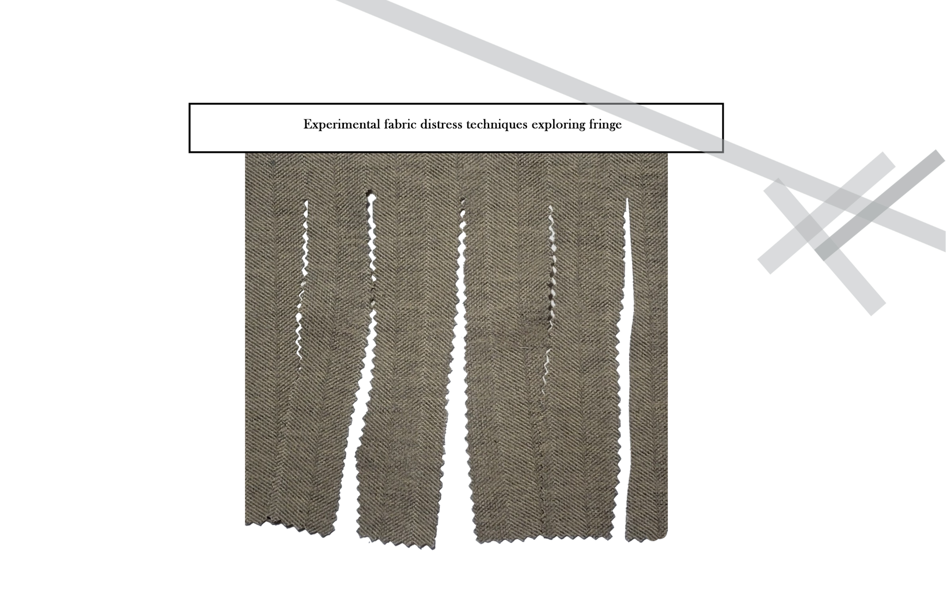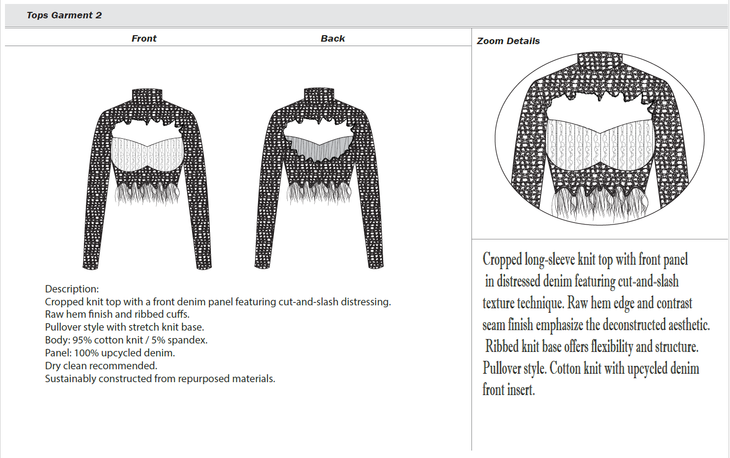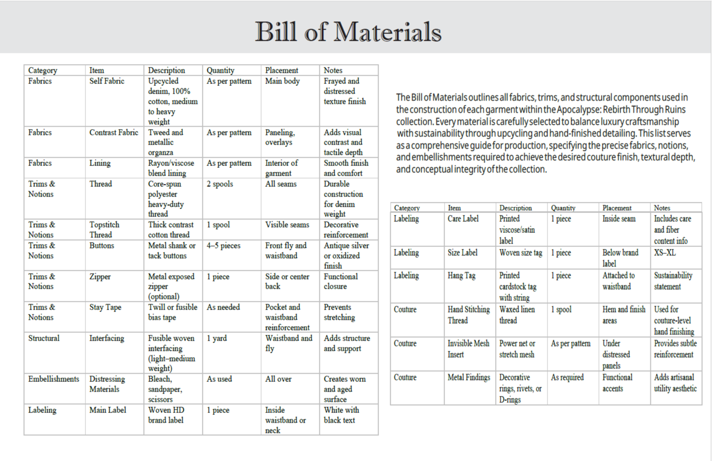 This collection explores reconstruction through refined craftsmanship and sustainable material innovation. Each garment merges couture tailoring with experimental surface techniques—distressed textiles, frayed seams, raw-edge manipulation, and layered patchwork. Upcycled denim, tweed, and organza are reinterpreted into structured yet fluid silhouettes, emphasizing contrast between decay and renewal. The design direction highlights technical precision, modular construction, and texture as a design language, achieving a balance between architectural form and organic imperfection.