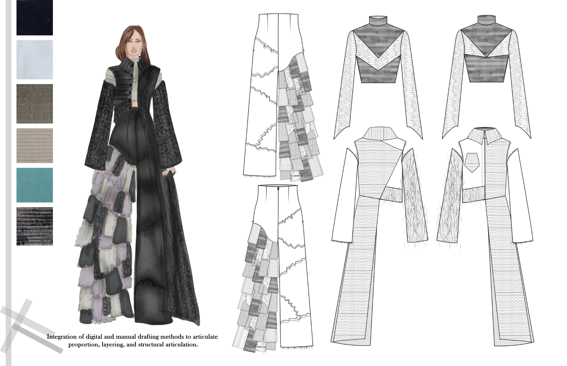 Skilled in Adobe Illustrator, Photoshop, and CLO3D, I bring ideas to life through both digital and physical processes, emphasizing craftsmanship, detail, and meaning in every stitch. My goal is to redefine modern couture by celebrating sustainability and cultural continuity in design.