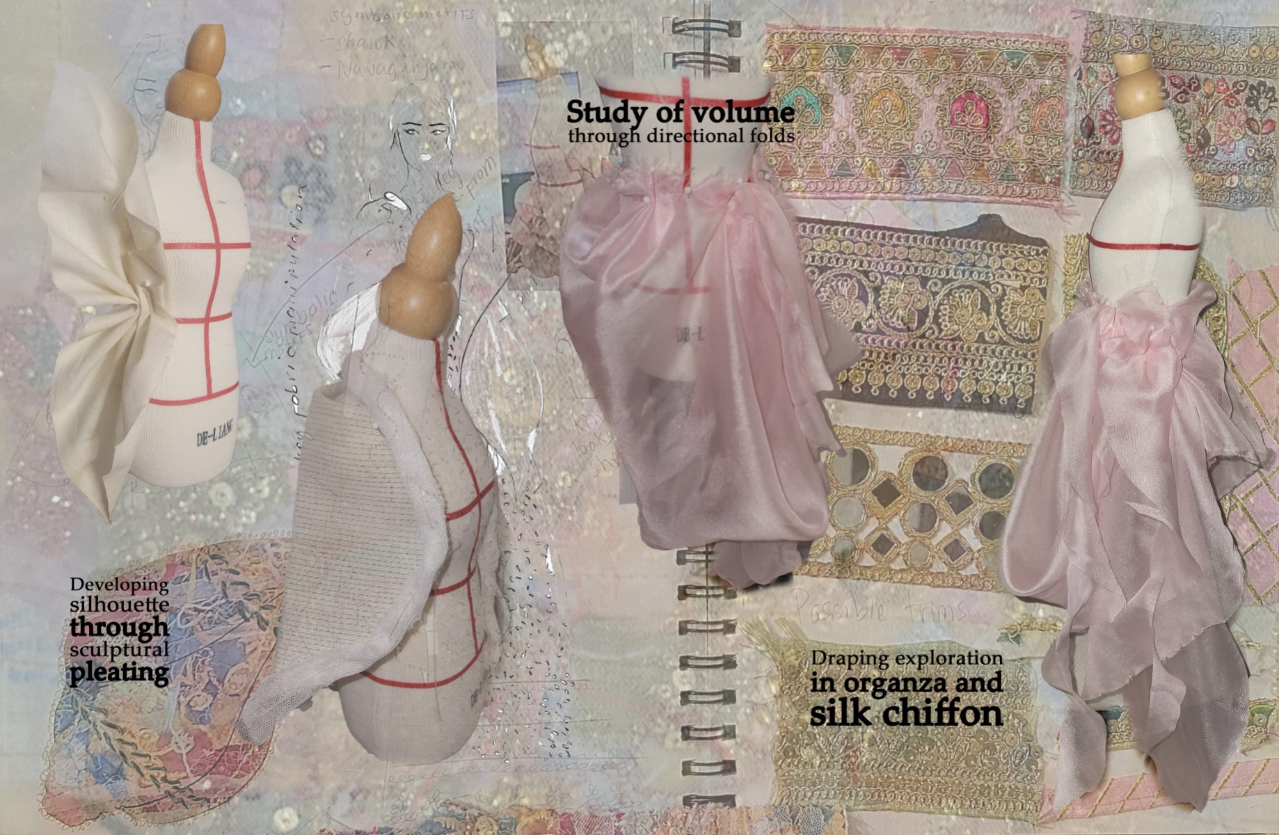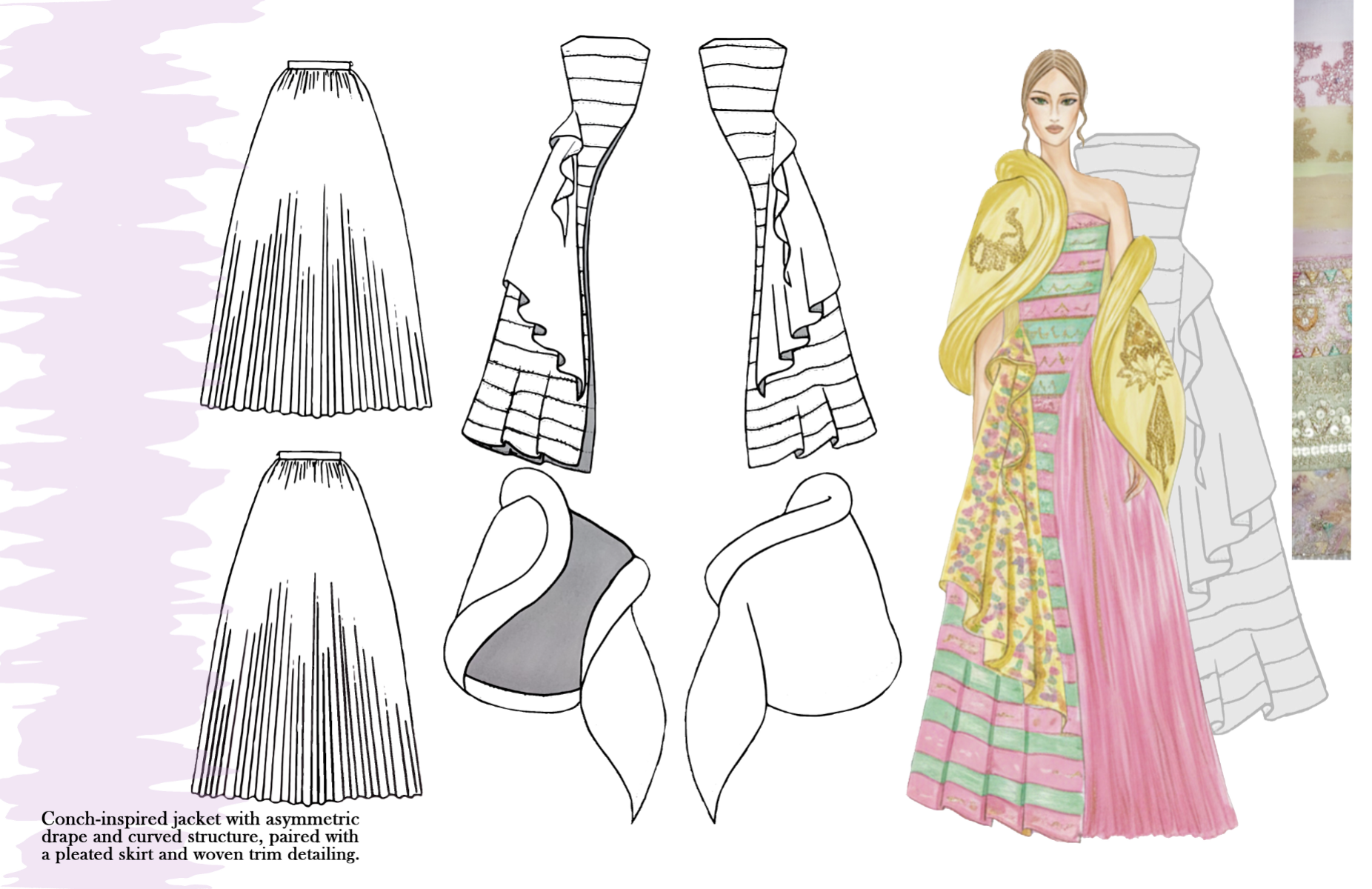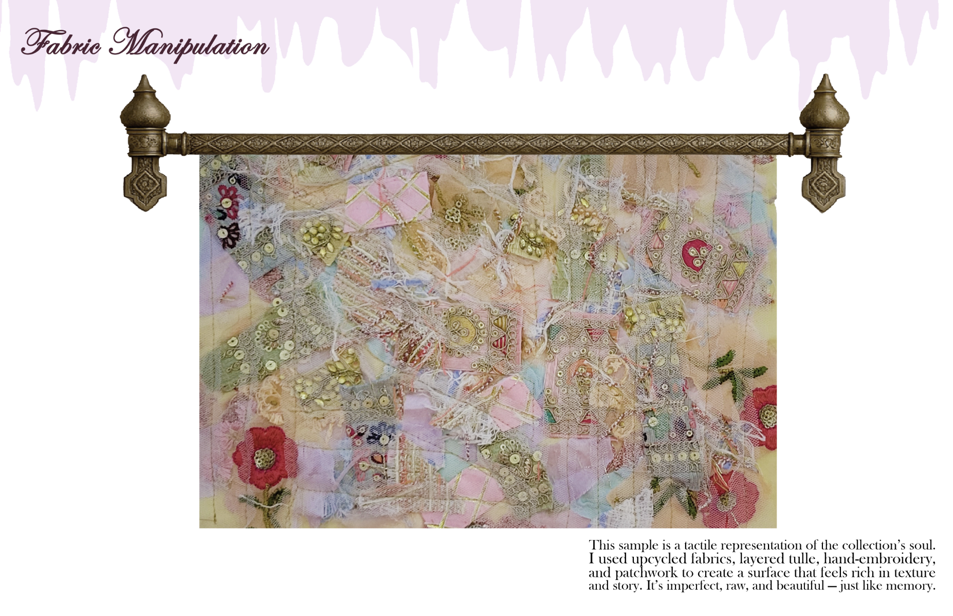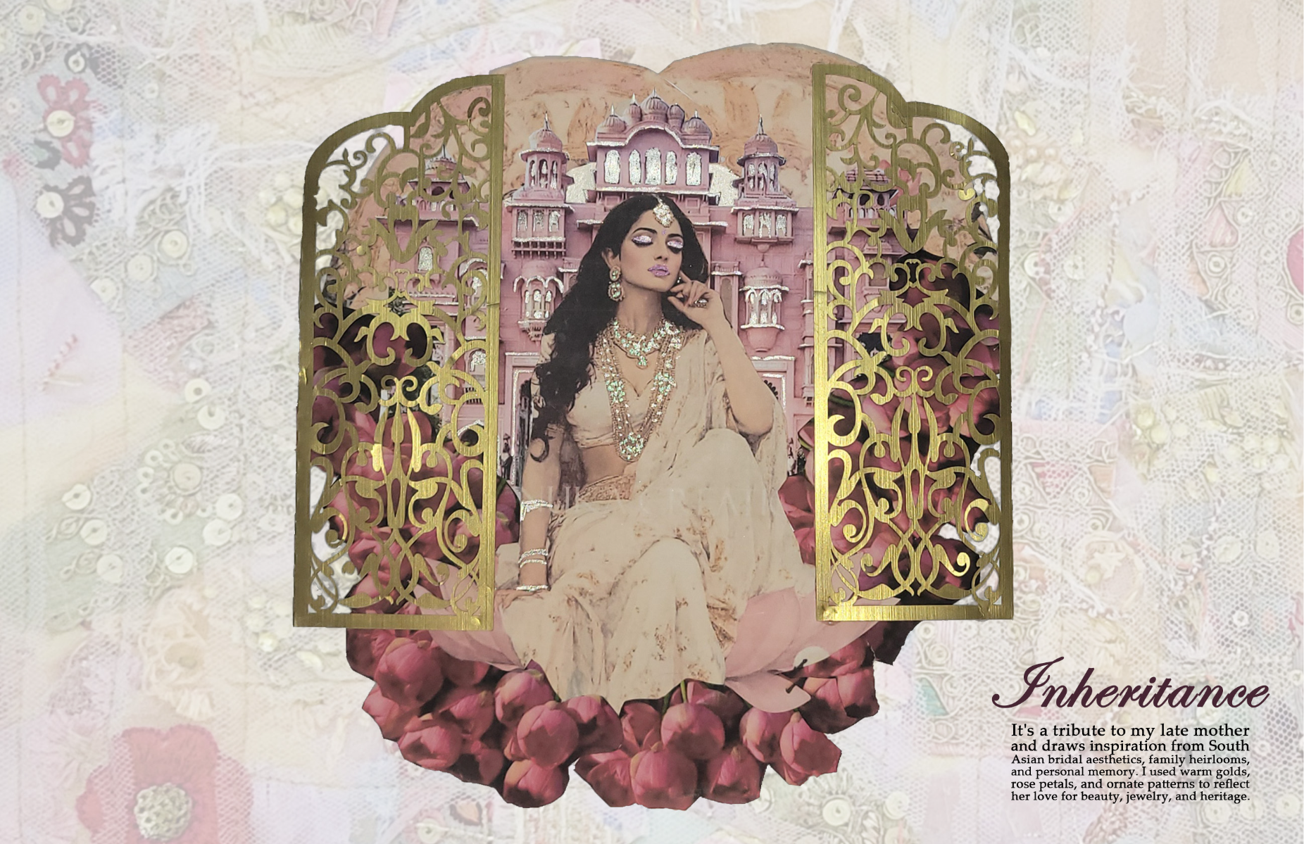 Inheritance is a couture upcycling collection that explores personal memory, cultural identity, and emotional legacy through surface design and symbolic silhouette. Inspired by South Asian bridalwear, mythology, and the memory of my late mother, the collection reinterprets heirloom aesthetics using handcrafted techniques, sculptural drapes, and intricate fabric manipulation. The lotus and conch shell serve as key visual symbols—representing purity, spiritual growth, and resilience—woven into the forms, layering, and motion of each garment. Traditional trims, metallic borders, and embroidered fragments are repurposed and collaged to create new surfaces from old materials. This project represents both a personal tribute and a broader reflection on what we choose to carry forward—from thread to thread, and generation to generation.