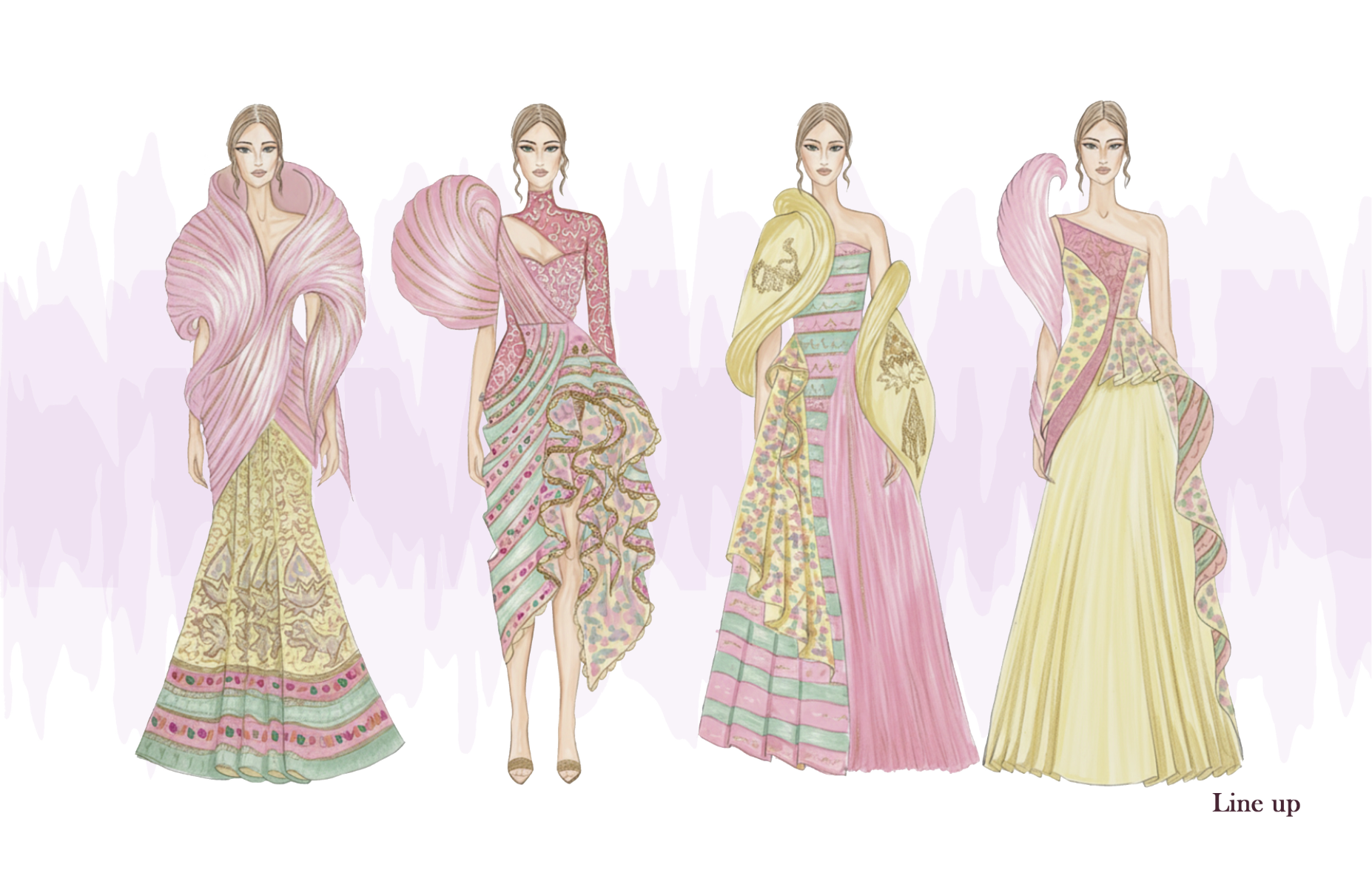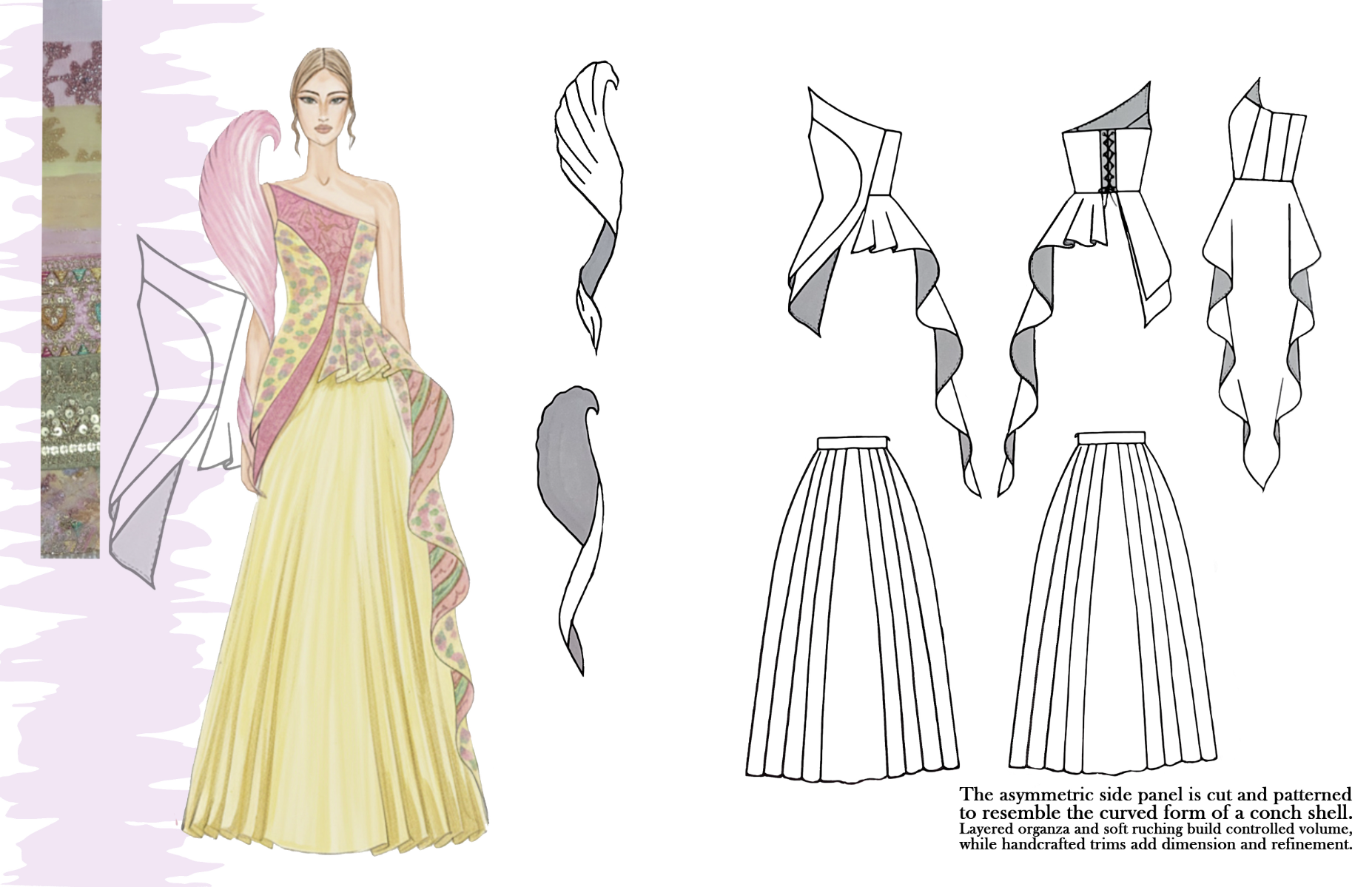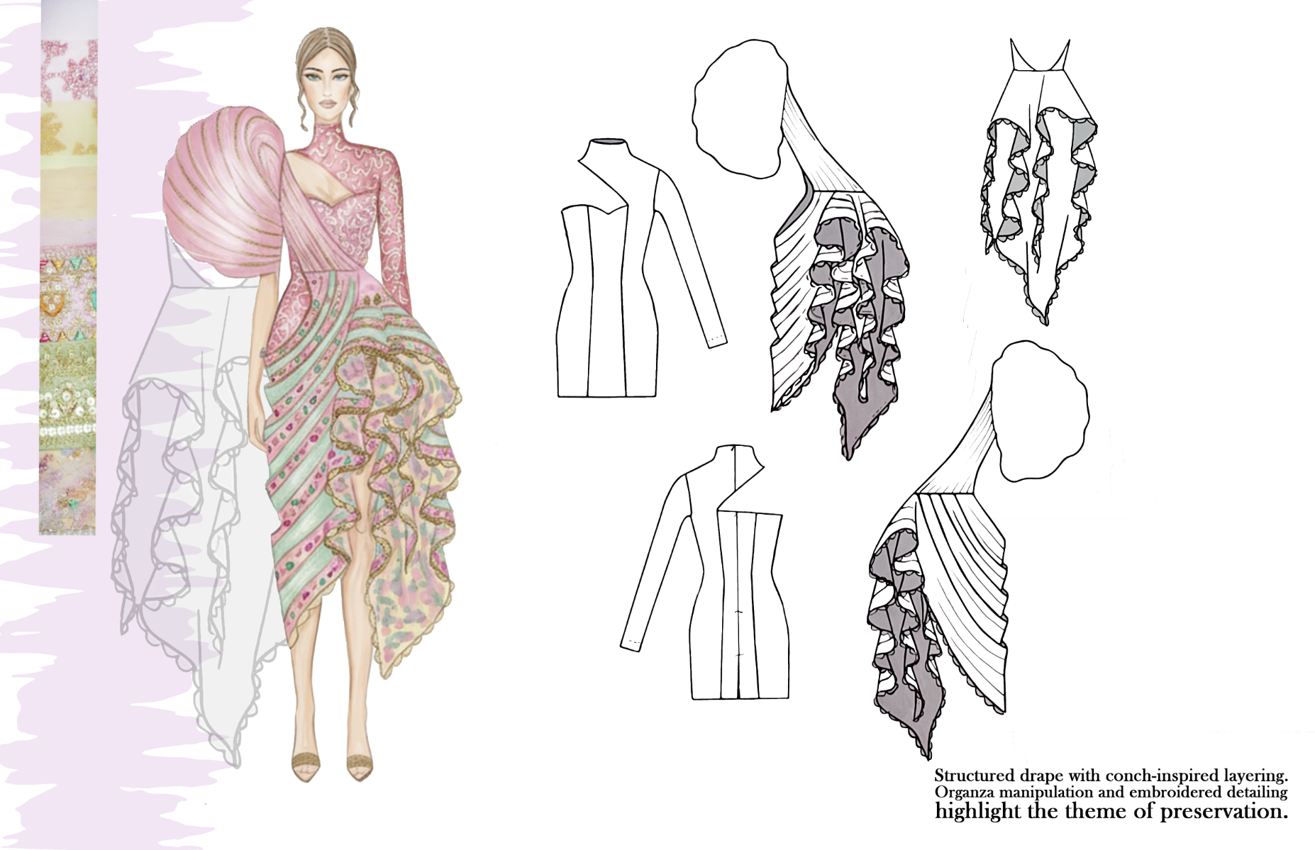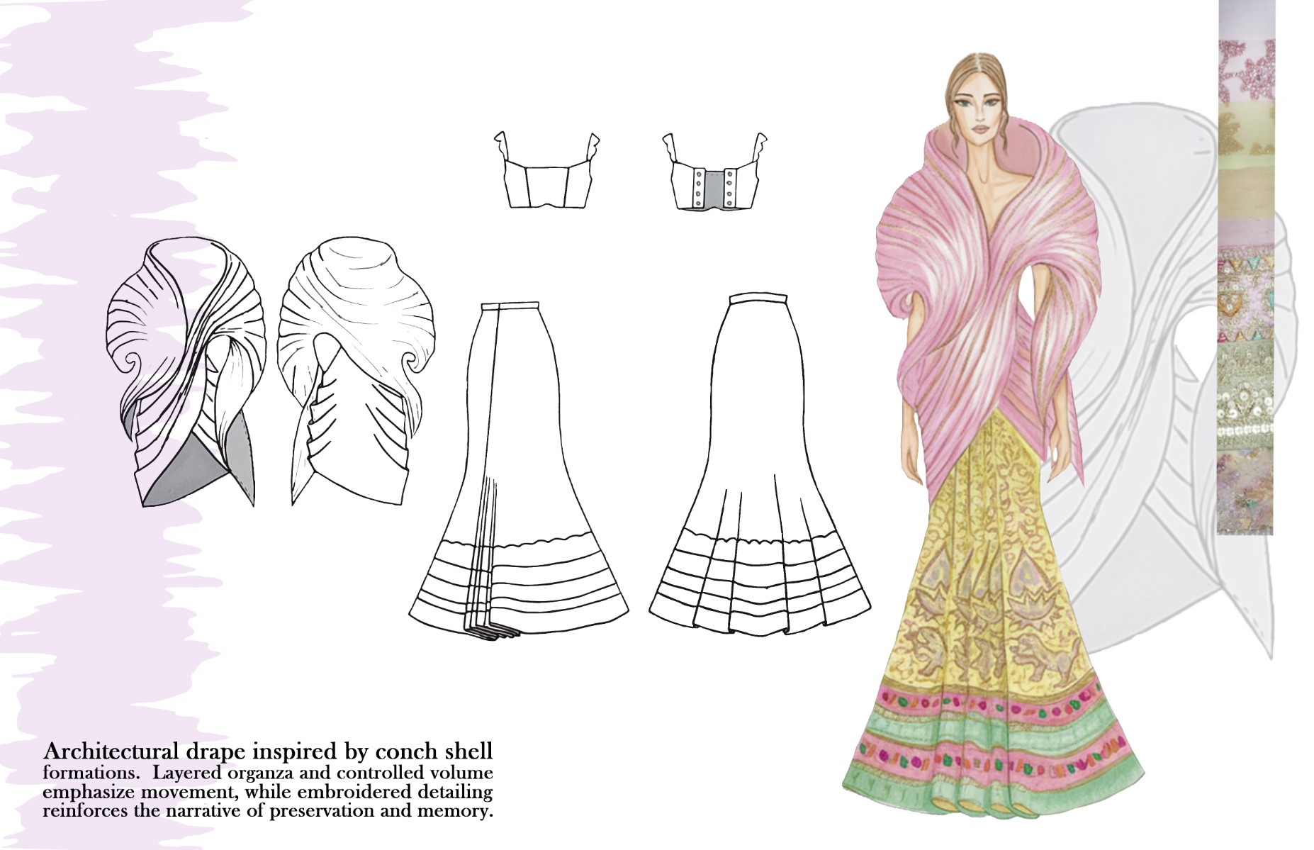 Each collection I create is rooted in storytelling — merging traditional South Asian craftsmanship with modern silhouettes and techniques. From draped conch-inspired forms to distressed luxury surfaces, my design approach balances artistic emotion with technical precision.
