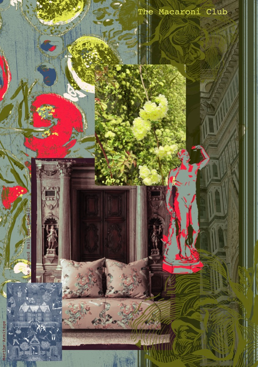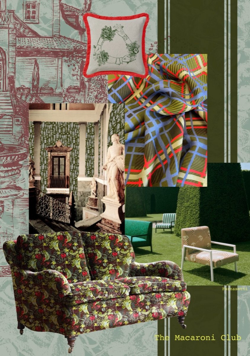 The Macaroni Club is a high-end, luxury, interior collection inspired by the flamboyance of the Grand Tour. Wealthy, young men plundered the Mediterranean and at times became satirised for the newly continental tastes that they brought back to a drab Britain. They have since become the early icons of queer style in a time where homosexuality did not have a name. The collection aims to capture an ephemeral reminiscence of their experience and its legacy within their lavish, British lifestyles.