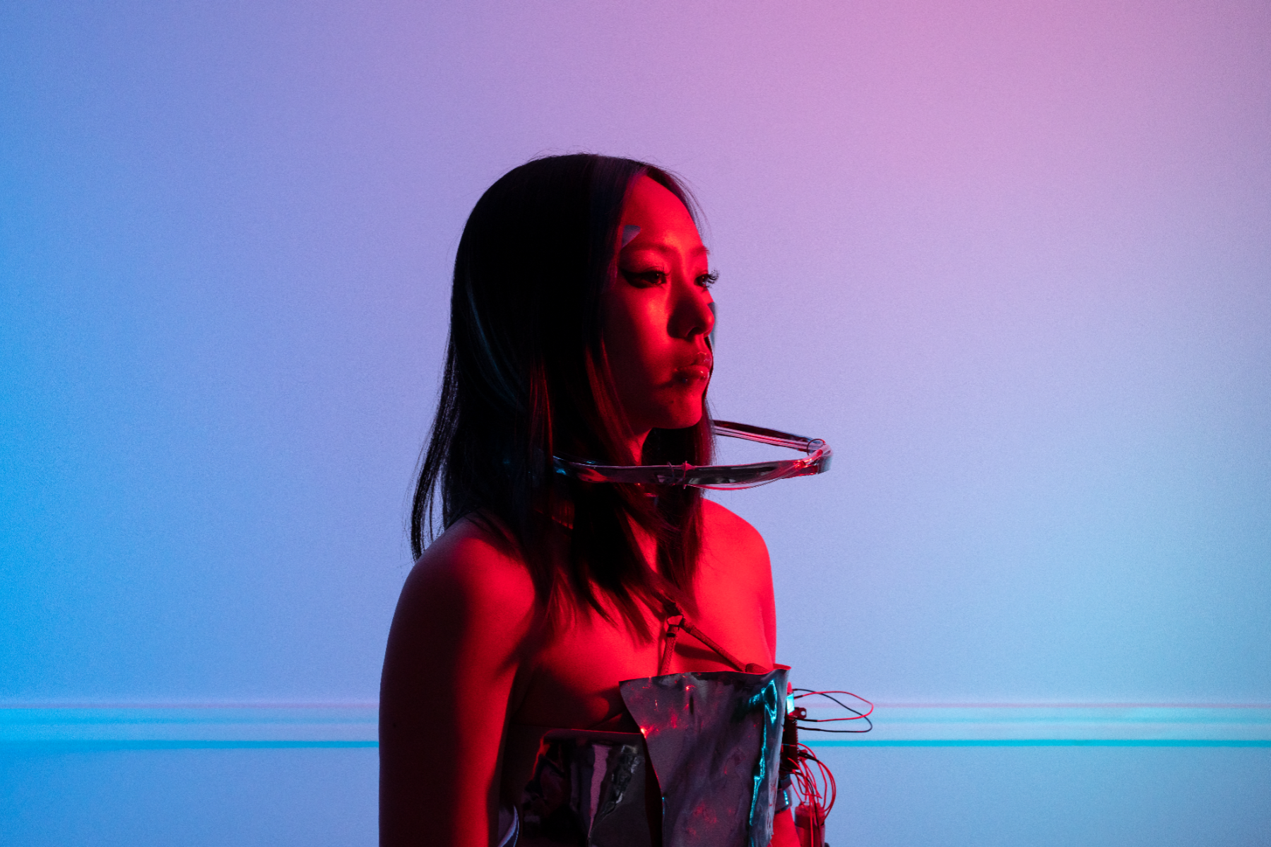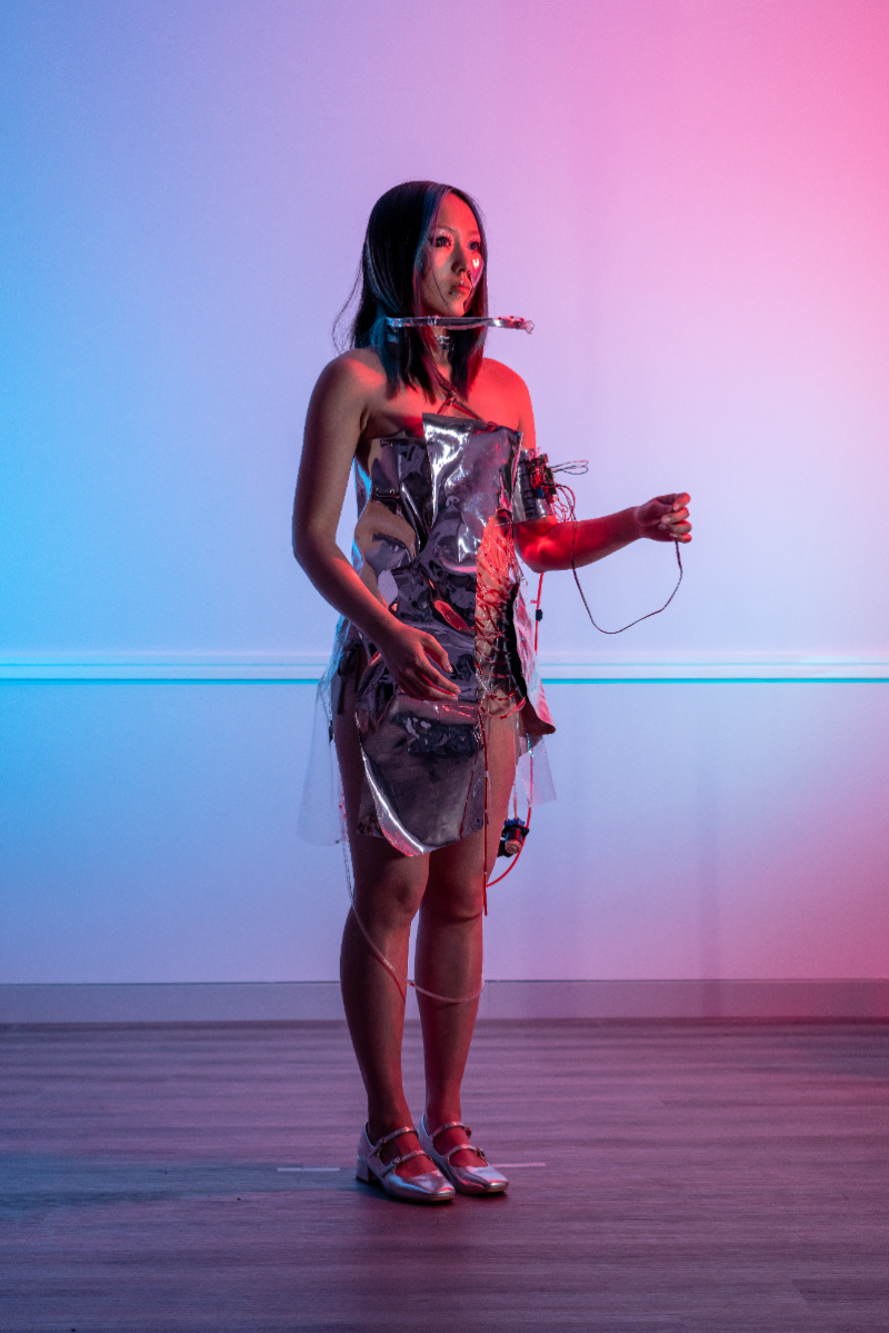 The concept behind the Pulse installation was to explore the human condition through the use of blood-like fluid running through pipes. The installation aimed to serve as a reminder of the violence and suffering that humans inflict upon each other, while its mechanical nature represents the detachment of modern society from these realities. By using a pulse sensor to detect the pulse, the machine created a visceral experience that forced viewers to confront bodily realities that are often hidden from view, including the ways in which our physical selves are ignored or oppressed by society. To bring this concept to life, the design of the installation was inspired by cyberpunk style, utilizing tubes shaped like ribs to create a hollowed-out appearance resembling veins in the body. The clothing was designed to be minimalist and sleek, featuring transparent PVC tubes circling around the neck area and leading to a hidden transparent interlayer on the back. This design successfully conveyed the idea of violence and oppression in modern society, emphasizing the human body's vulnerability and fragility.