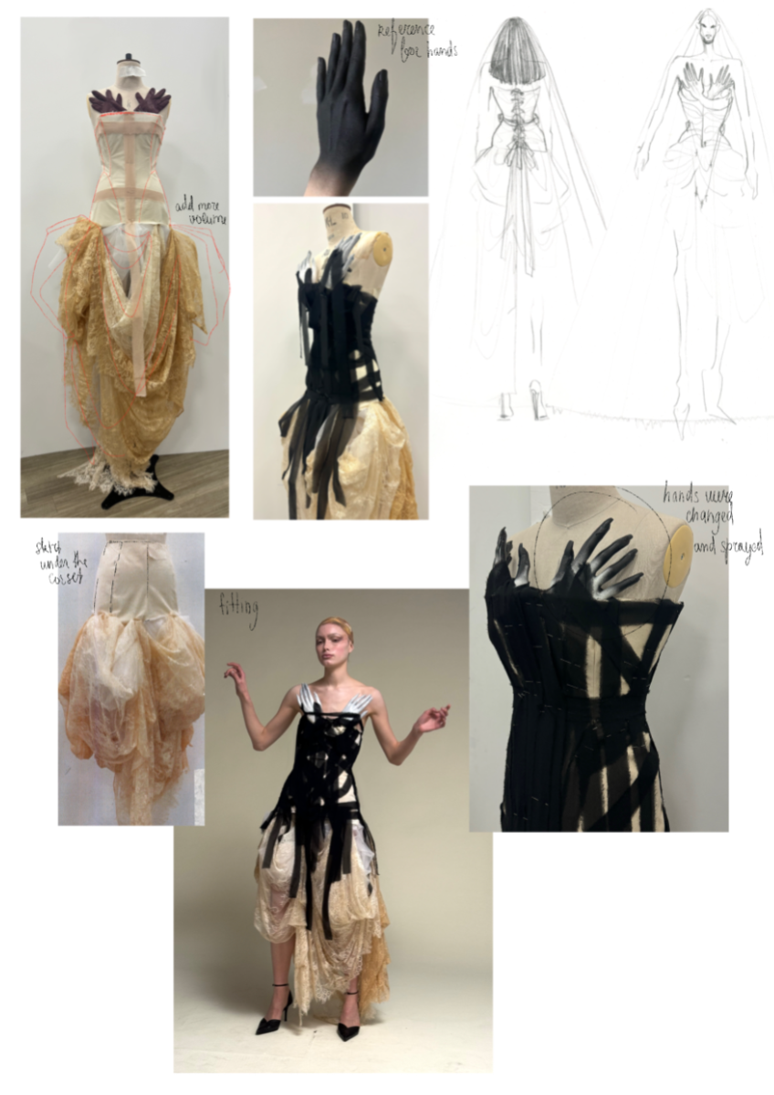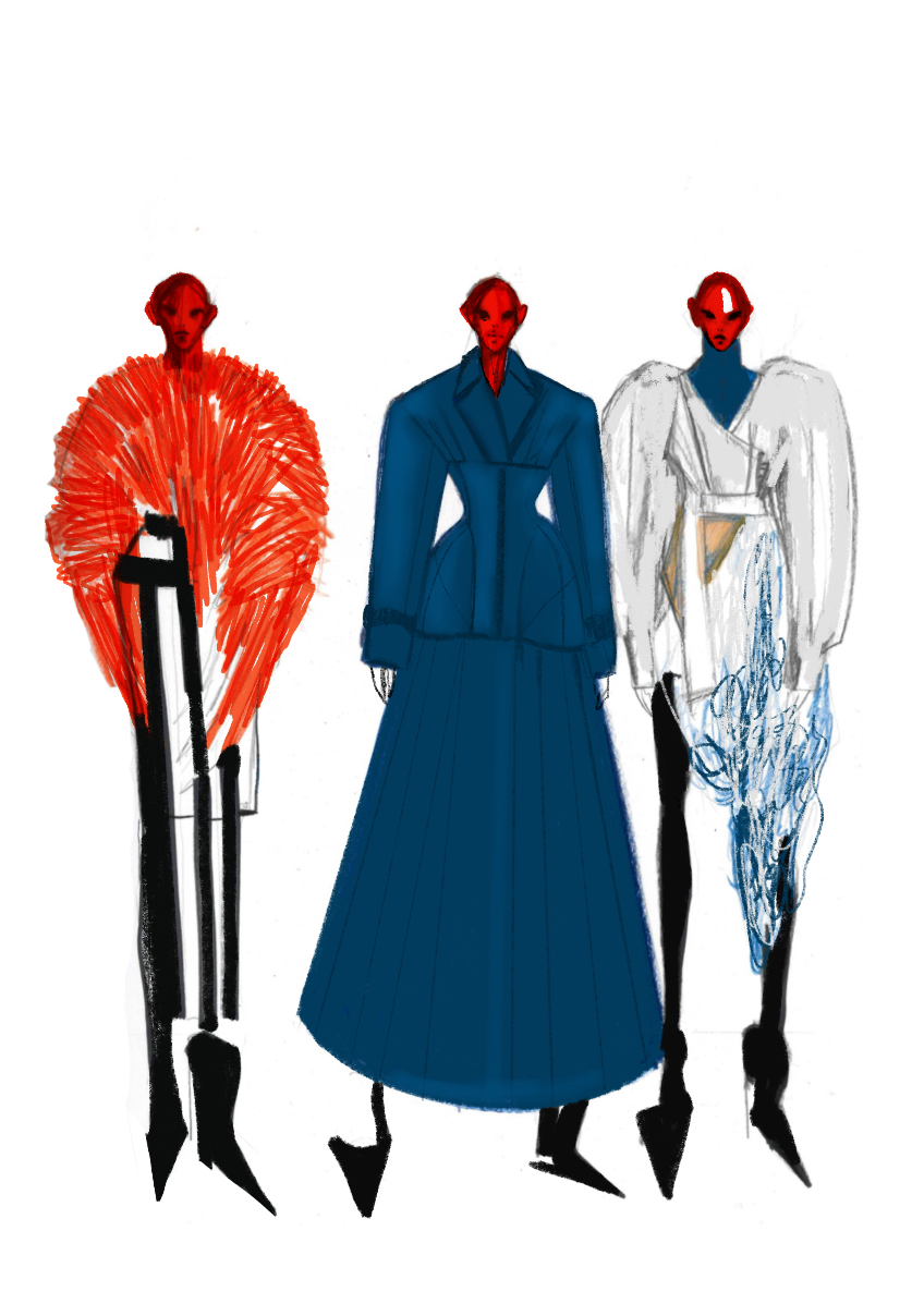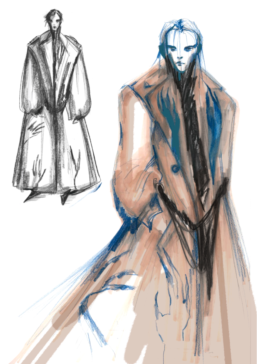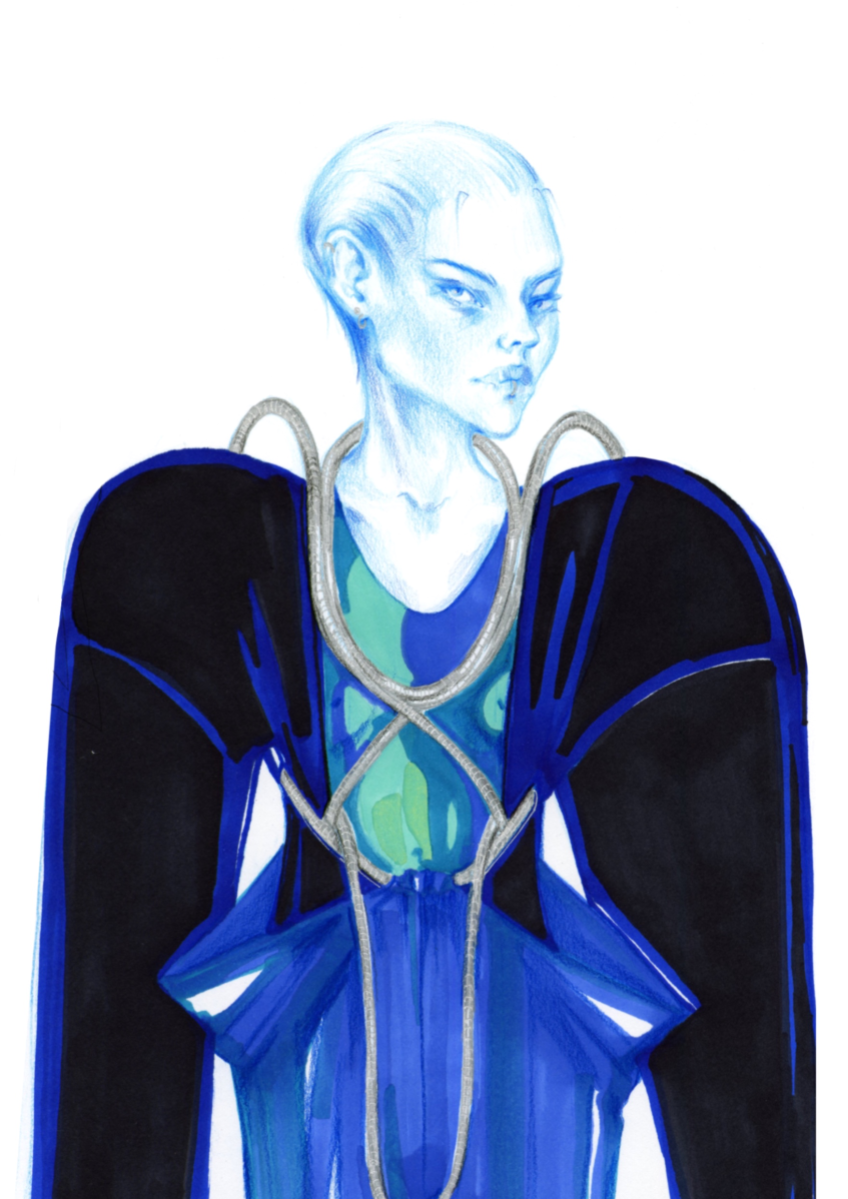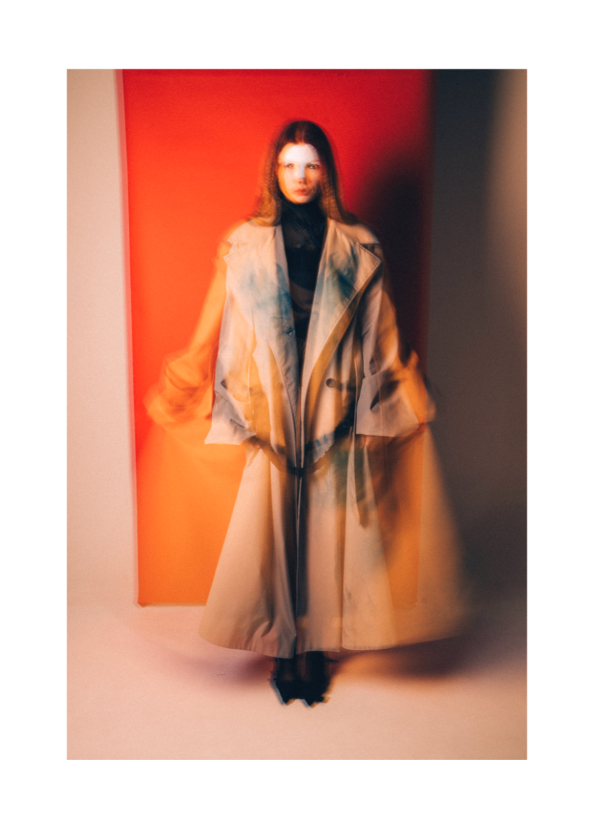 Fly At Dawn is an enchanting collection that pays tribute to the women of Ukraine, evoking both freedom and protection for the wearer. Inspired by the history of witches – powerful women with a deep connection to nature – the designs are soft yet strong. Pleated silks and folds of lace produce ethereal figures, whilst structured leather garments create armour-like protection. The result is otherworldly warriors. The natural dying and printing technique known as ‘cyanotype’, whereby a liquid formulation responds to sunlight, is symbolic of the designer’s own experimentation with the powers of nature. This is combined with traditional Ukrainian details, such as billowing bishop sleeves, veils, and plaited hair, which are reimagined with an avant-garde edge. The plaits of hair have become accessories of rope. The oversized sleeves have taken on the form of wings for the wearer to take flight. Handprints cover the body symbolising safety and prayer. These unique details make this collection both magical and modern.