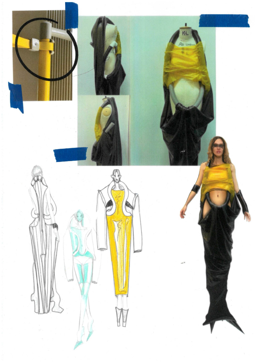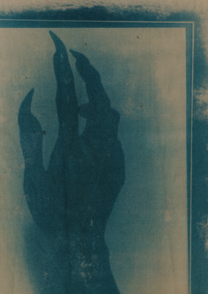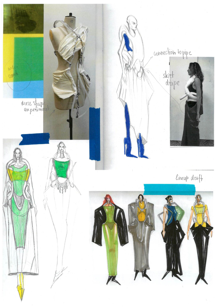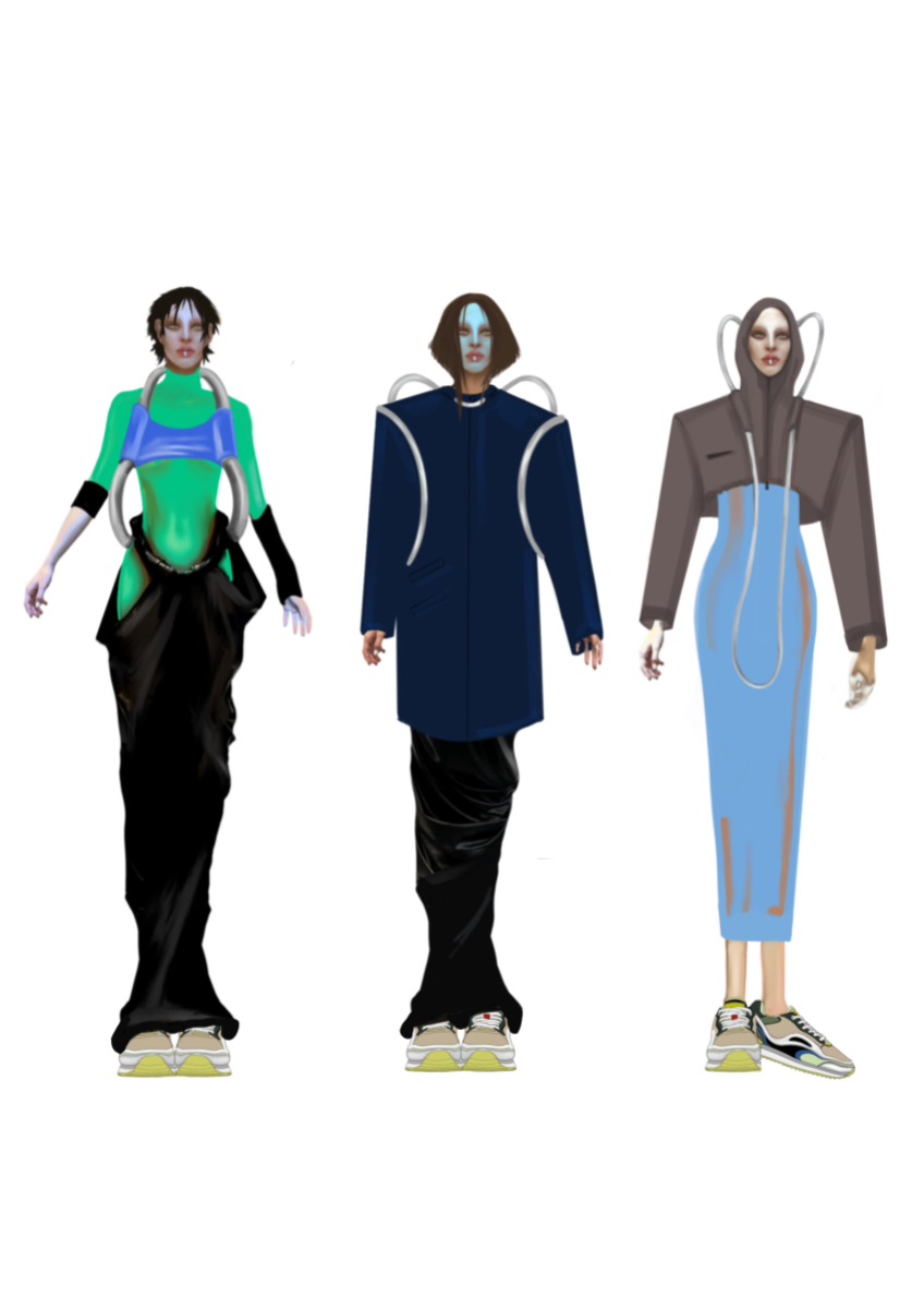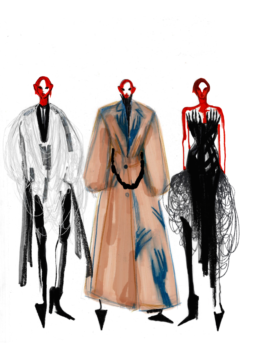 Fly At Dawn is an enchanting collection that pays tribute to the women of Ukraine, evoking both freedom and protection for the wearer. Inspired by the history of witches – powerful women with a deep connection to nature – the designs are soft yet strong. Pleated silks and folds of lace produce ethereal figures, whilst structured leather garments create armour-like protection. The result is otherworldly warriors. The natural dying and printing technique known as ‘cyanotype’, whereby a liquid formulation responds to sunlight, is symbolic of the designer’s own experimentation with the powers of nature. This is combined with traditional Ukrainian details, such as billowing bishop sleeves, veils, and plaited hair, which are reimagined with an avant-garde edge. The plaits of hair have become accessories of rope. The oversized sleeves have taken on the form of wings for the wearer to take flight. Handprints cover the body symbolising safety and prayer. These unique details make this collection both magical and modern.