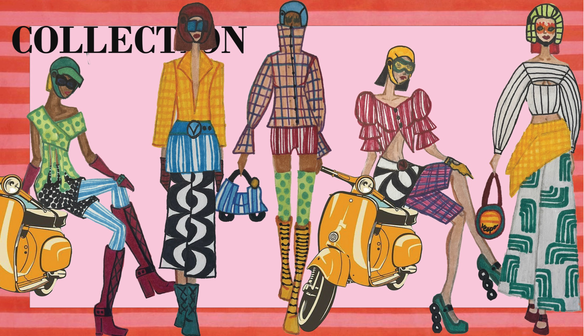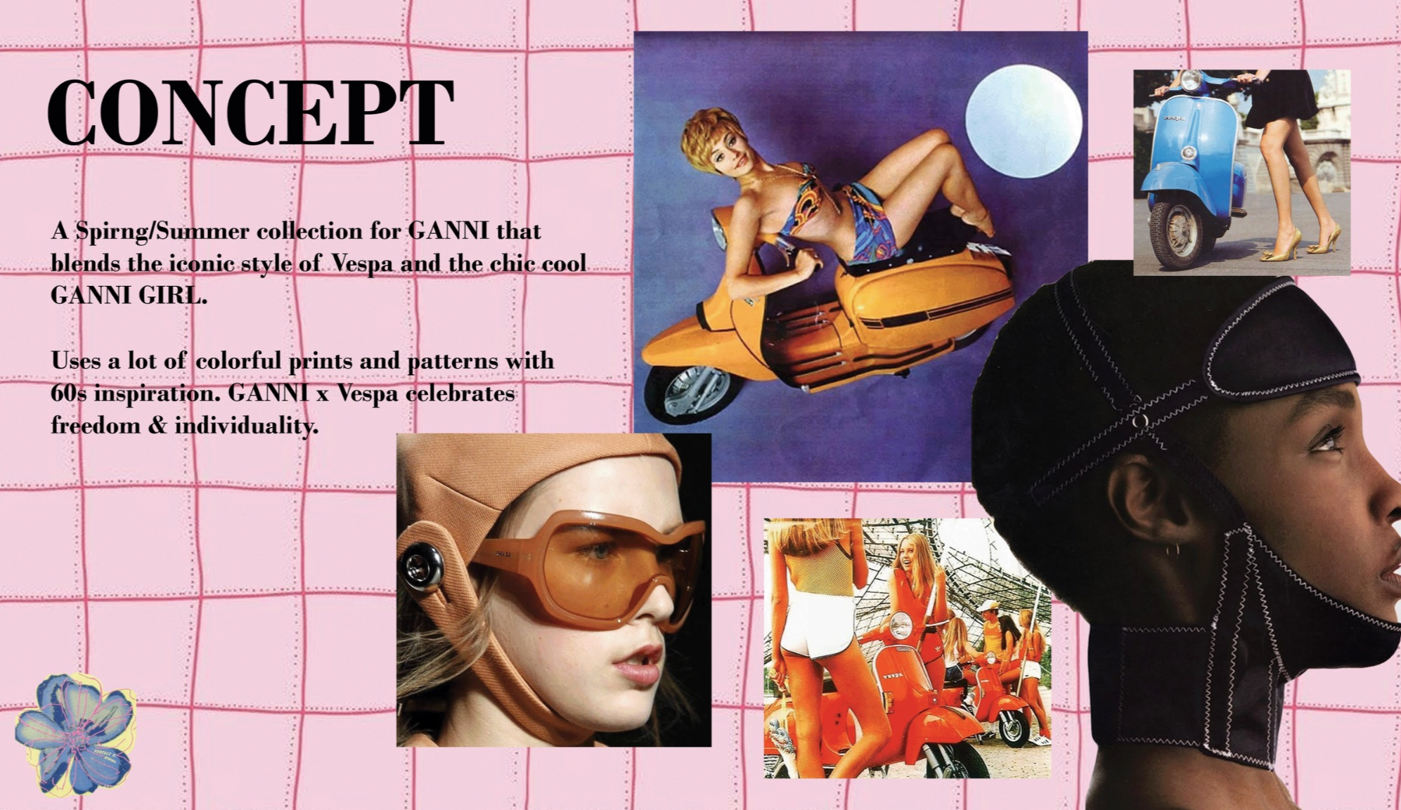 Fashion scholarship fund competition presentation. Merging two brands; one fashion brand being GANNI and one non-fashion brand being Vespa. Created a brand extension and a six look lineup with extensive research on both brands.