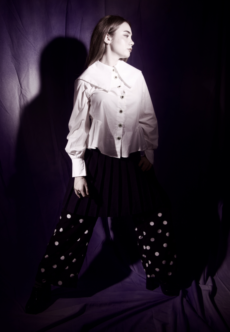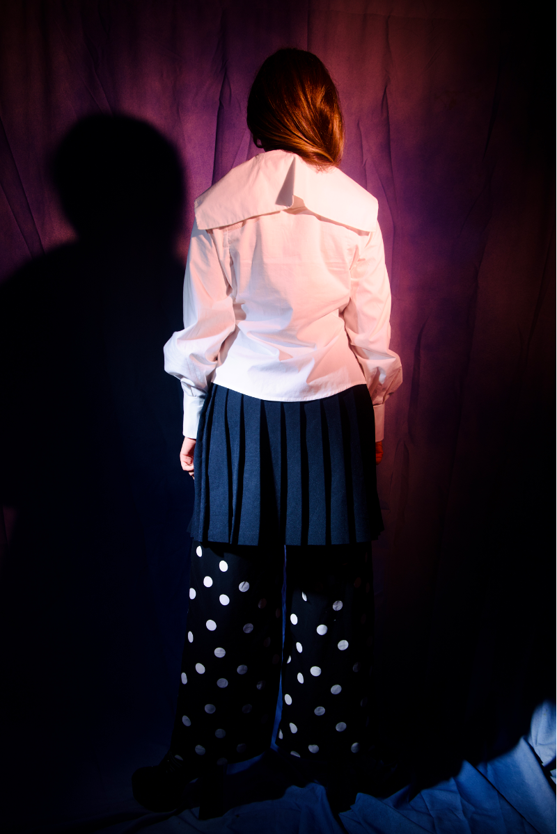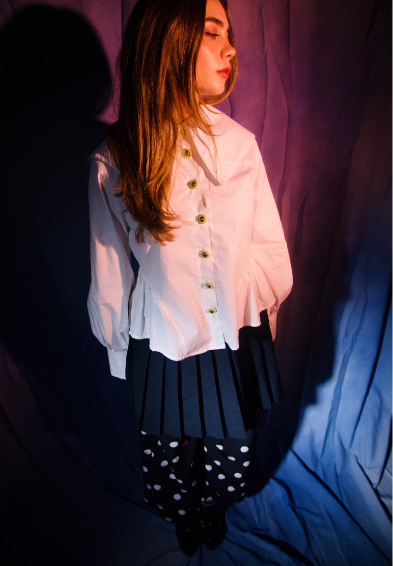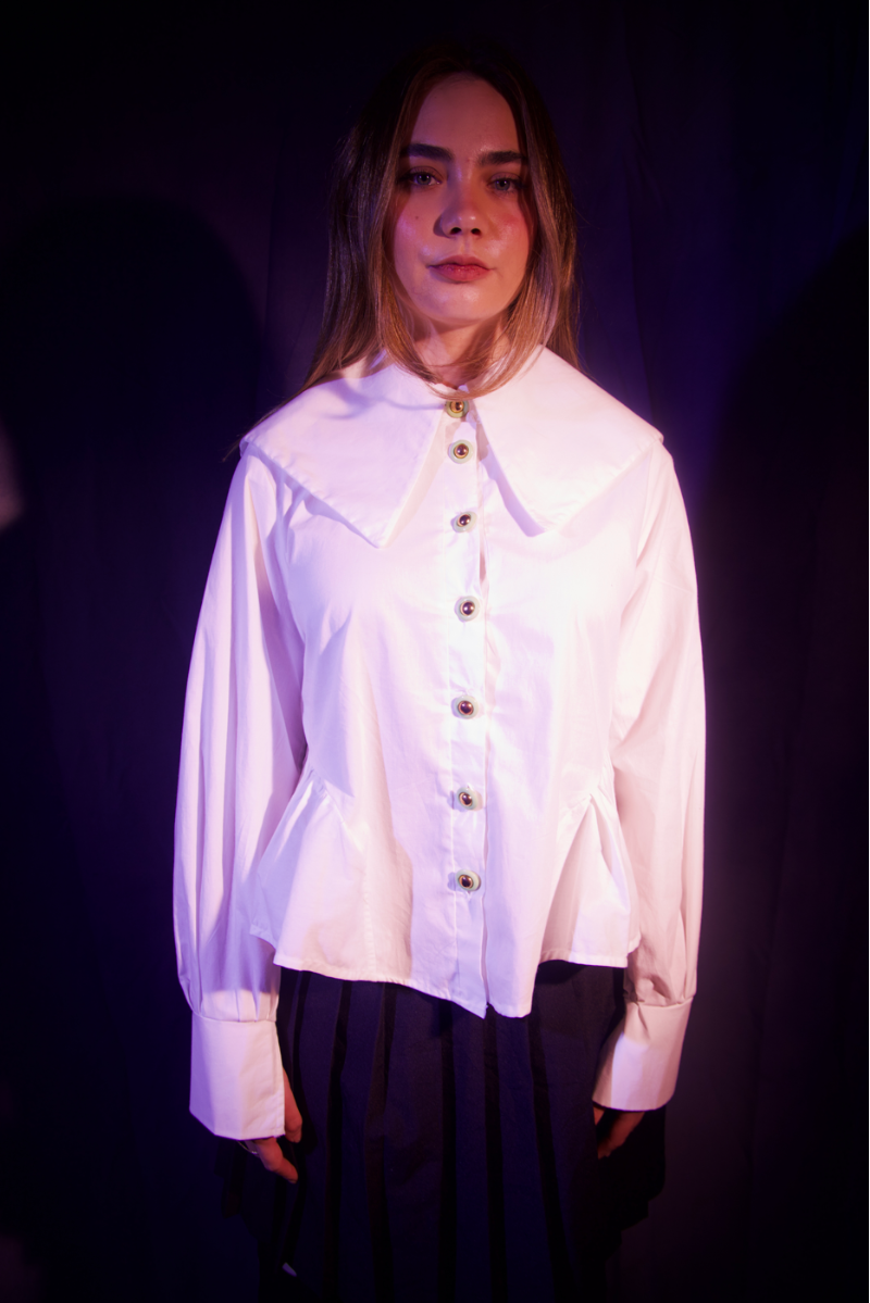 White button down I developed on the 3D fashion design software CLO. Oversized sailor collar, bishop sleeves, large cuffs, and vintage thrifted buttons.