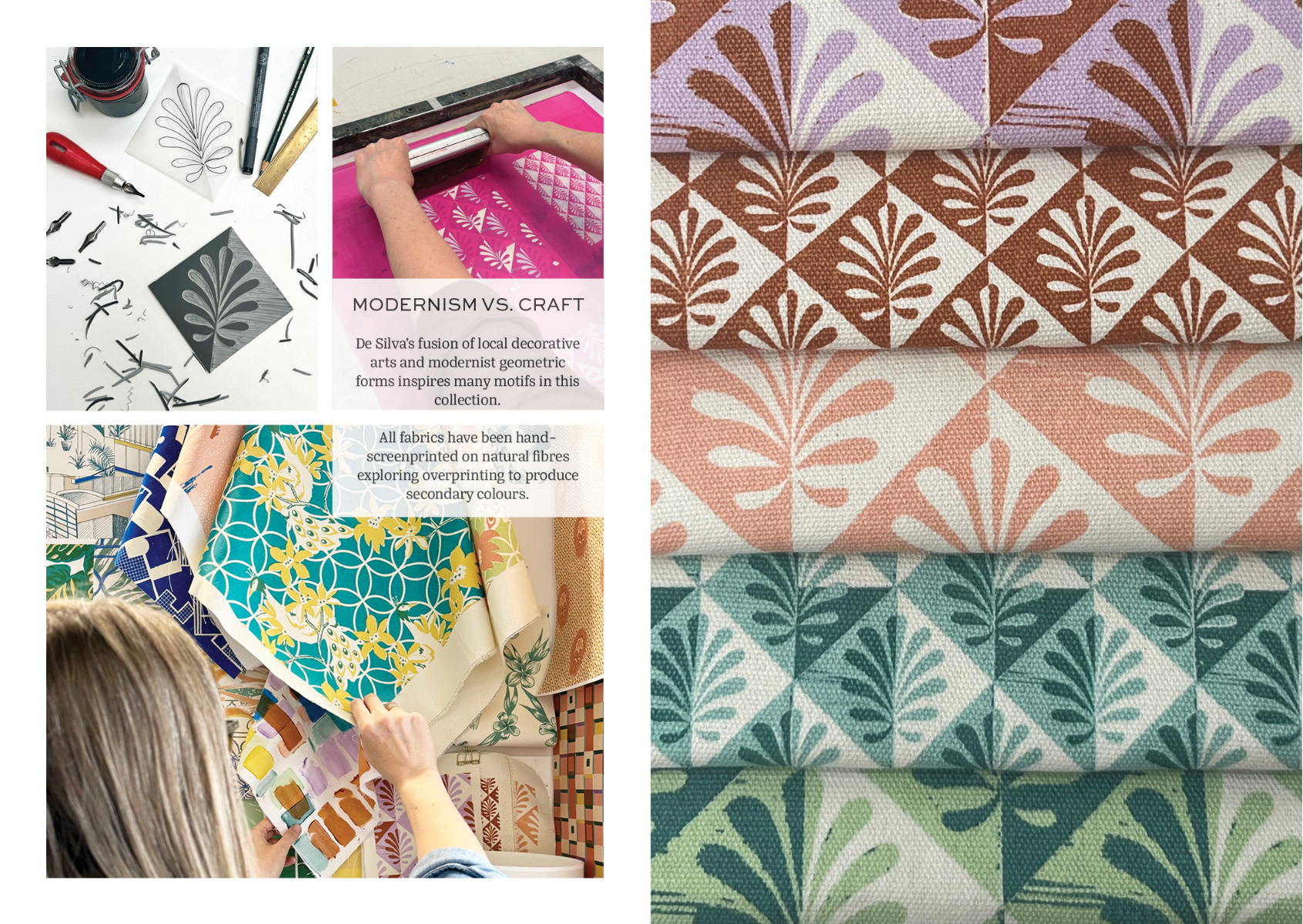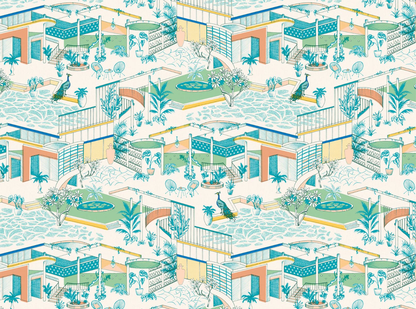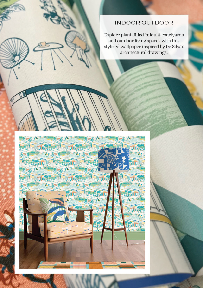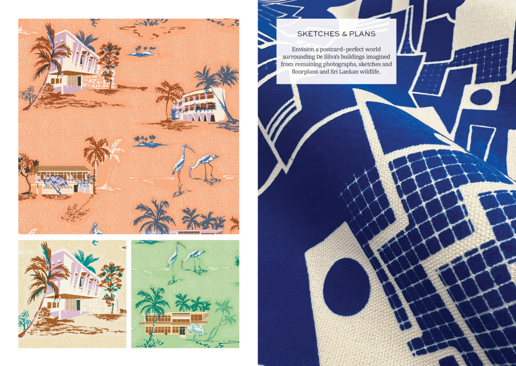 Celebrate the biophilic spaces designed by Sri Lankan architect Minnette De Silva - one of the first female architects to have her own practice in the 1940s - with this eclectic wallpaper & interior textiles collection. Explore the contrasts in her work; between geometric modernist forms, decorative features made by local artisans, and the lush tropical planting of her outdoor living spaces. Inspired by the grainy half-tone photographs and stylised architectural drawings & plans - that are sadly much of what remains of her work - this collection of wallpapers and hand-screenprinted fabrics mix artisanship and modernity. Influenced by mid-century prints and postcards, overprinting is explored to create secondary colours in a palette of peacock blues and clay pinks with pops of cobalt.