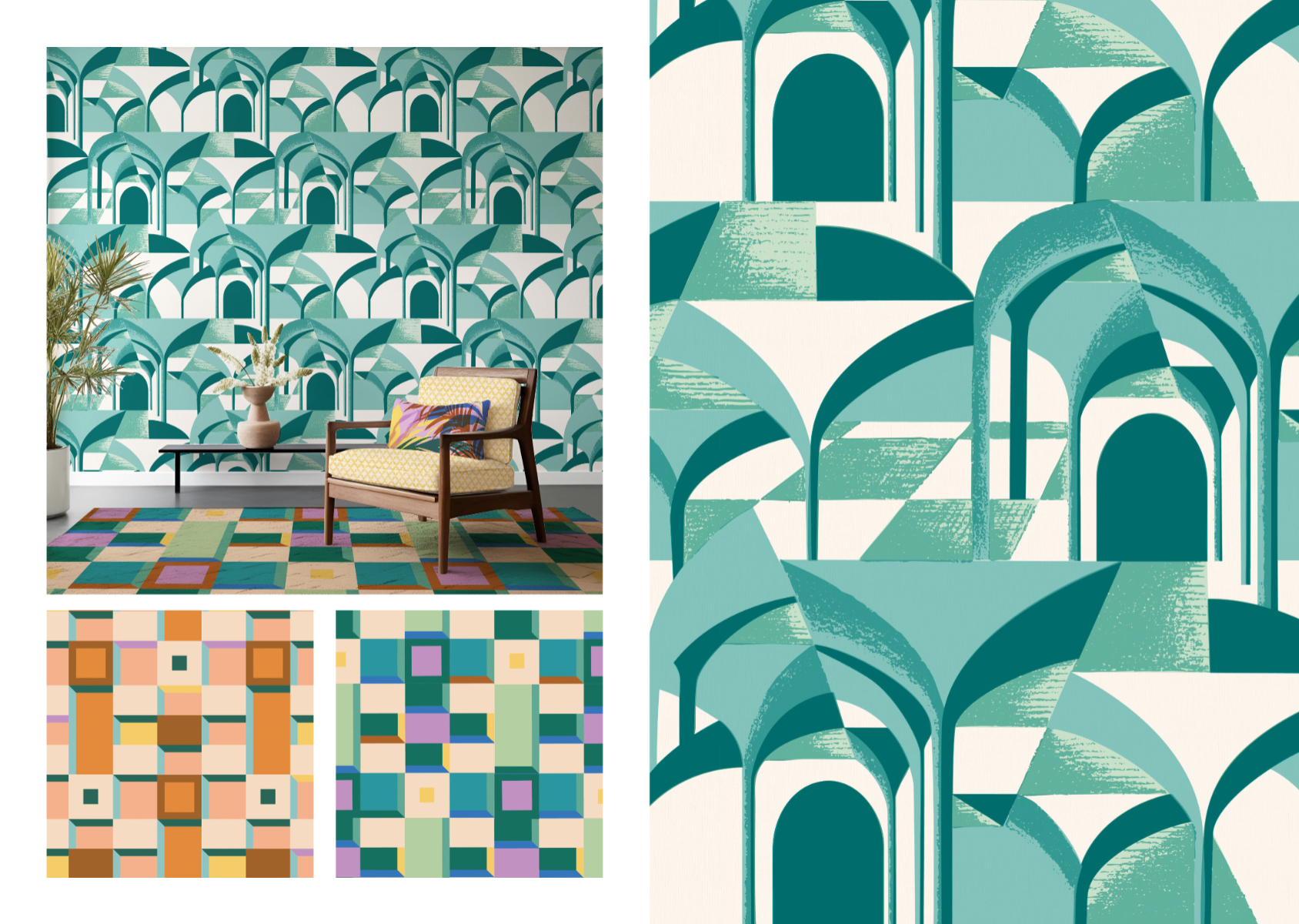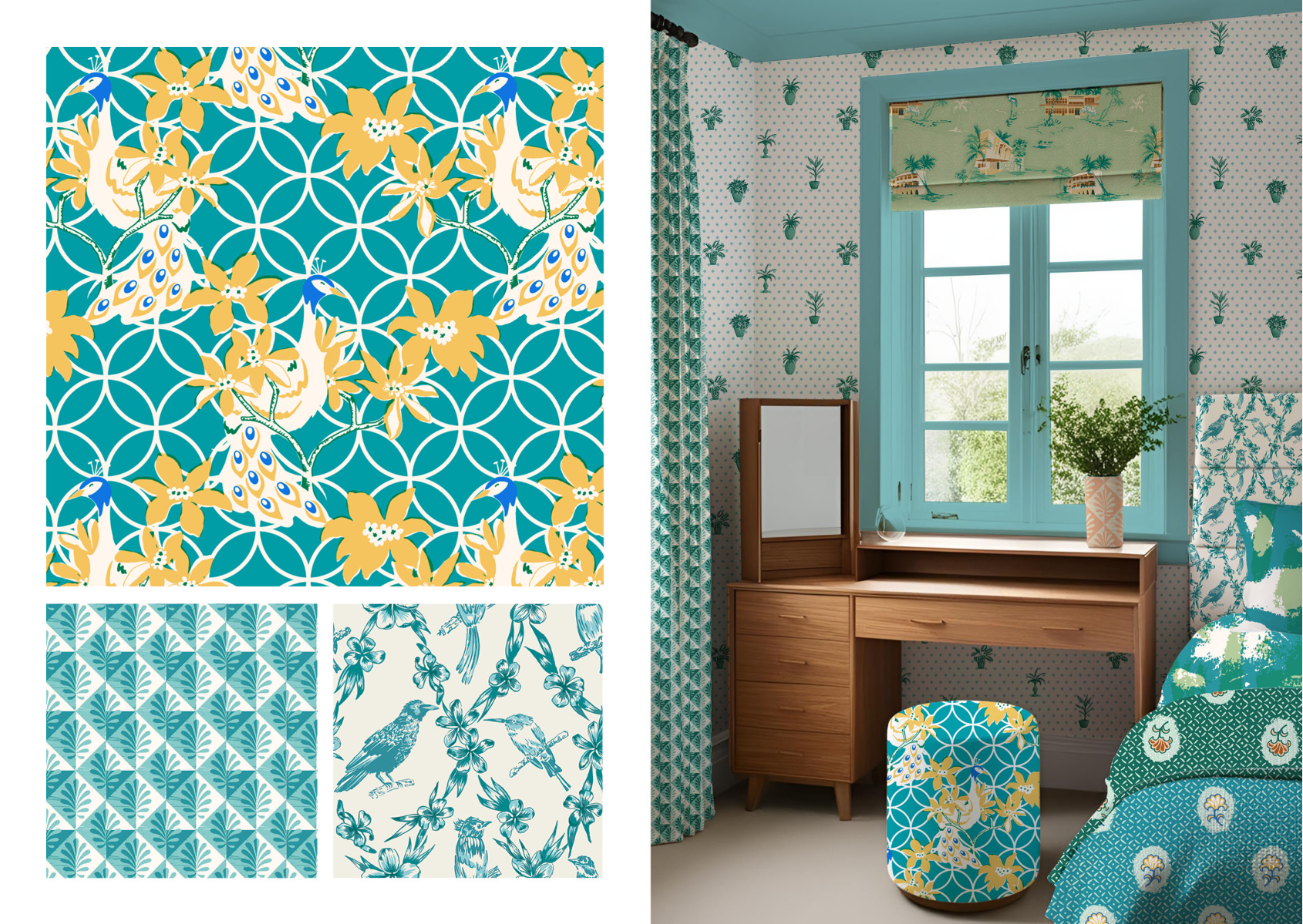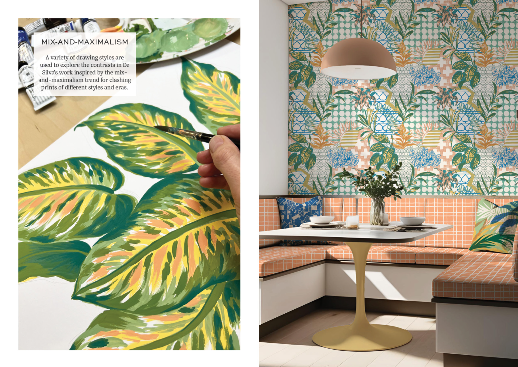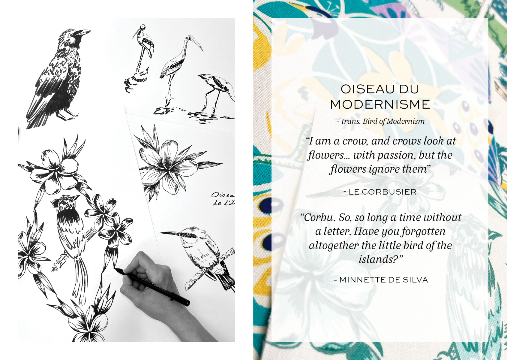 Celebrate the biophilic spaces designed by Sri Lankan architect Minnette De Silva - one of the first female architects to have her own practice in the 1940s - with this eclectic wallpaper & interior textiles collection. Explore the contrasts in her work; between geometric modernist forms, decorative features made by local artisans, and the lush tropical planting of her outdoor living spaces. Inspired by the grainy half-tone photographs and stylised architectural drawings & plans - that are sadly much of what remains of her work - this collection of wallpapers and hand-screenprinted fabrics mix artisanship and modernity. Influenced by mid-century prints and postcards, overprinting is explored to create secondary colours in a palette of peacock blues and clay pinks with pops of cobalt.