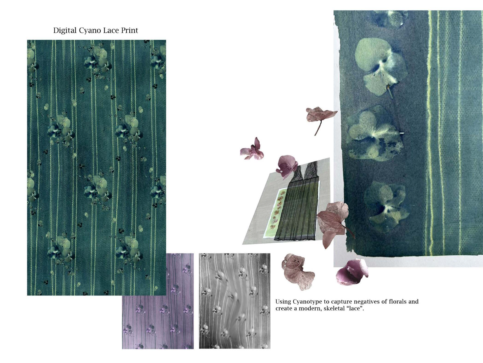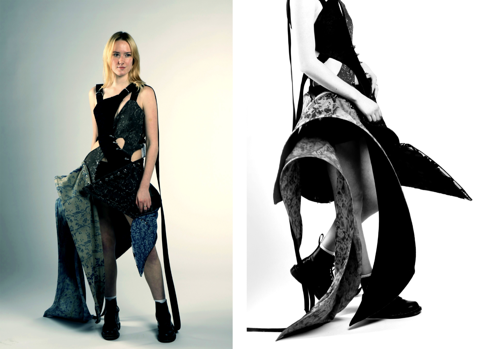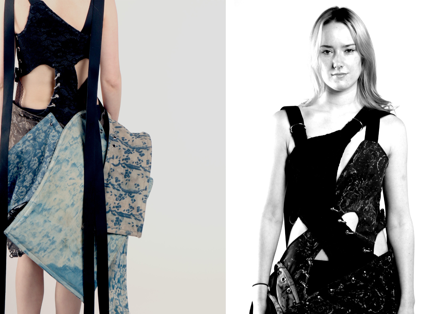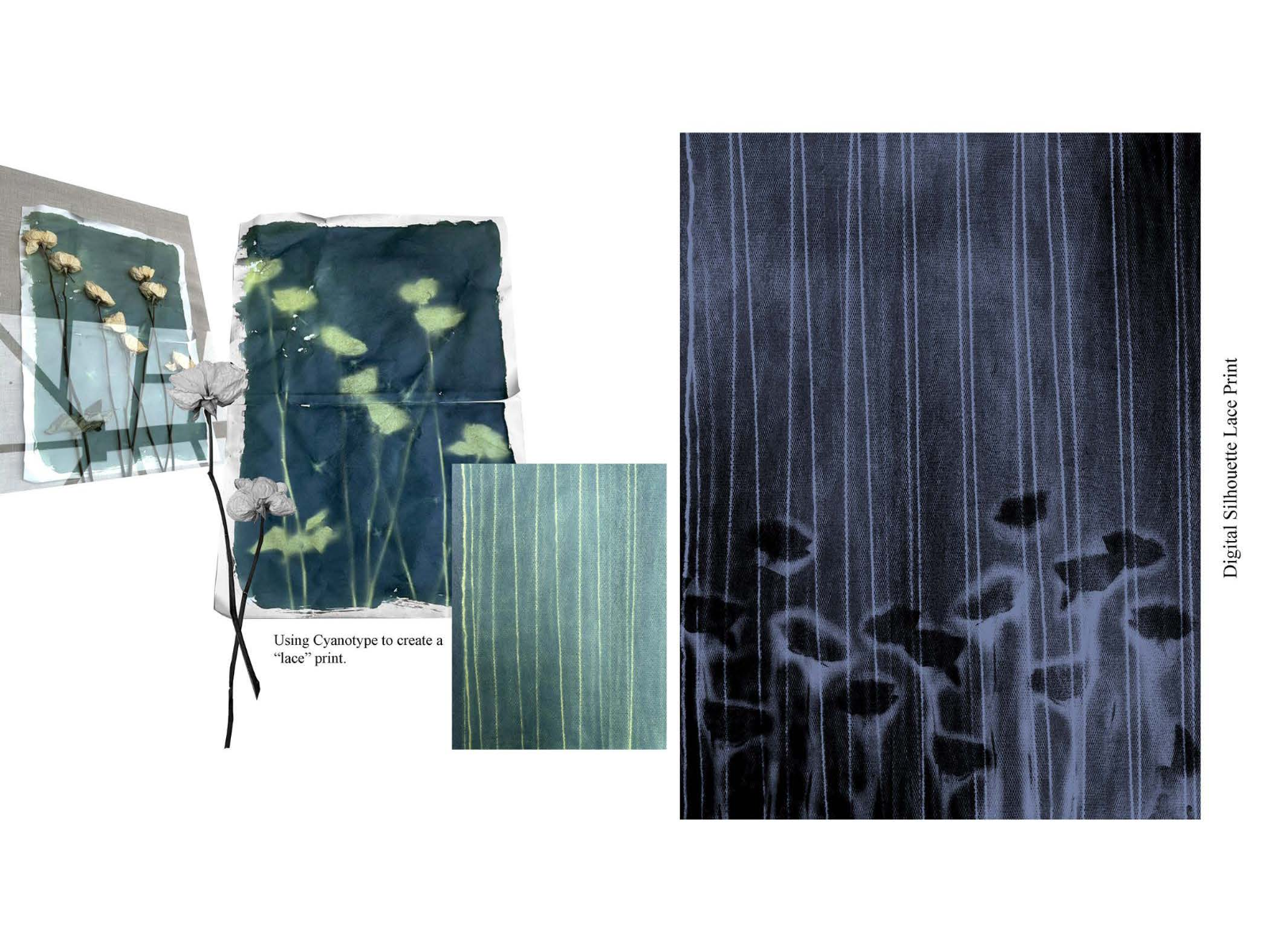 In the late 19th Century, pioneering women photographers, such as Julia Margaret Cameron, used shadow, light and chemical to create art. This project explored bringing those methods of manipulating light and shadow into fashion, redesigning the women's dress, also exploring the traditional chemical process of cyanotype, to design my silhouettes and prints. Whilst considering a women's place in the photography industry, I draw inspiration from the corset and crinoline, representing the restrictions faced by women in the arts industry, both then and now. I created this capsule collection with my passion for sustainability in mind, realizing my first look with deadstock and eco fabrics