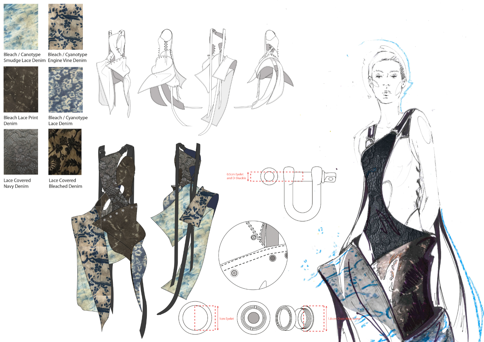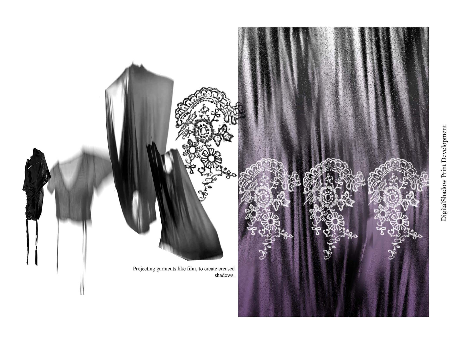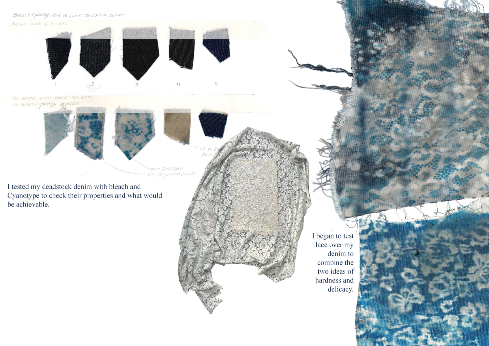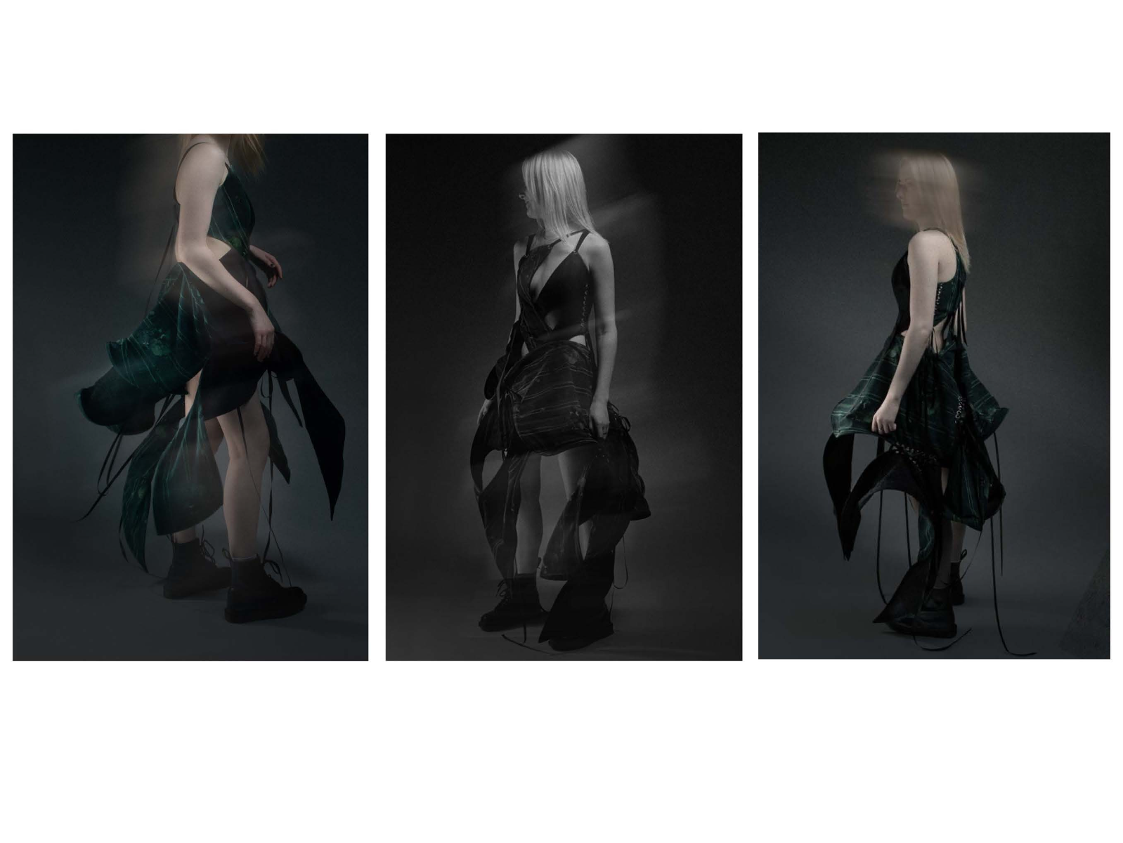 In the late 19th Century, pioneering women photographers, such as Julia Margaret Cameron, used shadow, light and chemical to create art. This project explored bringing those methods of manipulating light and shadow into fashion, redesigning the women's dress, also exploring the traditional chemical process of cyanotype, to design my silhouettes and prints. Whilst considering a women's place in the photography industry, I draw inspiration from the corset and crinoline, representing the restrictions faced by women in the arts industry, both then and now. I created this capsule collection with my passion for sustainability in mind, realizing my first look with deadstock and eco fabrics