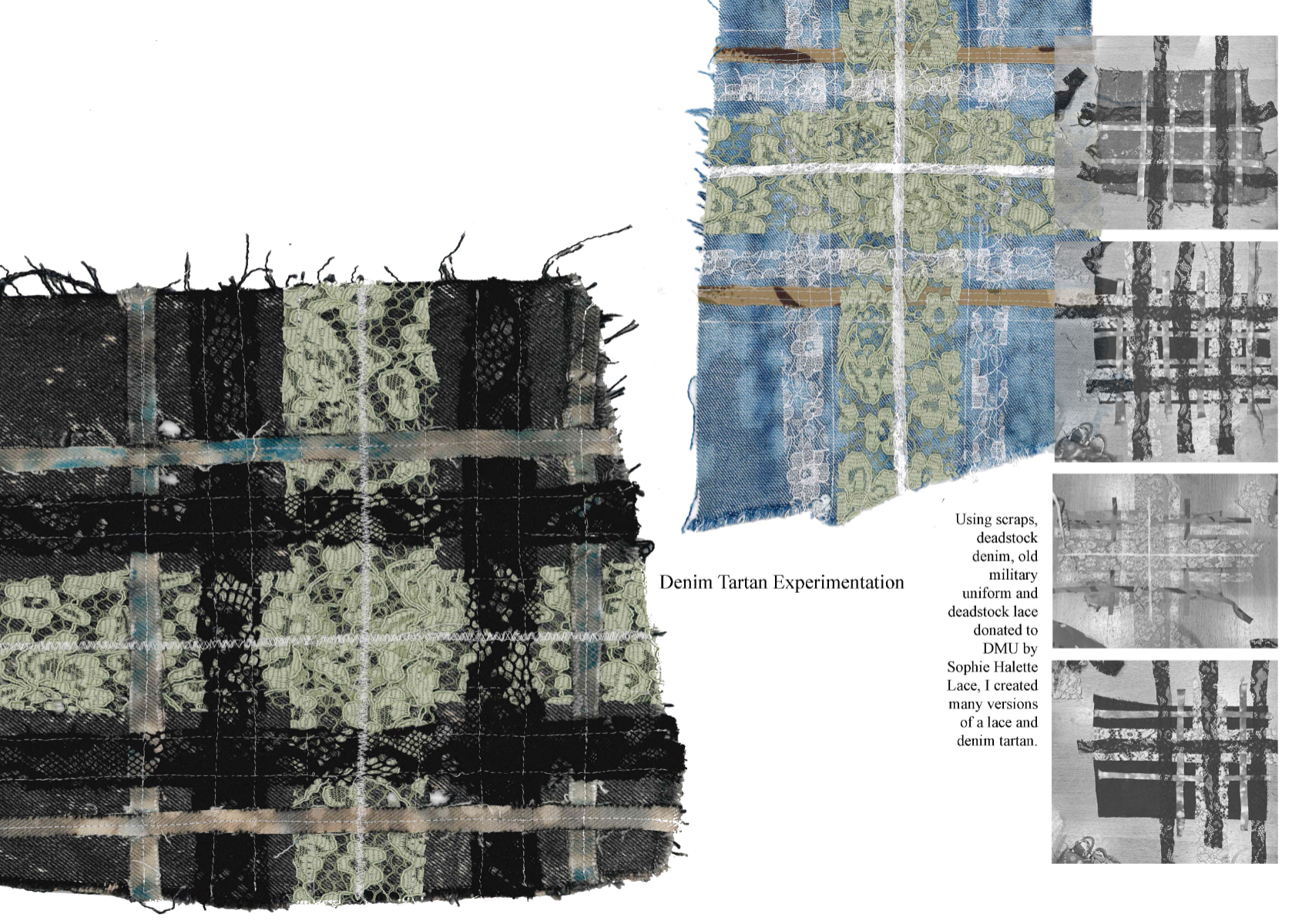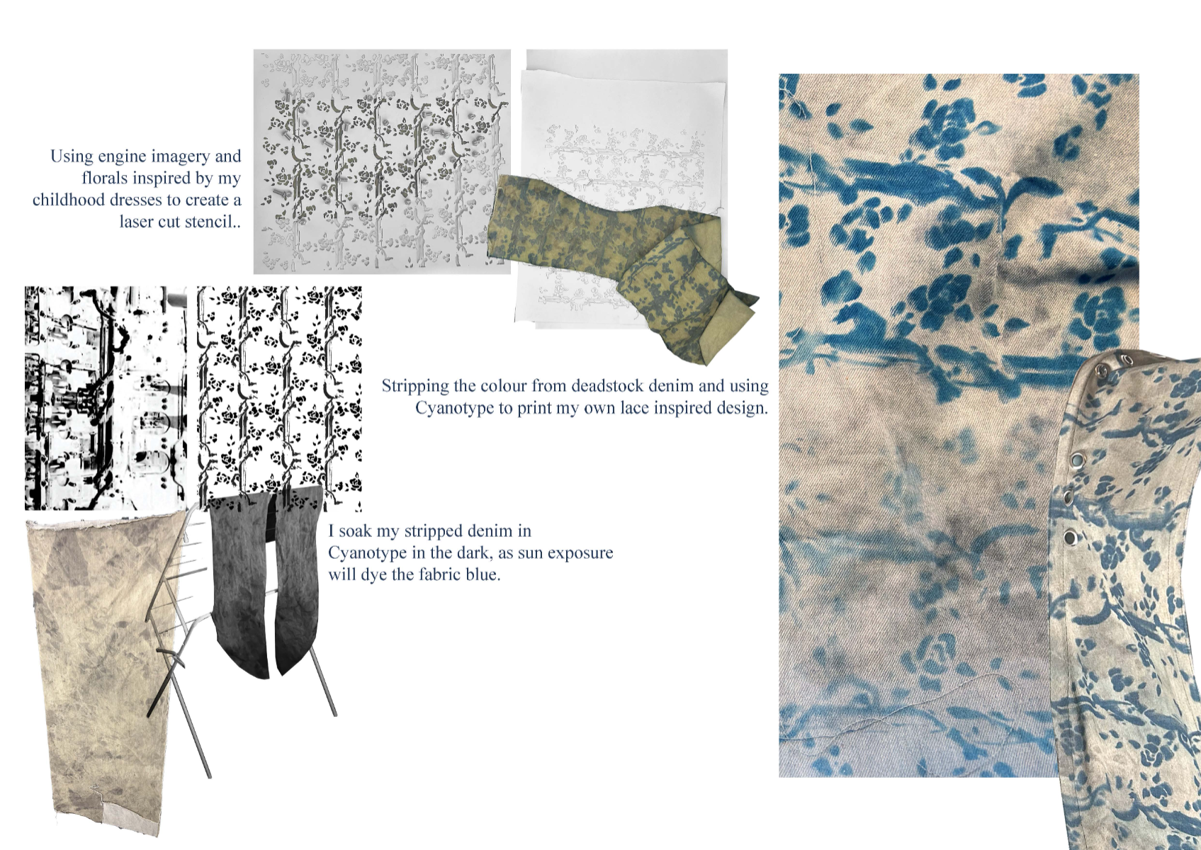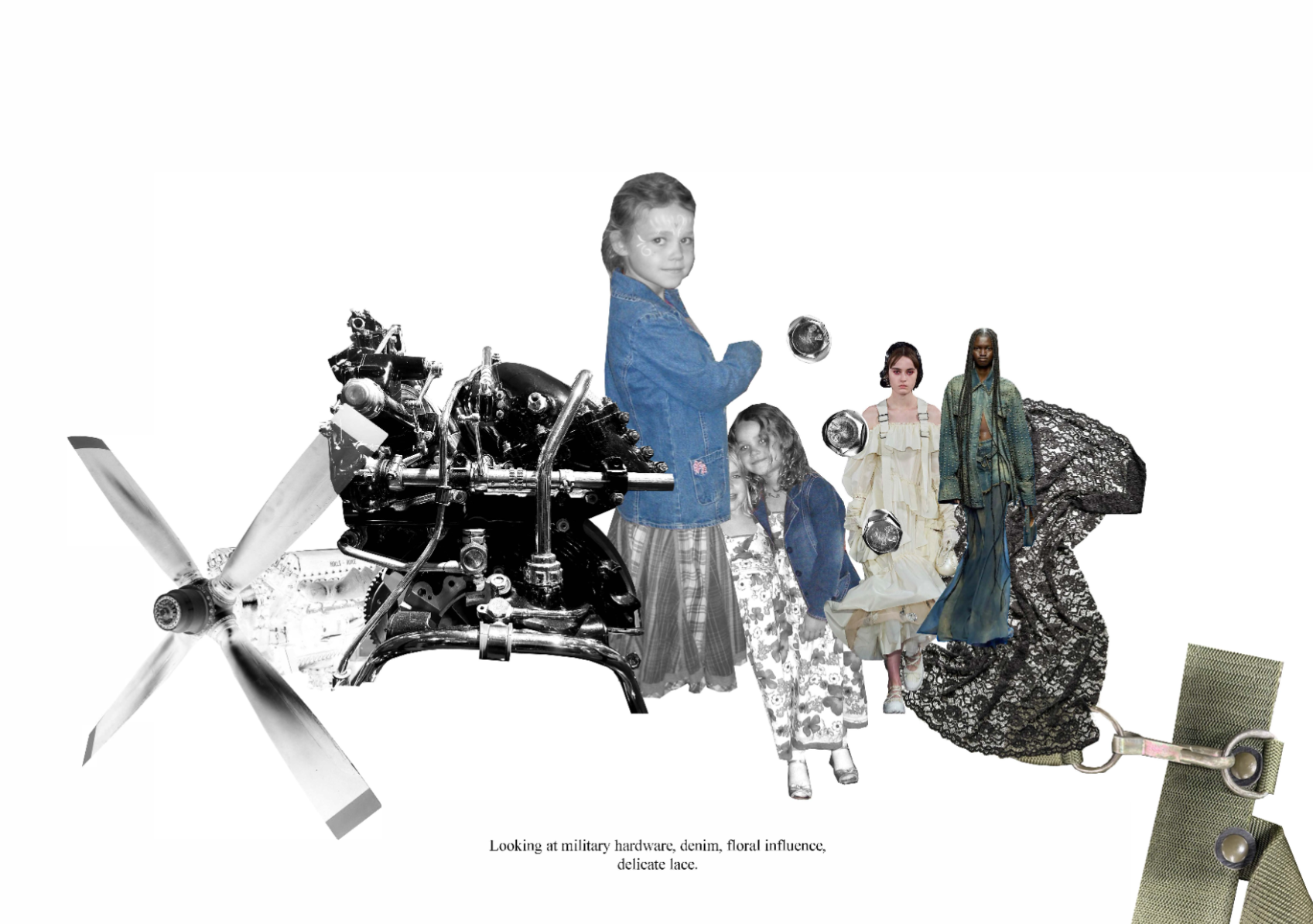 Drawn from my own experience of being raised in the military, I explore the connections between family, the uncertainty of constant movement and the delicacy of being a little girl amongst this. My dad, Martin, served 22 years as an Engineering Officer before he retired from the Royal Air Force. To begin my design process, I looked at my own clothes, florals, checks and denim, as well as military wear, its hard wear and the mechanics I was surrounded with growing up. Designing sustainably is always at the forefront of my mind, I began this project by using deadstock and second hand garments to experiment with.