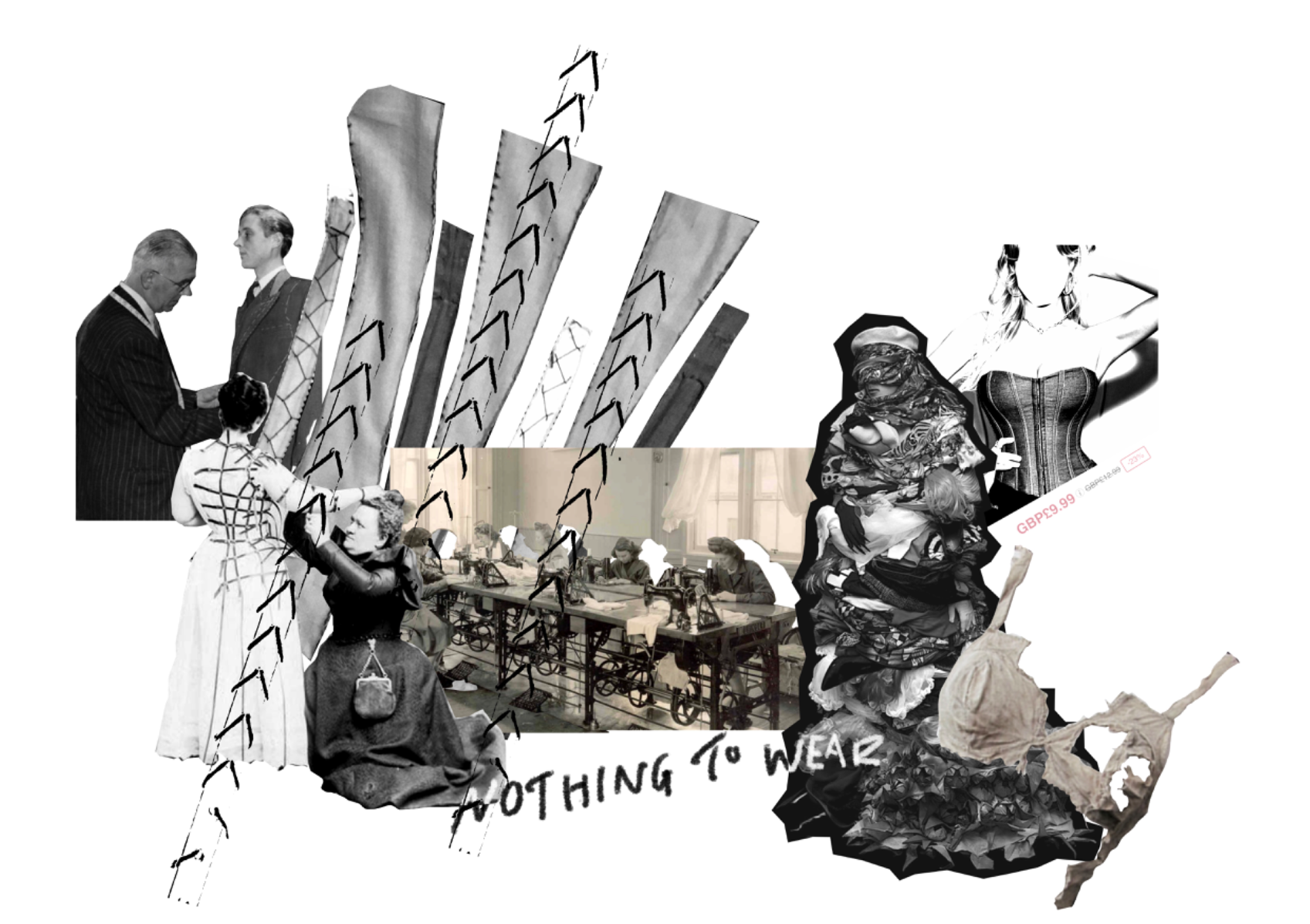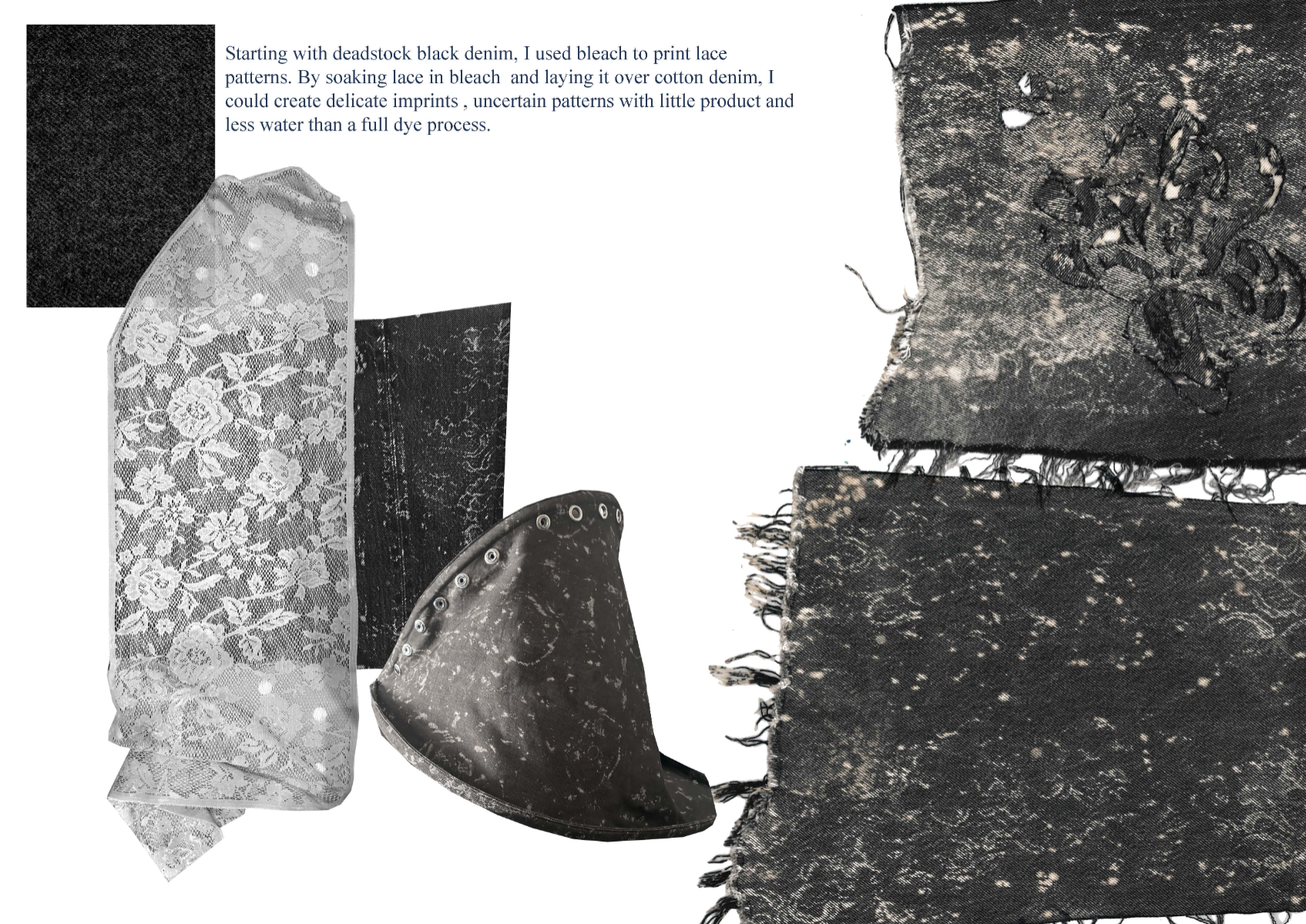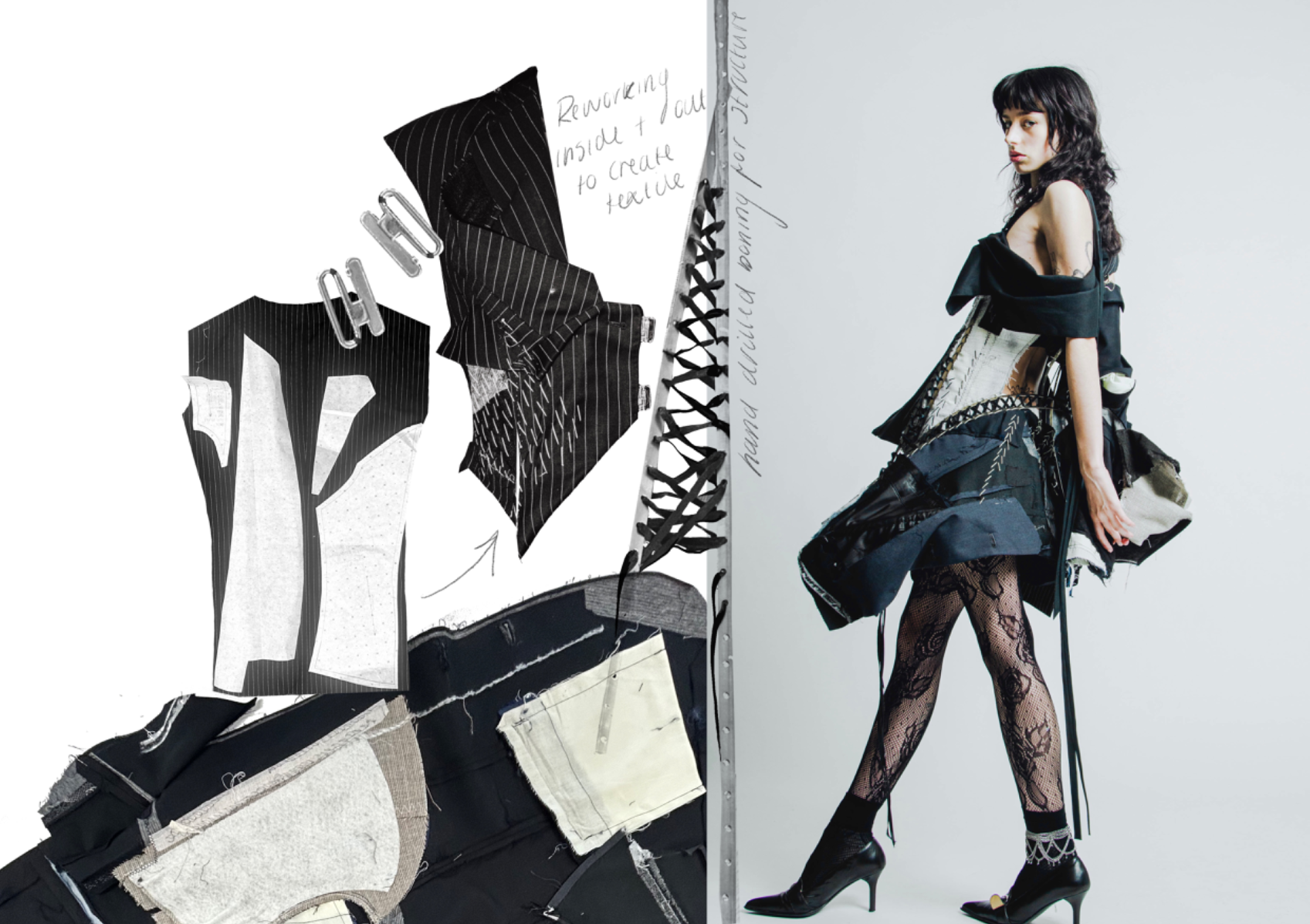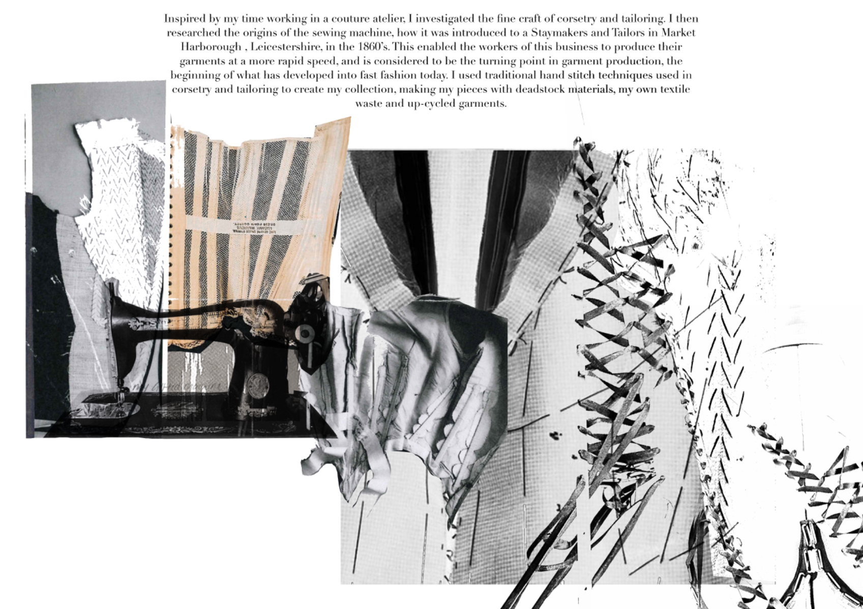 Inspired by my time working in a couture atelier, I investigated the fine craft of corsetry and tailoring. I then researched the origins of the sewing machine, how it was introduced to a Staymakers and Tailors in Market Harborough , Leicestershire, in the 1860’s. This enabled the workers of this business to produce their garments at a more rapid speed, and is considered to be the turning point in garment production, the beginning of what has developed into fast fashion today. I used traditional hand stitch techniques used in corsetry and tailoring to create my collection, making my pieces with deadstock materials, my own textile waste and up-cycled garments.
