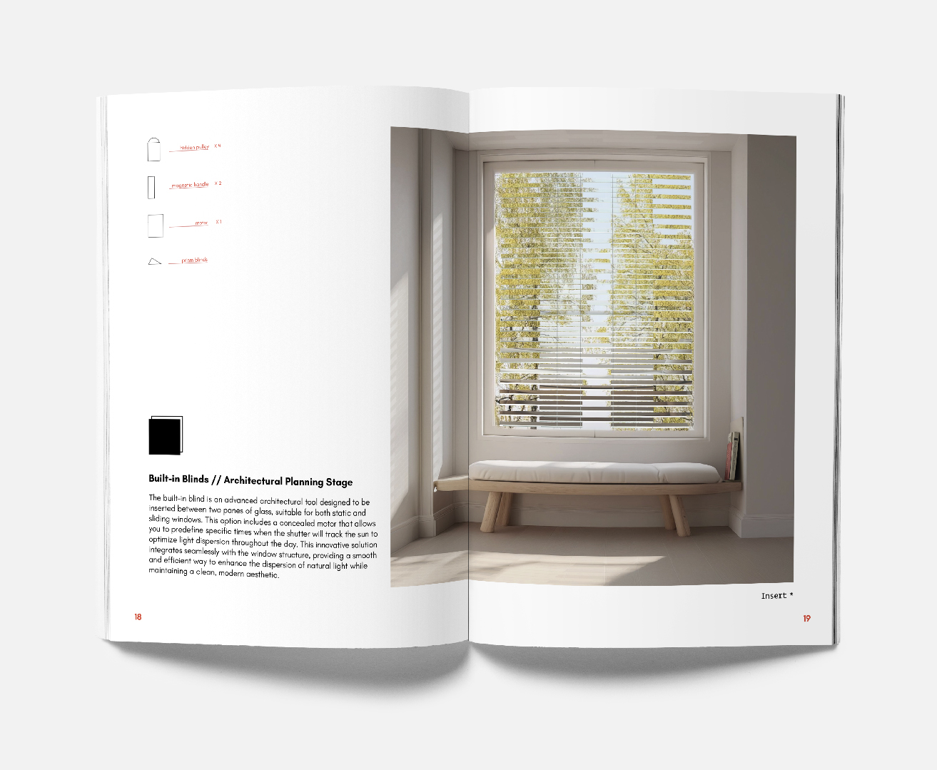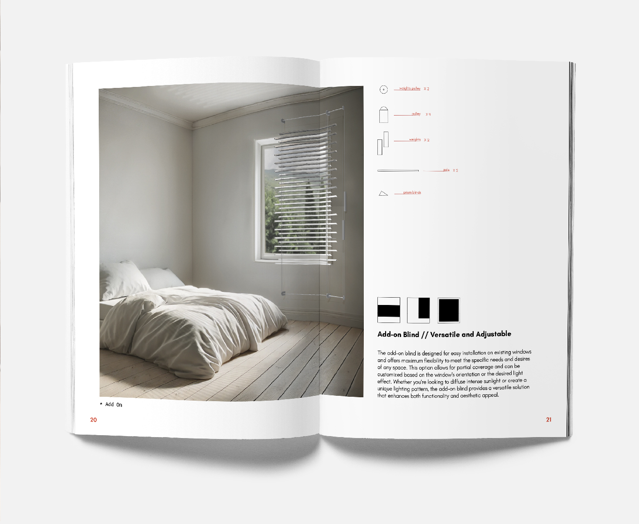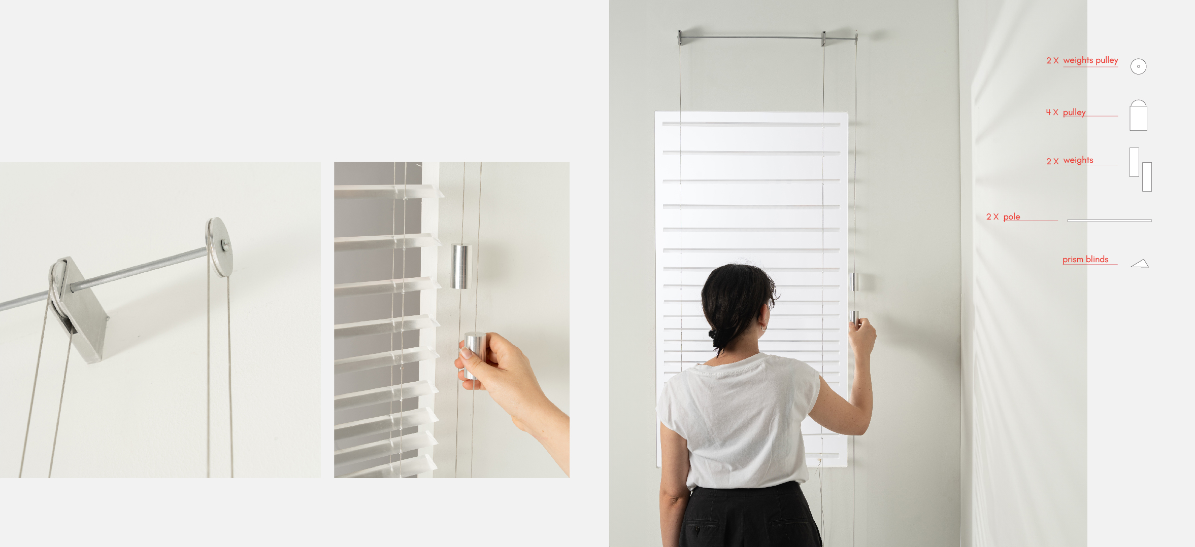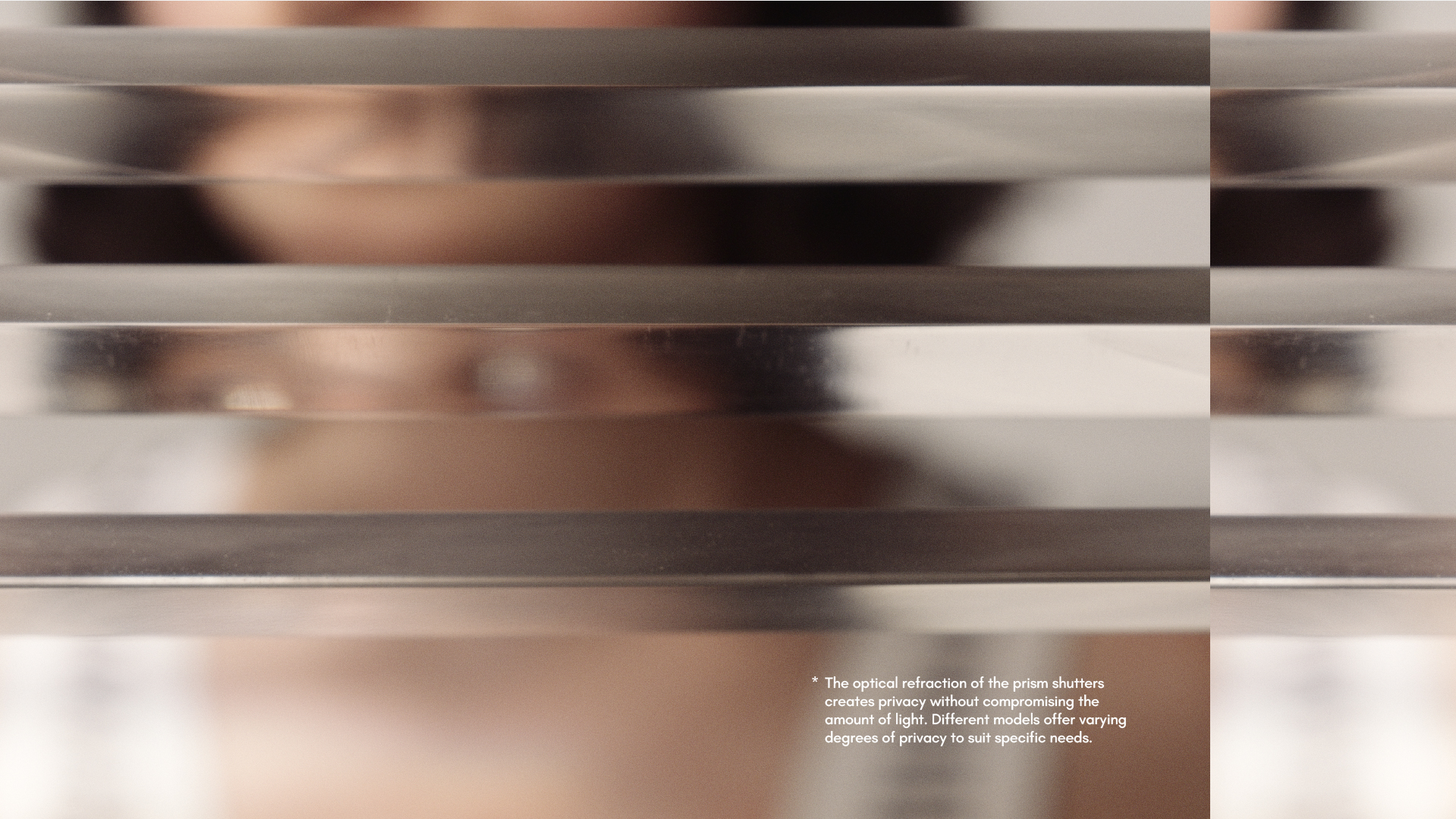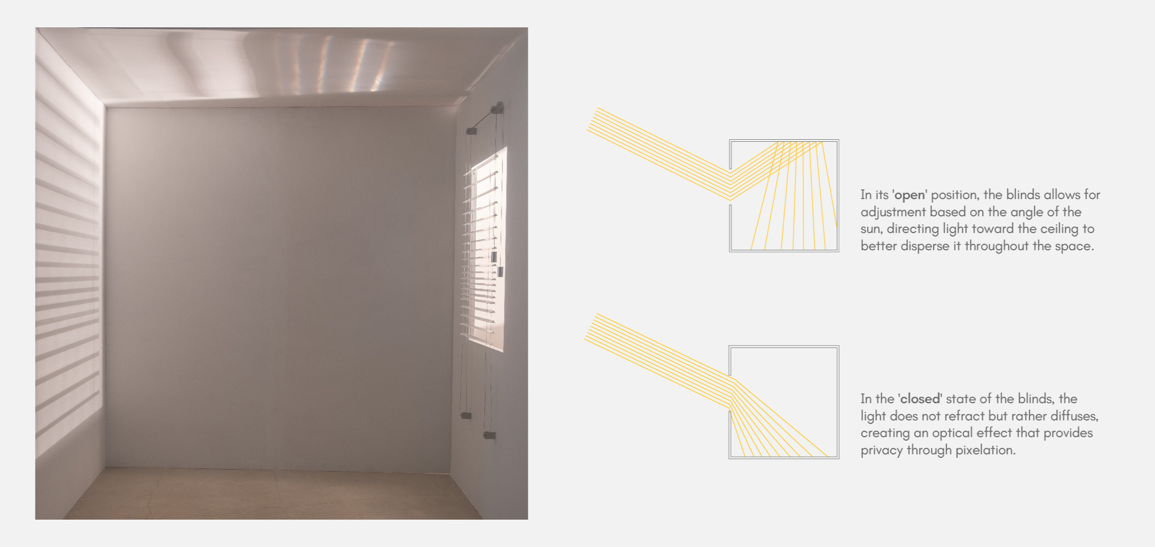 System of Blinds Directing Natural Light The human desire for natural light reflects our deep connection to nature and highlights its significance for our well-being. In bustling cities, where high-rises often block the sun, access to natural light has become a necessity and a precious privilege. This project aims to bring sunlight indoors and bridge the gap between the exterior and interior through a series of window dressings that maximize and diffuse the natural light in the room. Each blind model offers a unique way of manipulating light and can be adjusted based on the window’s orientation and the room’s specific needs. These blinds feature glass prisms that refract sunlight, directing it towards the ceiling to diffuse it throughout the space. The glass also pixelates the view from the window, ensuring privacy without compromising the light levels. The dynamic dialogue formed between the outside and the inside through the blinds, changes with the movement of the sun and echoes it inside.