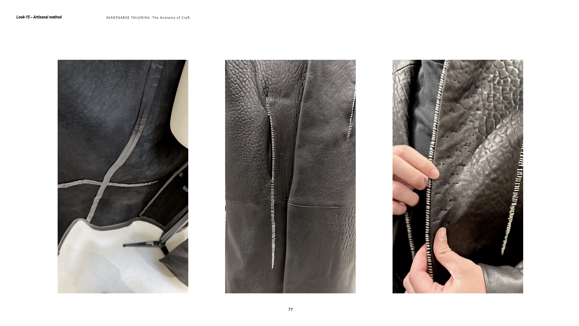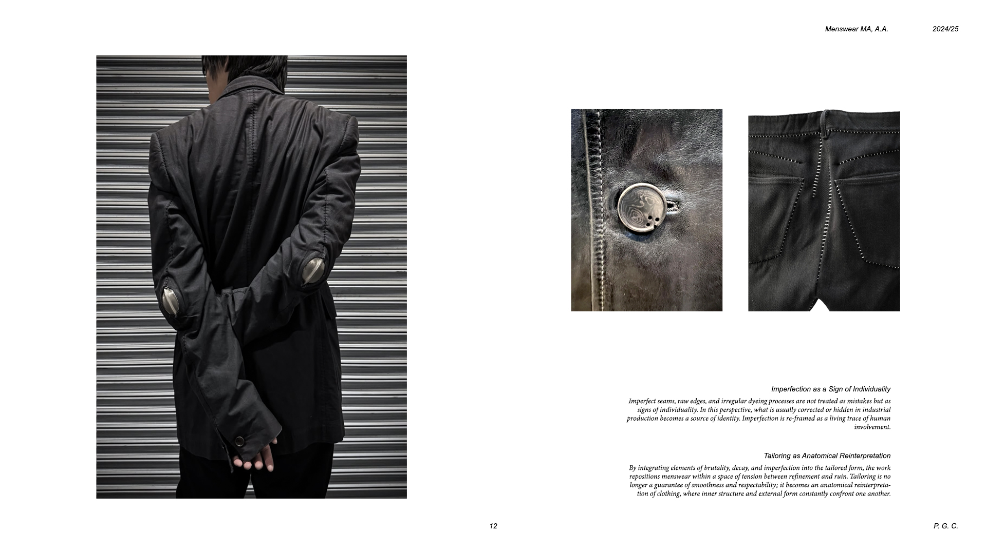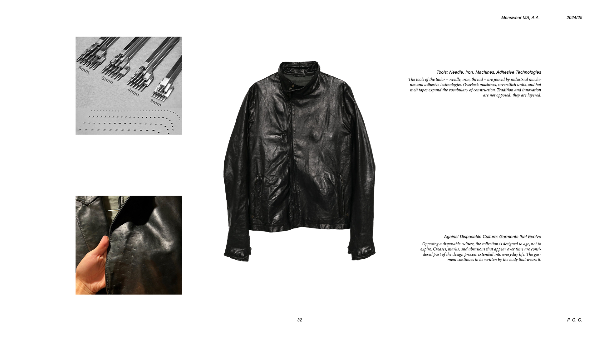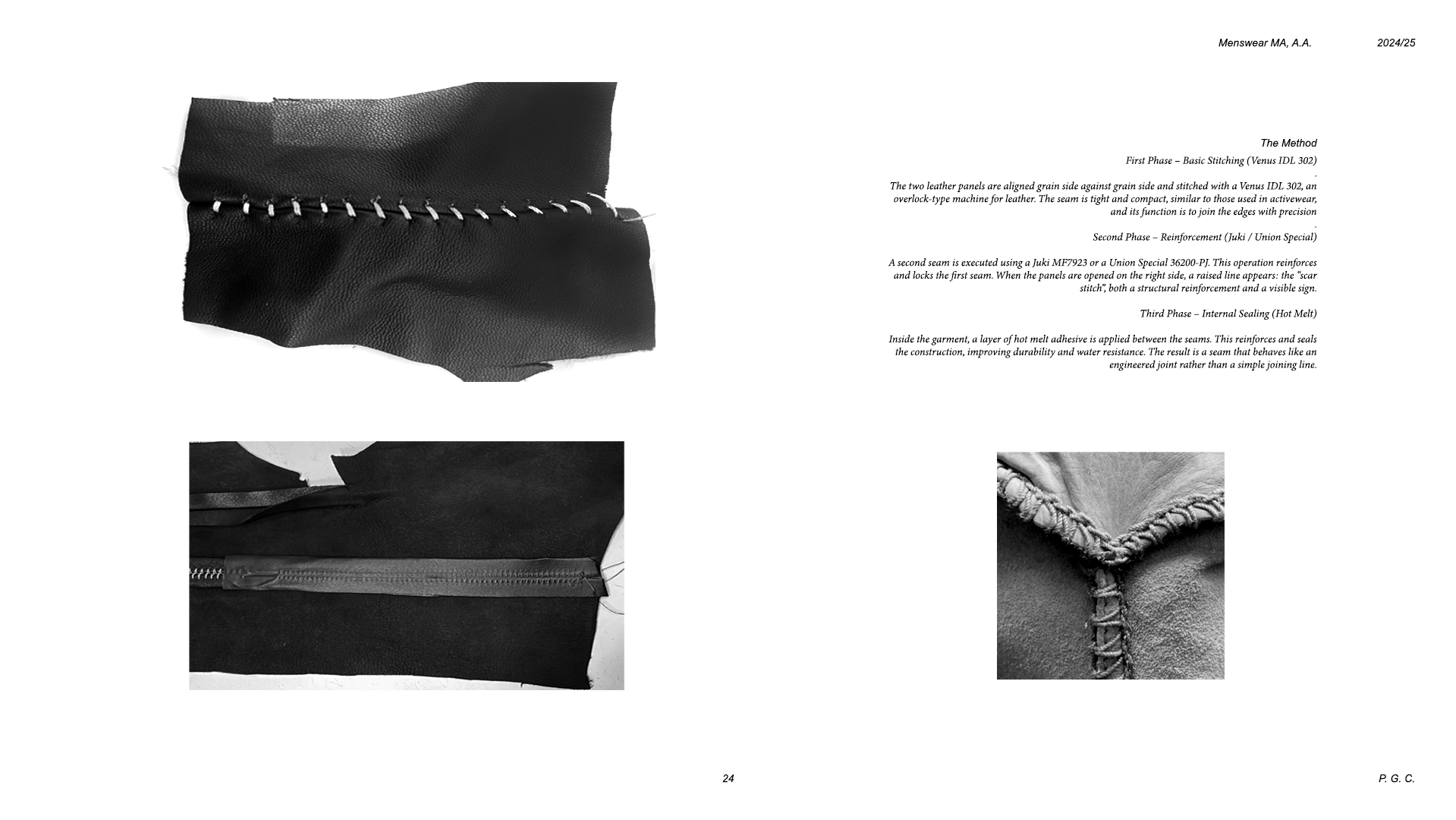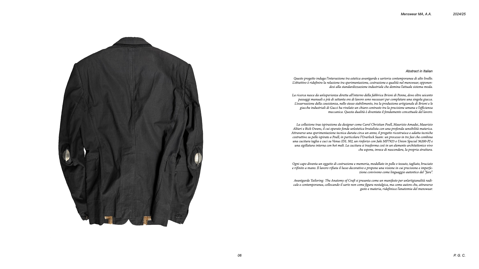 Abstract: This project investigates the intersection between avantgarde aesthetics and contemporary high-level tailoring. The aim is to redefine the relationship between experimentation, construction, and quality in menswear, while resisting the industrial standardisation that dominates the current fashion system. The research originates from direct experience inside Brioni's factory in Penne, where more than six hundred manual steps and over seventy hours of work are required to complete a single jacket. Observing the coexistence of Brioni's artisanal production and Gucci's industrial jackets within the same facility revealed a clear contrast between human precision and mechanical efficiency. This duality became the conceptual foundation of the work. The collection draws inspiration from designers such as Carol Christian Poell, Maurizio Amadei, Maurizio Altieri, and Rick Owens, whose practices merge brutalist aesthetics with deep material sensi-tivity. Through a year-long technical investigation, the project reconstructs and adapts Poell-inspired construction techniques on leather, in particular the Overlock Seam: a three-step process combining overlock stitching on a Venus IDL 302, reinforcement with Juki MF7923 or Union Special 36200-PJ, and internal sealing with hot melt adhesive. This transforms the seam into a living architectural element that exposes, rather than hides, its own structure. Each garment becomes an object of construction and memory, shaped in leather or fabric, cut, burned, and hand-finished. The work rejects decorative luxury and proposes a vision in which precision and imperfection coexist as an authentic language of making. Avantgarde Tailoring: The Anatomy of Craft stands as a manifesto for radical and contemporary craftsmanship, positioning the tailor not as a nostalgic figure, but as a contemporary author who, through gesture and material, redefines the anatomy of menswear.