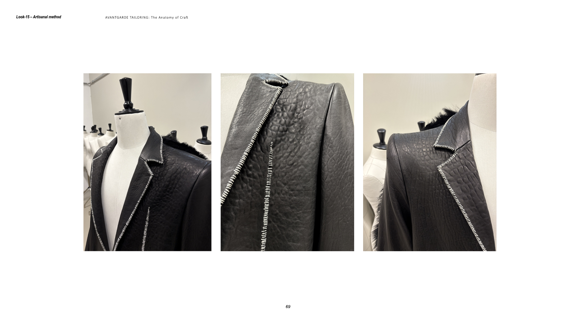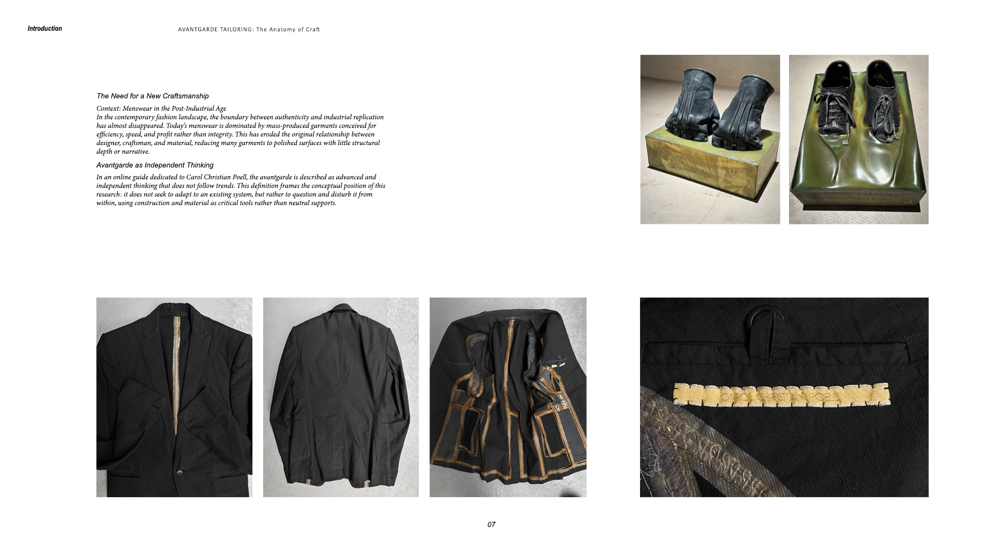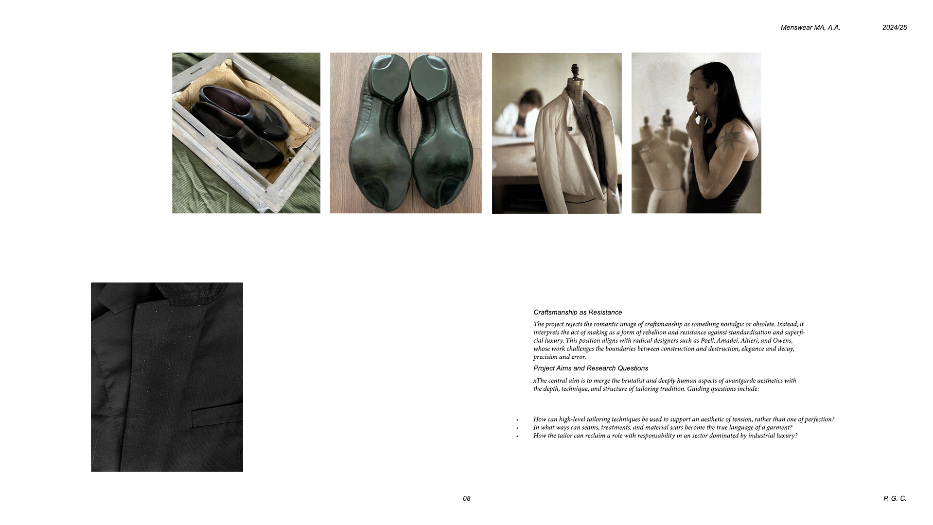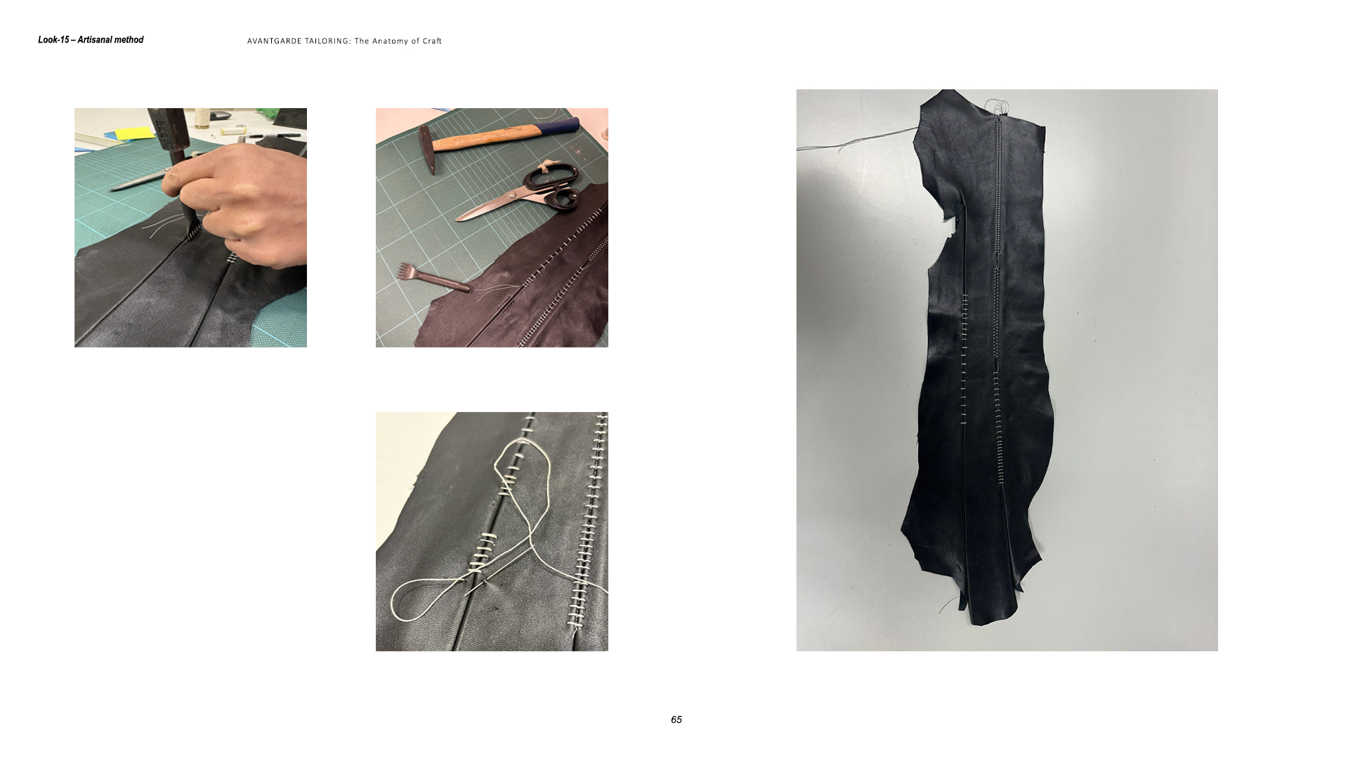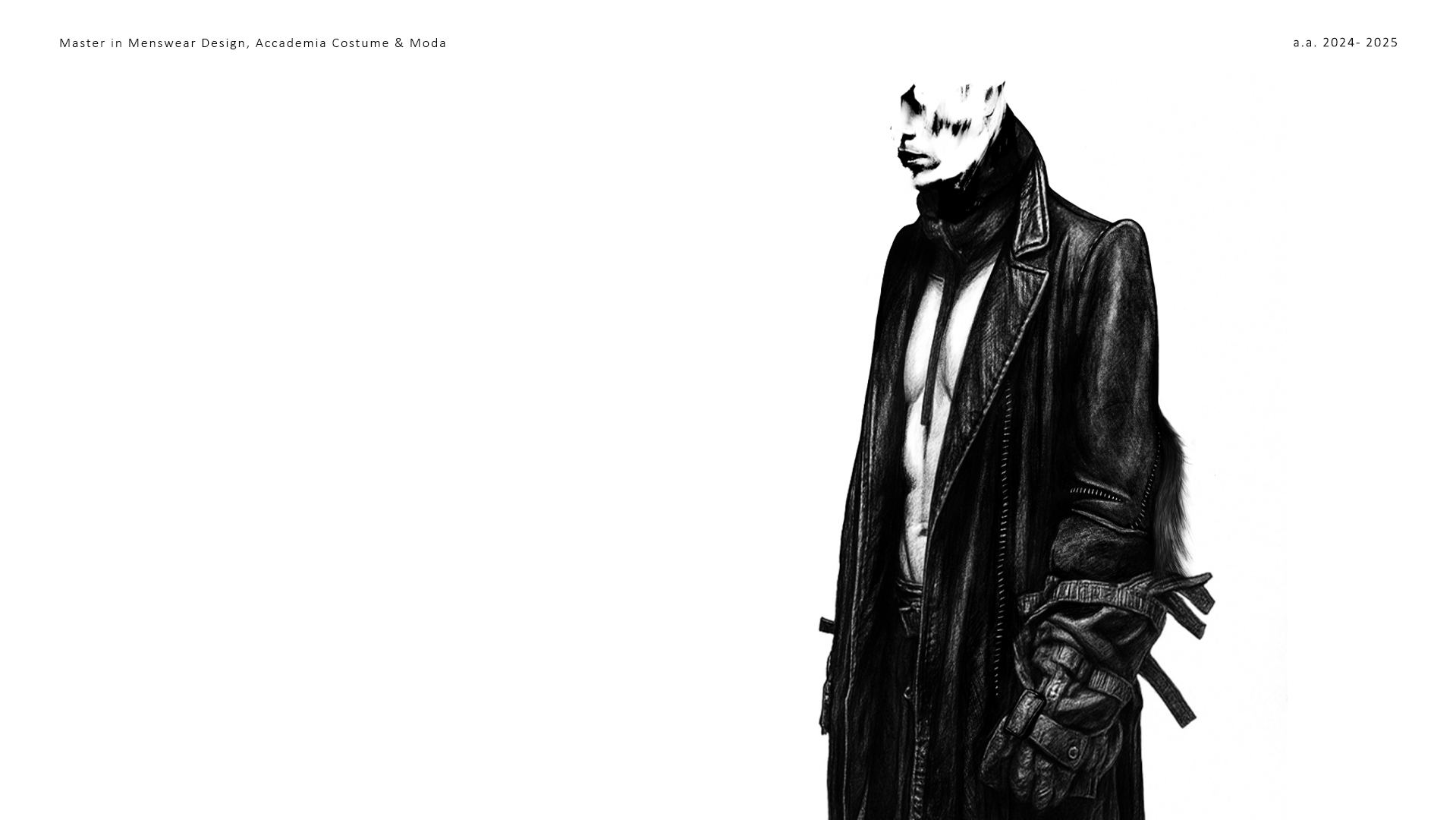 Abstract: This project investigates the intersection between avantgarde aesthetics and contemporary high-level tailoring. The aim is to redefine the relationship between experimentation, construction, and quality in menswear, while resisting the industrial standardisation that dominates the current fashion system. The research originates from direct experience inside Brioni's factory in Penne, where more than six hundred manual steps and over seventy hours of work are required to complete a single jacket. Observing the coexistence of Brioni's artisanal production and Gucci's industrial jackets within the same facility revealed a clear contrast between human precision and mechanical efficiency. This duality became the conceptual foundation of the work. The collection draws inspiration from designers such as Carol Christian Poell, Maurizio Amadei, Maurizio Altieri, and Rick Owens, whose practices merge brutalist aesthetics with deep material sensi-tivity. Through a year-long technical investigation, the project reconstructs and adapts Poell-inspired construction techniques on leather, in particular the Overlock Seam: a three-step process combining overlock stitching on a Venus IDL 302, reinforcement with Juki MF7923 or Union Special 36200-PJ, and internal sealing with hot melt adhesive. This transforms the seam into a living architectural element that exposes, rather than hides, its own structure. Each garment becomes an object of construction and memory, shaped in leather or fabric, cut, burned, and hand-finished. The work rejects decorative luxury and proposes a vision in which precision and imperfection coexist as an authentic language of making. Avantgarde Tailoring: The Anatomy of Craft stands as a manifesto for radical and contemporary craftsmanship, positioning the tailor not as a nostalgic figure, but as a contemporary author who, through gesture and material, redefines the anatomy of menswear.