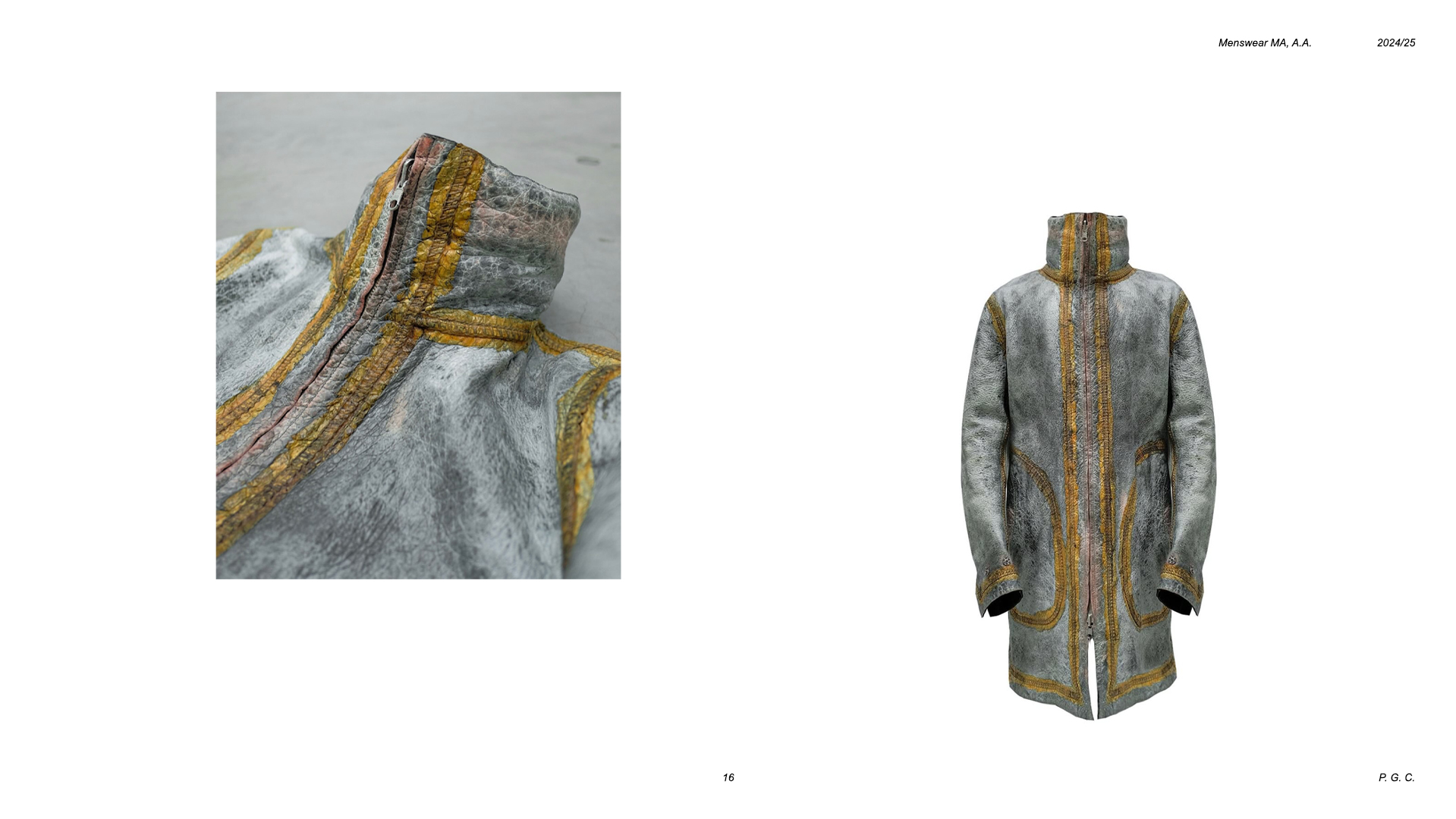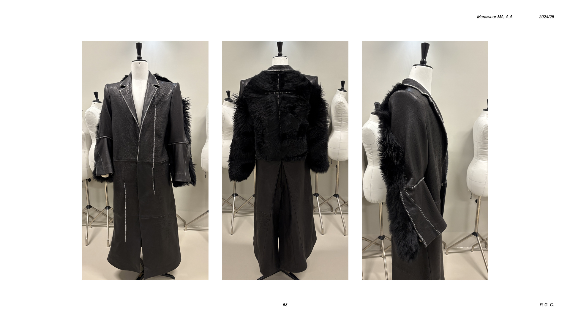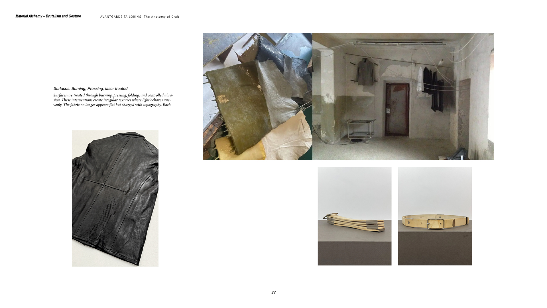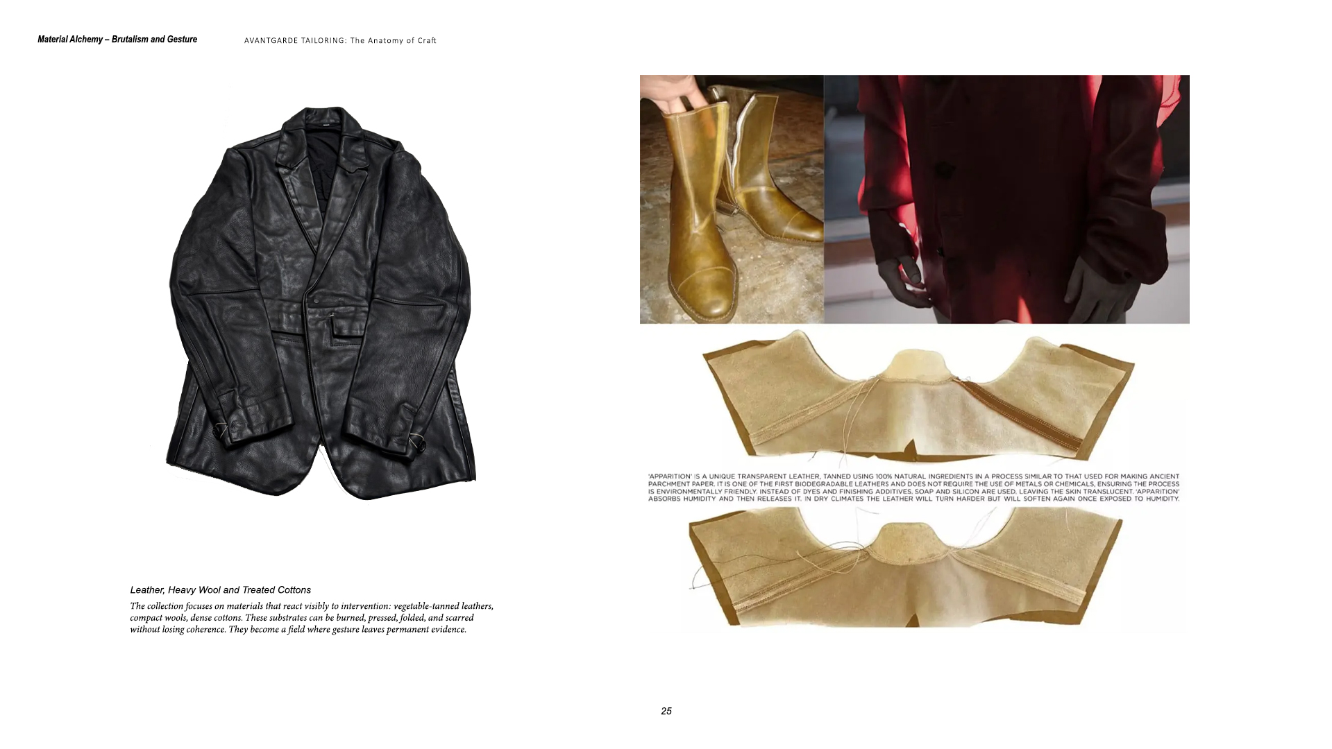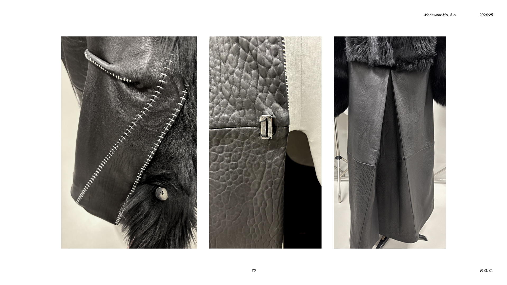 Abstract: This project investigates the intersection between avantgarde aesthetics and contemporary high-level tailoring. The aim is to redefine the relationship between experimentation, construction, and quality in menswear, while resisting the industrial standardisation that dominates the current fashion system. The research originates from direct experience inside Brioni's factory in Penne, where more than six hundred manual steps and over seventy hours of work are required to complete a single jacket. Observing the coexistence of Brioni's artisanal production and Gucci's industrial jackets within the same facility revealed a clear contrast between human precision and mechanical efficiency. This duality became the conceptual foundation of the work. The collection draws inspiration from designers such as Carol Christian Poell, Maurizio Amadei, Maurizio Altieri, and Rick Owens, whose practices merge brutalist aesthetics with deep material sensi-tivity. Through a year-long technical investigation, the project reconstructs and adapts Poell-inspired construction techniques on leather, in particular the Overlock Seam: a three-step process combining overlock stitching on a Venus IDL 302, reinforcement with Juki MF7923 or Union Special 36200-PJ, and internal sealing with hot melt adhesive. This transforms the seam into a living architectural element that exposes, rather than hides, its own structure. Each garment becomes an object of construction and memory, shaped in leather or fabric, cut, burned, and hand-finished. The work rejects decorative luxury and proposes a vision in which precision and imperfection coexist as an authentic language of making. Avantgarde Tailoring: The Anatomy of Craft stands as a manifesto for radical and contemporary craftsmanship, positioning the tailor not as a nostalgic figure, but as a contemporary author who, through gesture and material, redefines the anatomy of menswear.