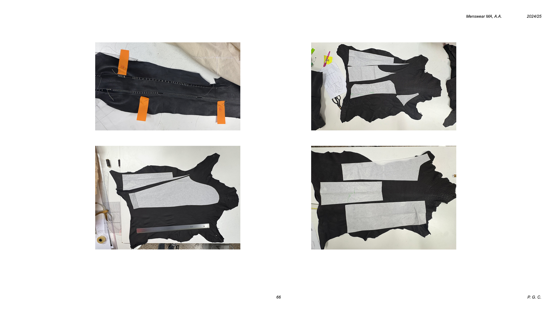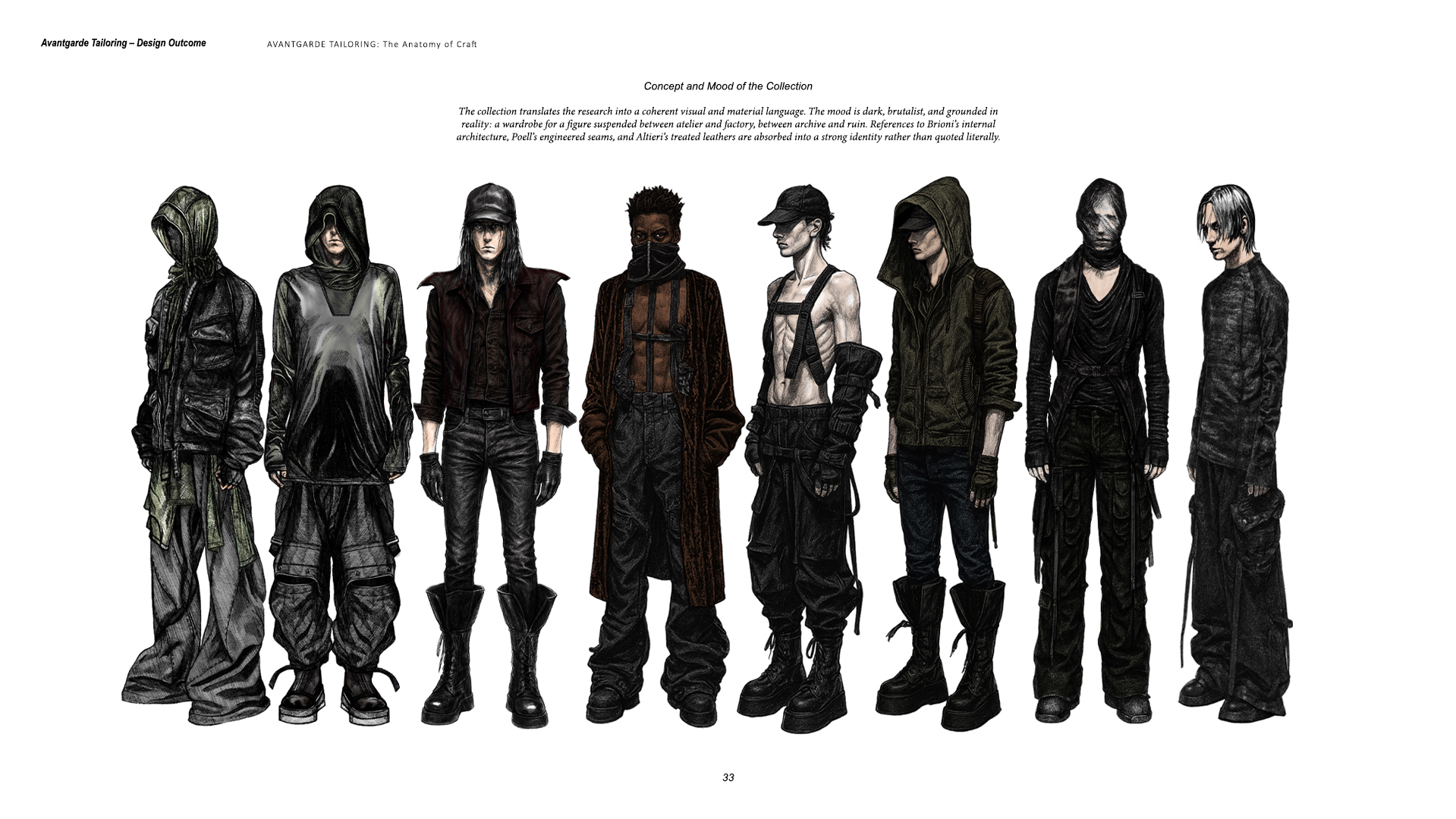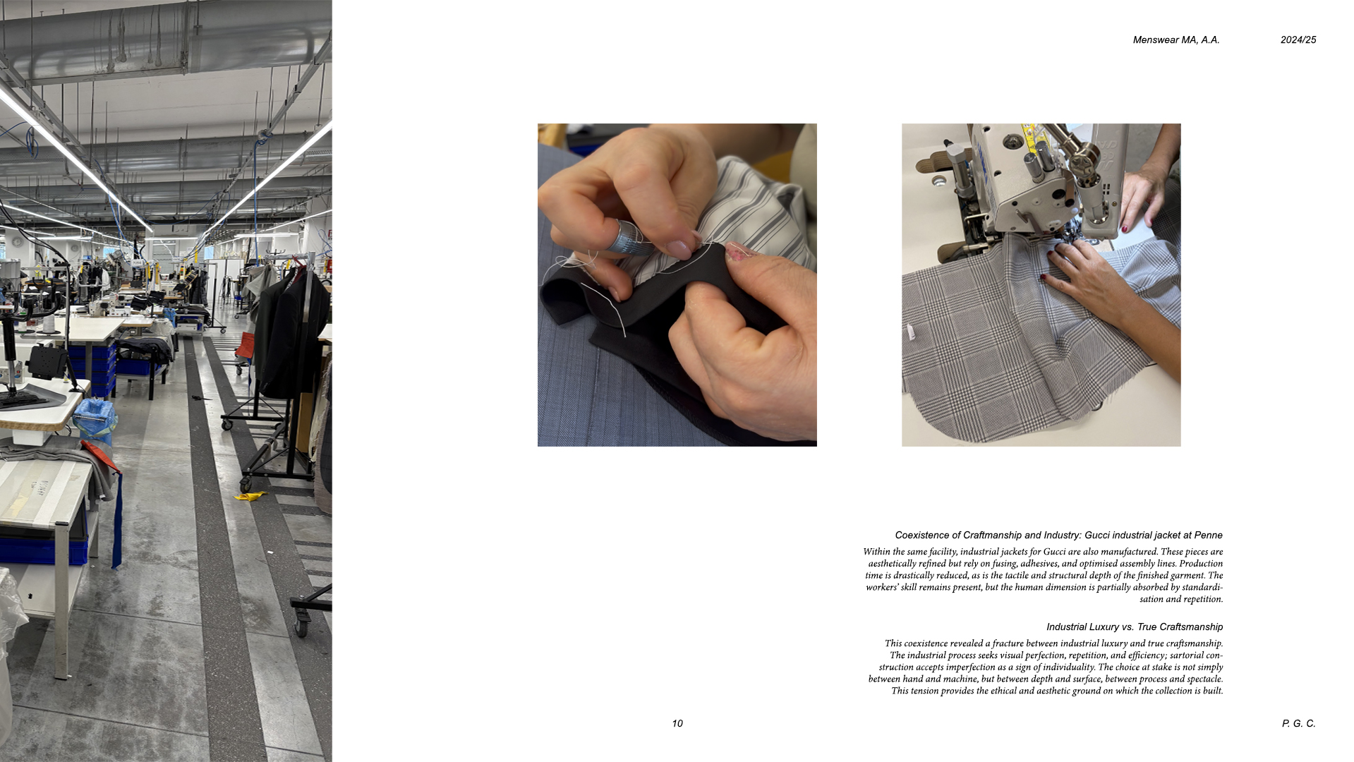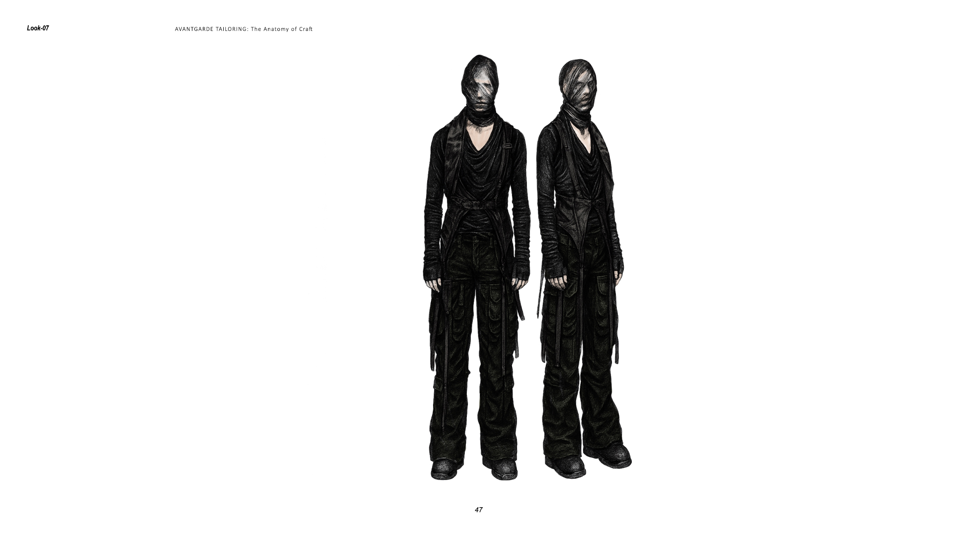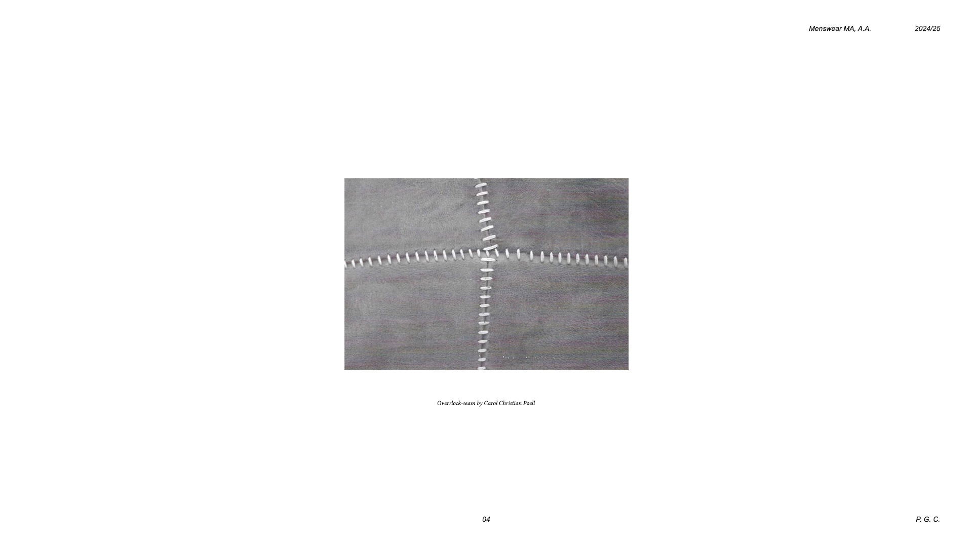 Abstract: This project investigates the intersection between avantgarde aesthetics and contemporary high-level tailoring. The aim is to redefine the relationship between experimentation, construction, and quality in menswear, while resisting the industrial standardisation that dominates the current fashion system. The research originates from direct experience inside Brioni's factory in Penne, where more than six hundred manual steps and over seventy hours of work are required to complete a single jacket. Observing the coexistence of Brioni's artisanal production and Gucci's industrial jackets within the same facility revealed a clear contrast between human precision and mechanical efficiency. This duality became the conceptual foundation of the work. The collection draws inspiration from designers such as Carol Christian Poell, Maurizio Amadei, Maurizio Altieri, and Rick Owens, whose practices merge brutalist aesthetics with deep material sensi-tivity. Through a year-long technical investigation, the project reconstructs and adapts Poell-inspired construction techniques on leather, in particular the Overlock Seam: a three-step process combining overlock stitching on a Venus IDL 302, reinforcement with Juki MF7923 or Union Special 36200-PJ, and internal sealing with hot melt adhesive. This transforms the seam into a living architectural element that exposes, rather than hides, its own structure. Each garment becomes an object of construction and memory, shaped in leather or fabric, cut, burned, and hand-finished. The work rejects decorative luxury and proposes a vision in which precision and imperfection coexist as an authentic language of making. Avantgarde Tailoring: The Anatomy of Craft stands as a manifesto for radical and contemporary craftsmanship, positioning the tailor not as a nostalgic figure, but as a contemporary author who, through gesture and material, redefines the anatomy of menswear.