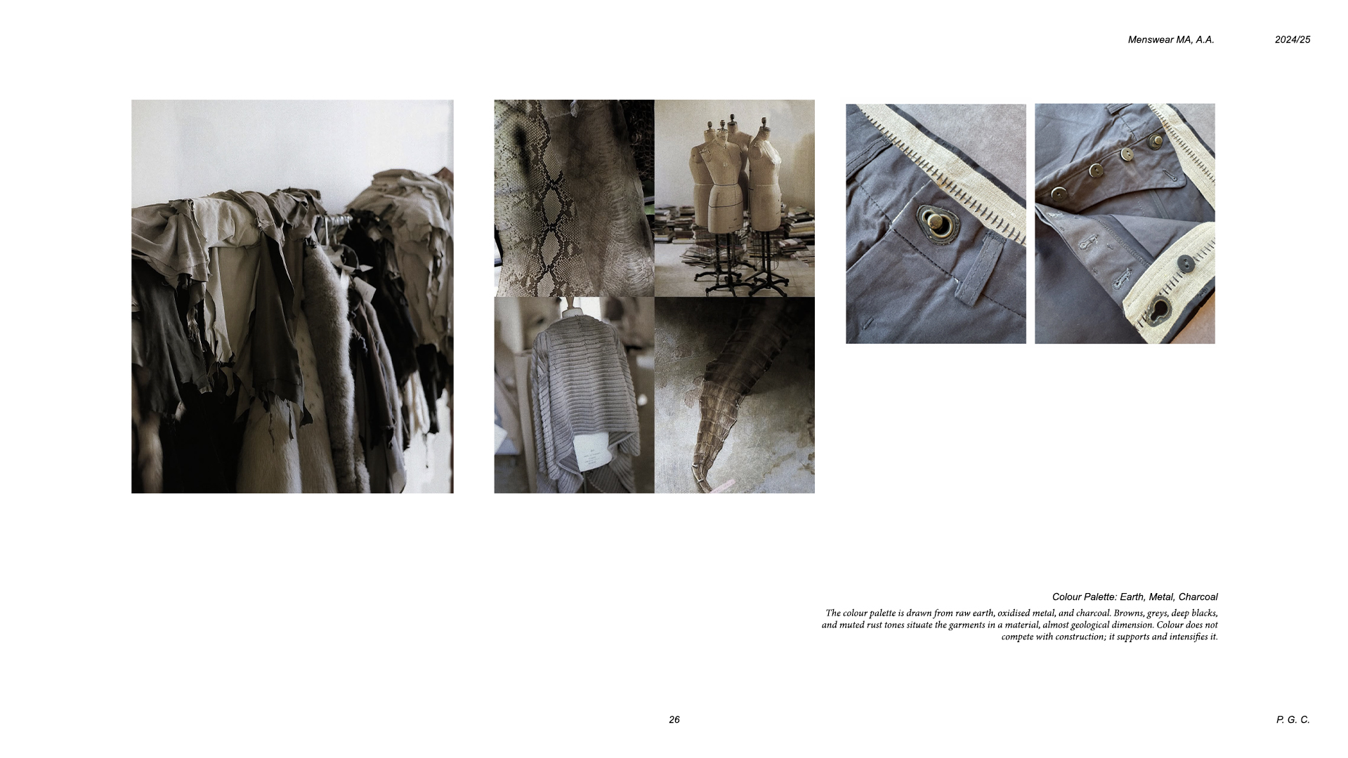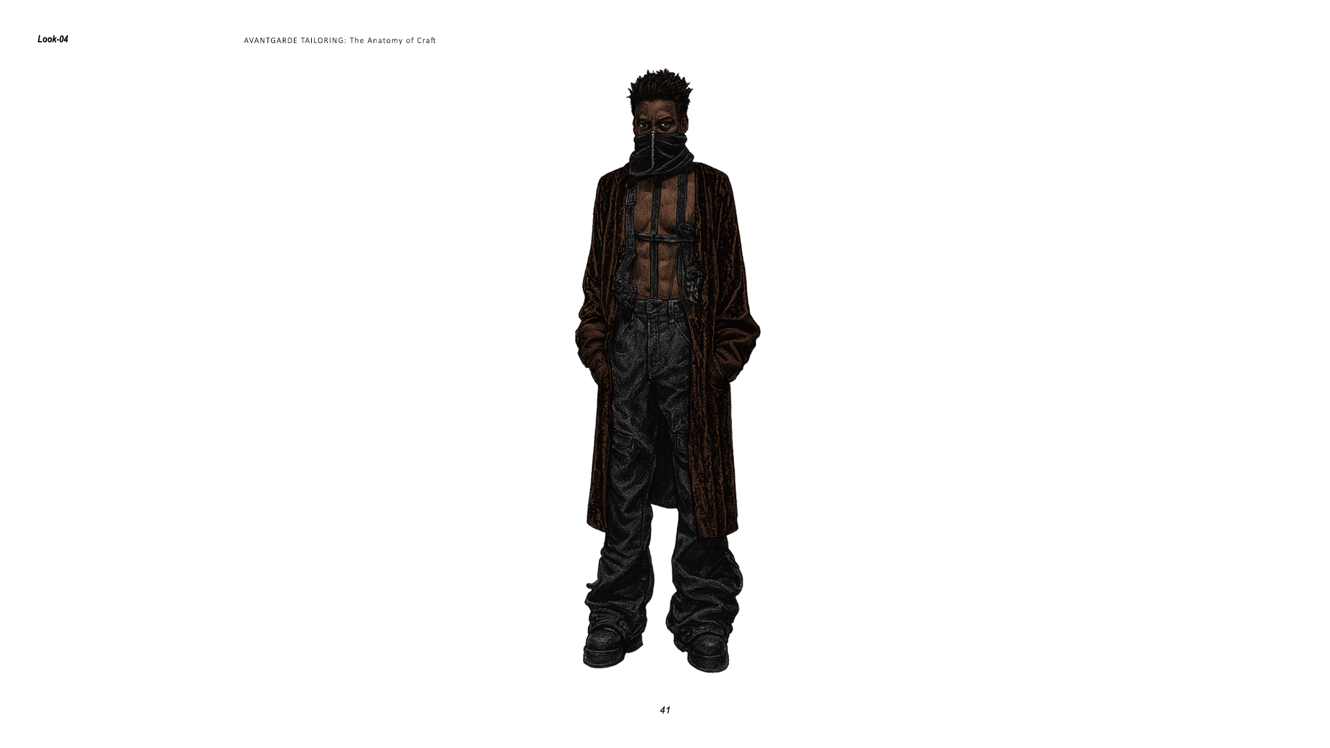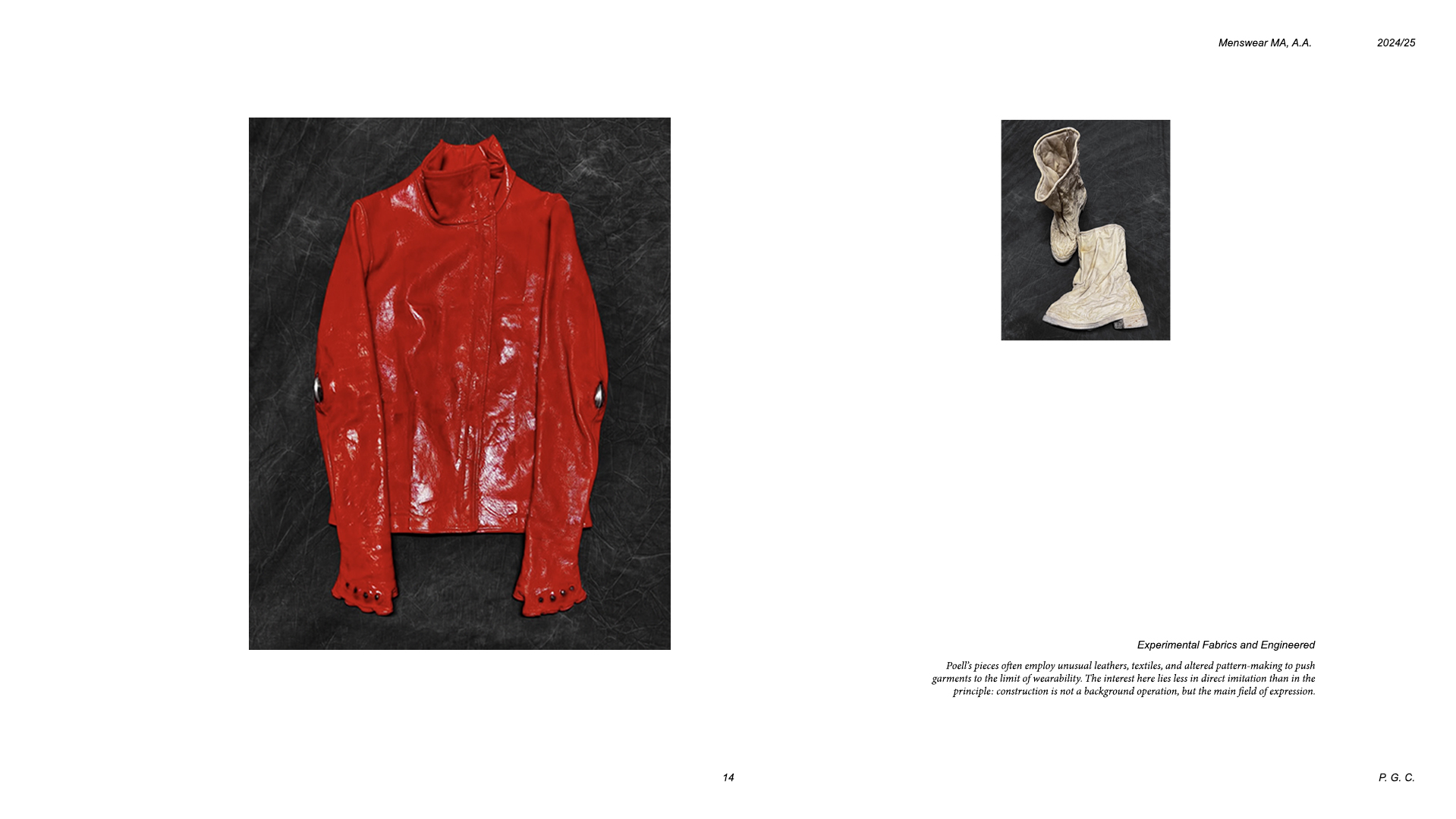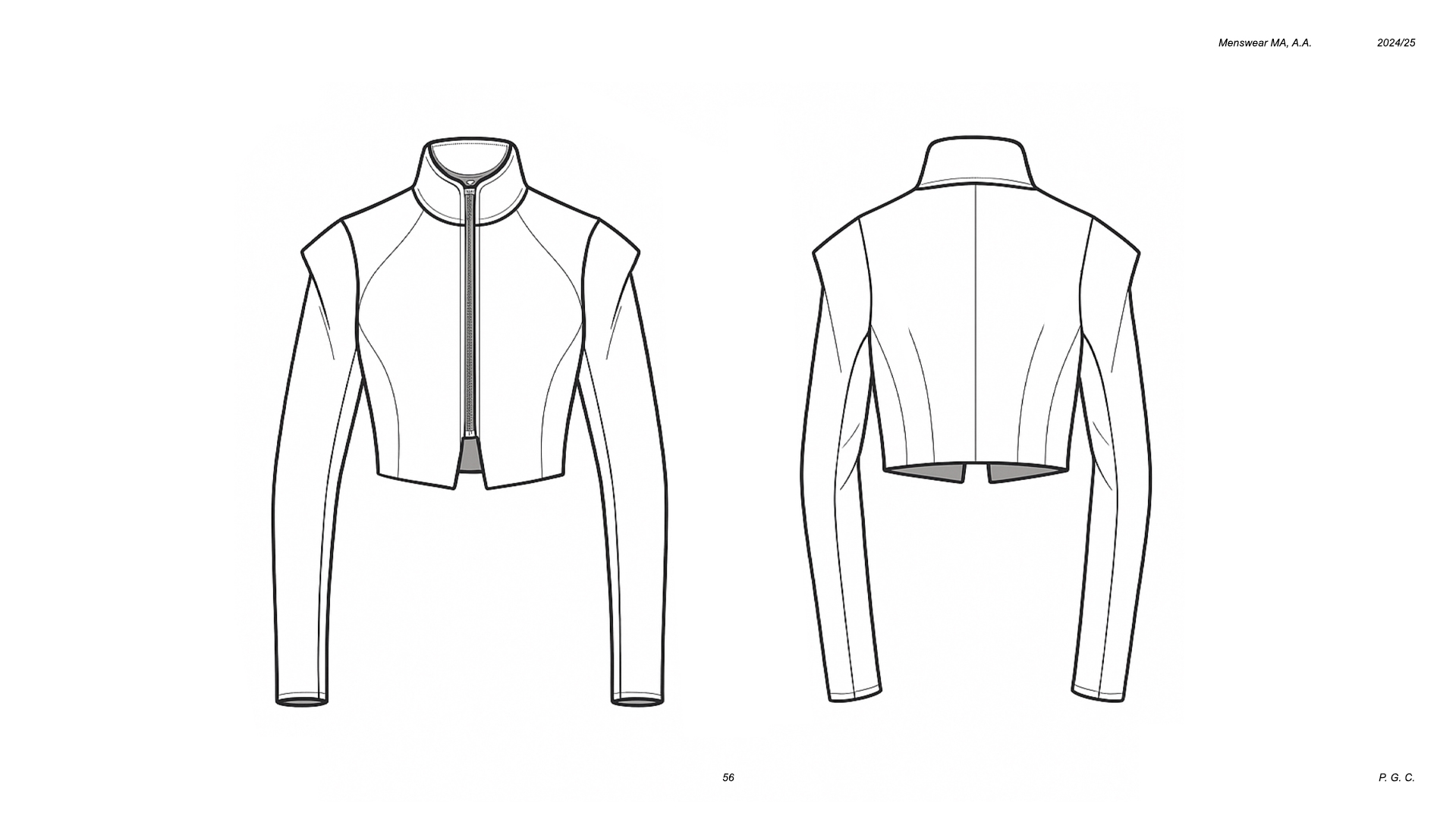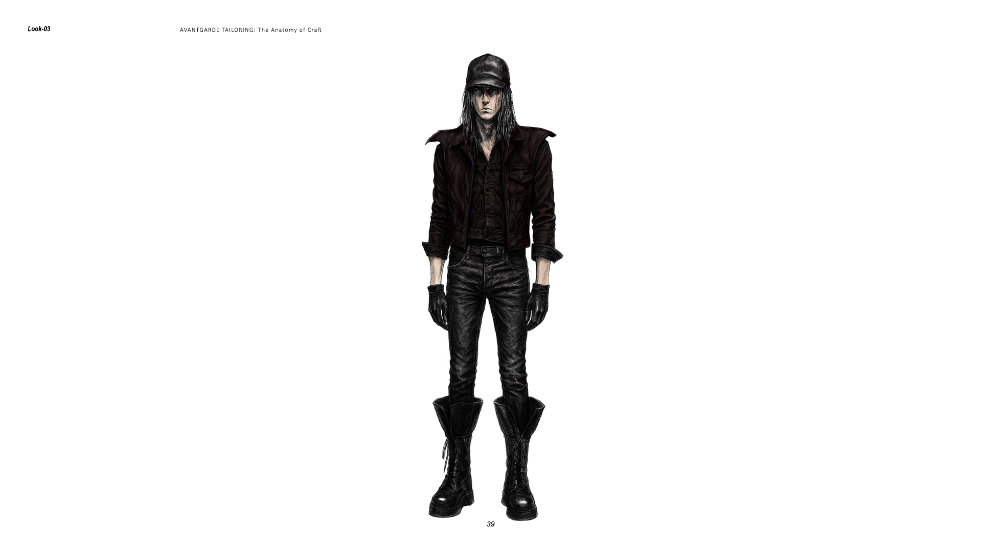 Abstract: This project investigates the intersection between avantgarde aesthetics and contemporary high-level tailoring. The aim is to redefine the relationship between experimentation, construction, and quality in menswear, while resisting the industrial standardisation that dominates the current fashion system. The research originates from direct experience inside Brioni's factory in Penne, where more than six hundred manual steps and over seventy hours of work are required to complete a single jacket. Observing the coexistence of Brioni's artisanal production and Gucci's industrial jackets within the same facility revealed a clear contrast between human precision and mechanical efficiency. This duality became the conceptual foundation of the work. The collection draws inspiration from designers such as Carol Christian Poell, Maurizio Amadei, Maurizio Altieri, and Rick Owens, whose practices merge brutalist aesthetics with deep material sensi-tivity. Through a year-long technical investigation, the project reconstructs and adapts Poell-inspired construction techniques on leather, in particular the Overlock Seam: a three-step process combining overlock stitching on a Venus IDL 302, reinforcement with Juki MF7923 or Union Special 36200-PJ, and internal sealing with hot melt adhesive. This transforms the seam into a living architectural element that exposes, rather than hides, its own structure. Each garment becomes an object of construction and memory, shaped in leather or fabric, cut, burned, and hand-finished. The work rejects decorative luxury and proposes a vision in which precision and imperfection coexist as an authentic language of making. Avantgarde Tailoring: The Anatomy of Craft stands as a manifesto for radical and contemporary craftsmanship, positioning the tailor not as a nostalgic figure, but as a contemporary author who, through gesture and material, redefines the anatomy of menswear.