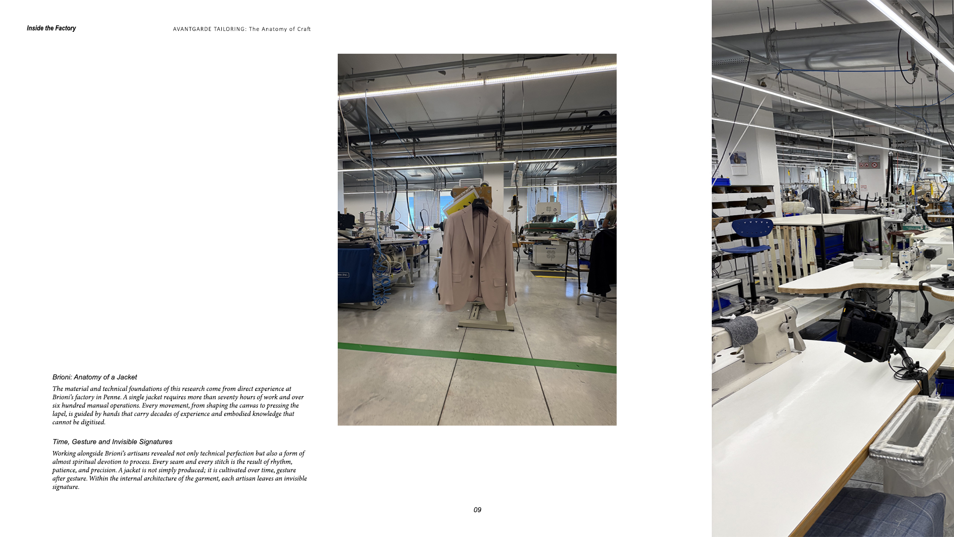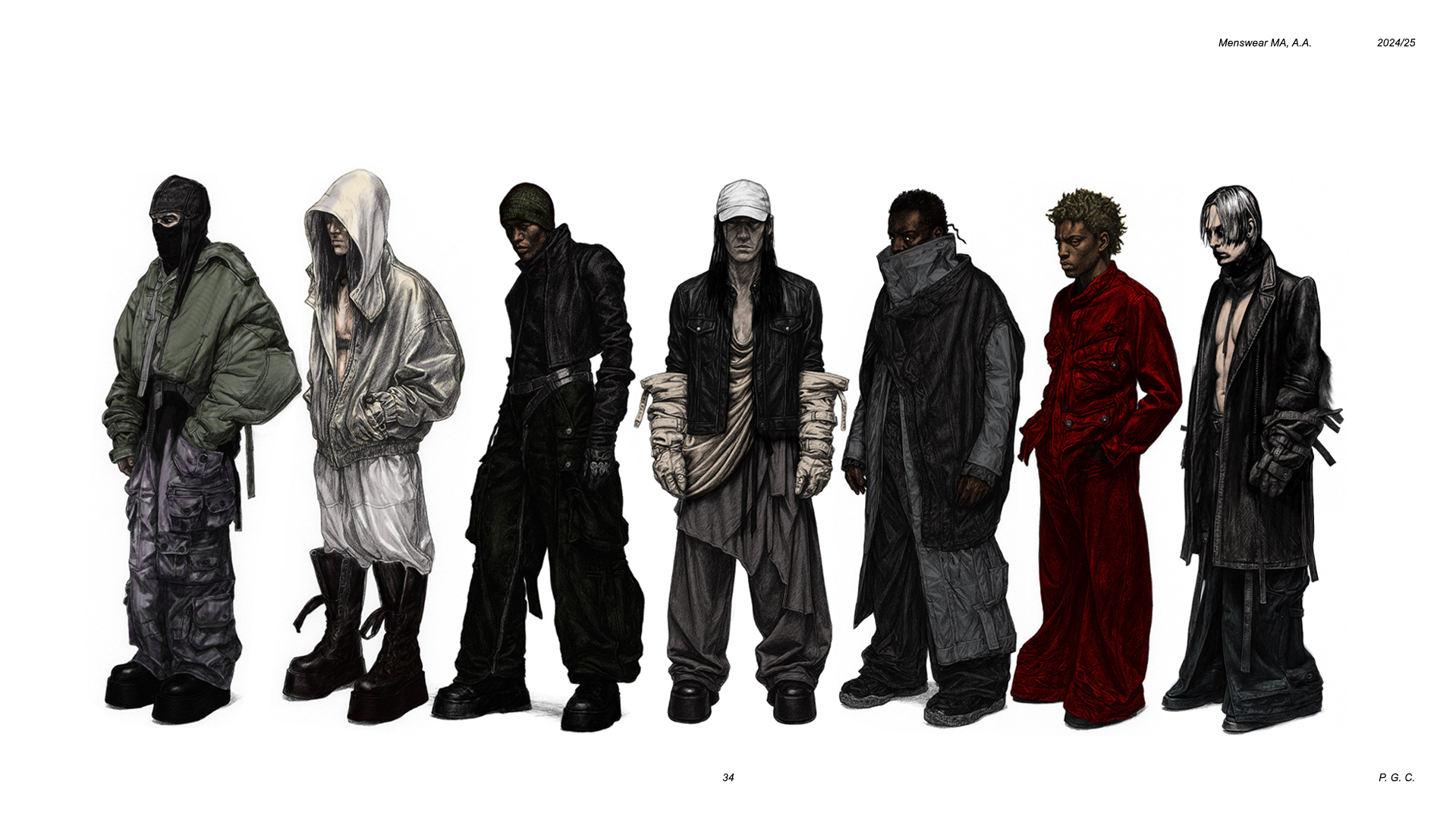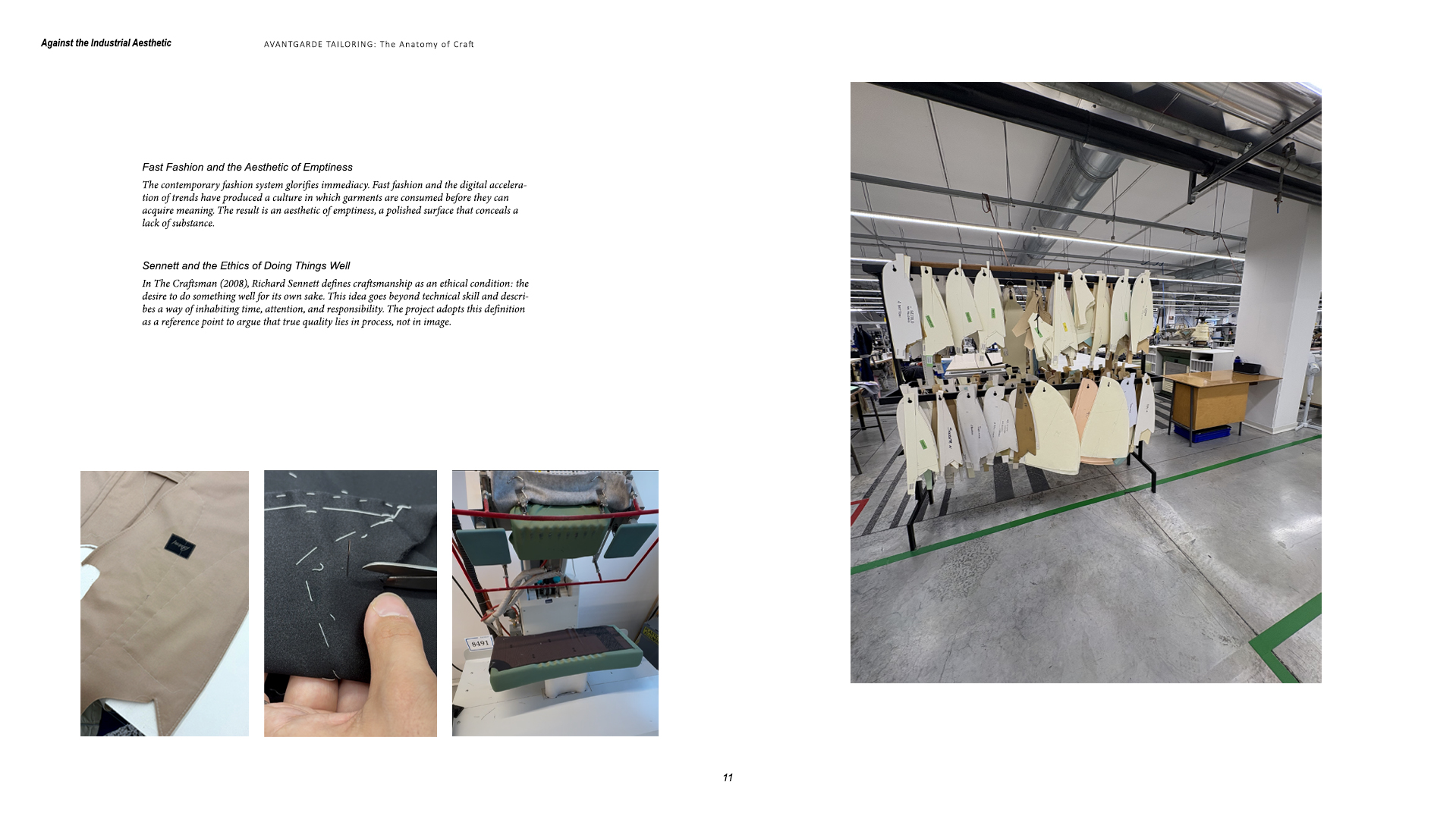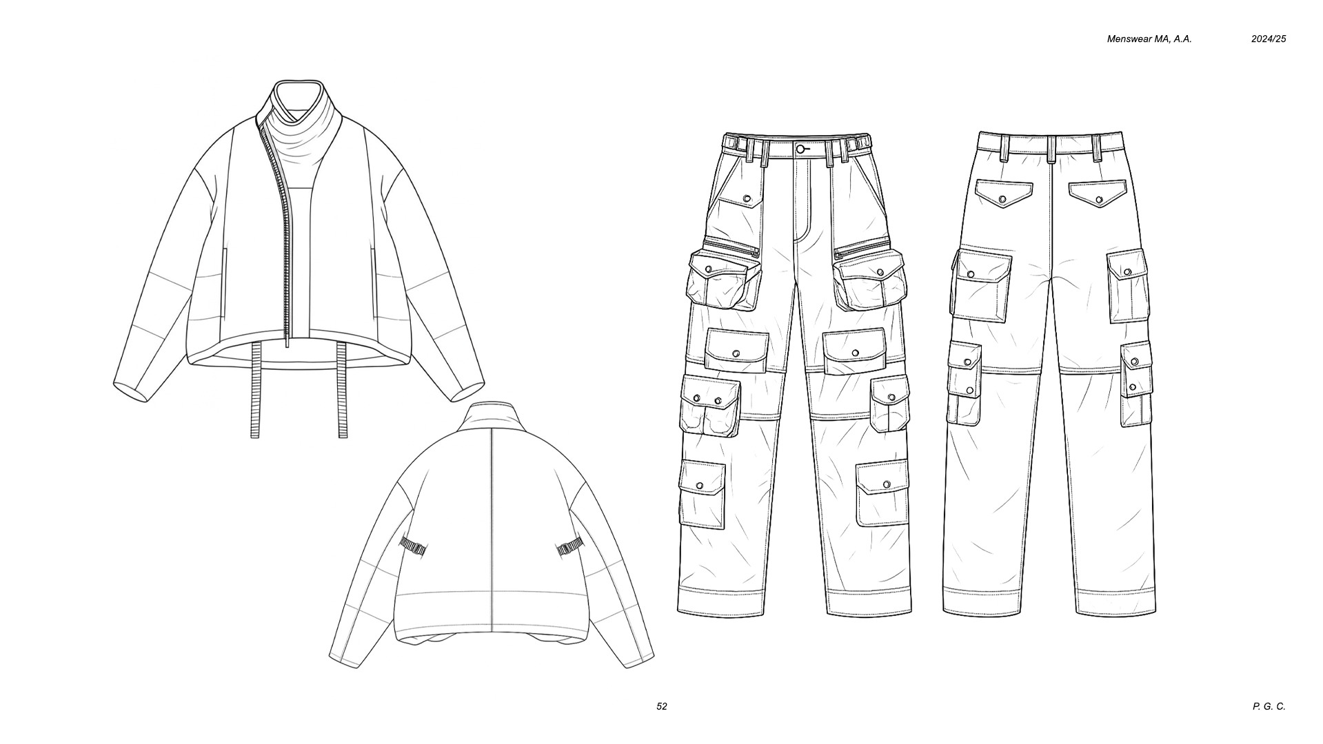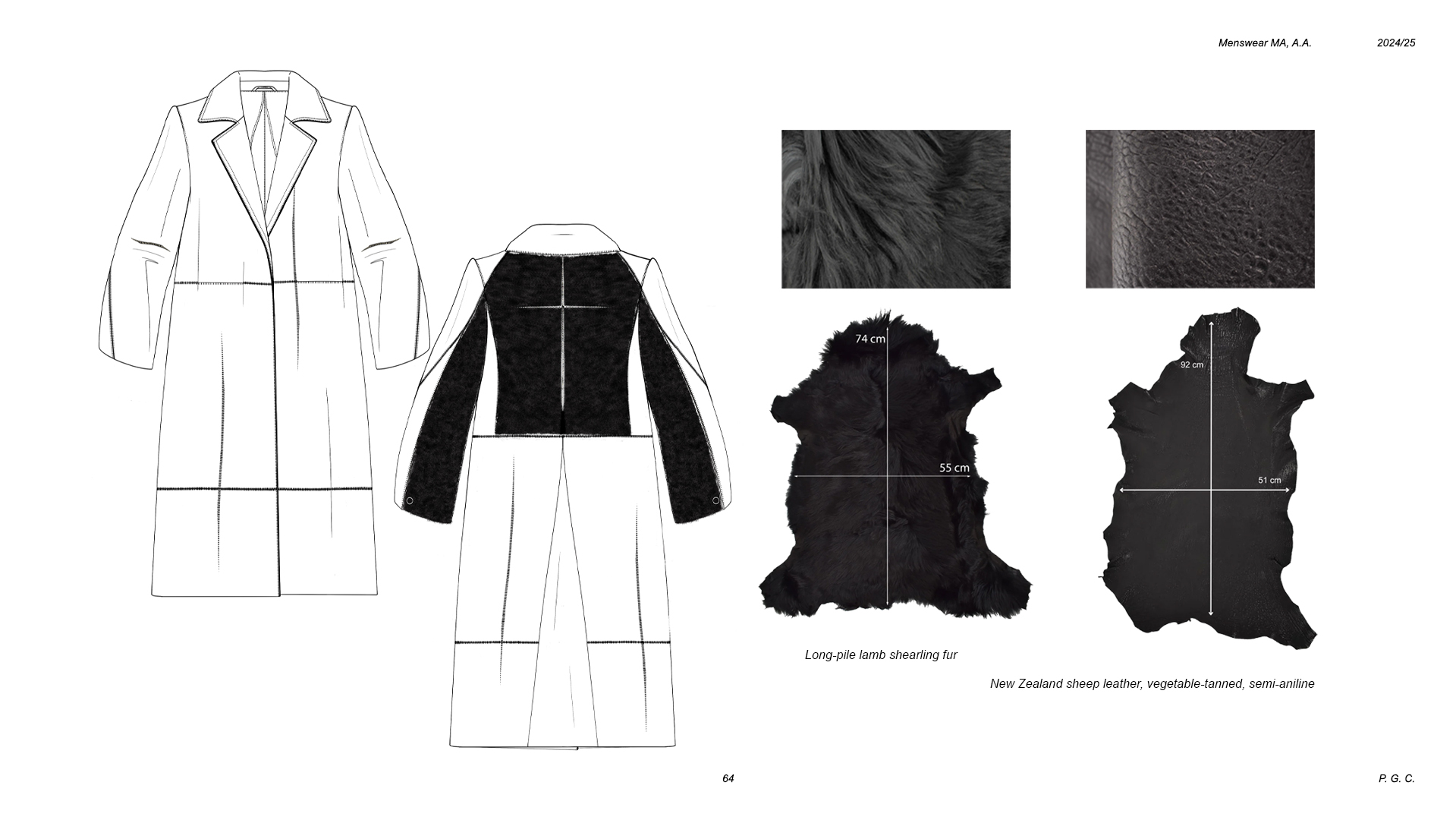 Abstract: This project investigates the intersection between avantgarde aesthetics and contemporary high-level tailoring. The aim is to redefine the relationship between experimentation, construction, and quality in menswear, while resisting the industrial standardisation that dominates the current fashion system. The research originates from direct experience inside Brioni's factory in Penne, where more than six hundred manual steps and over seventy hours of work are required to complete a single jacket. Observing the coexistence of Brioni's artisanal production and Gucci's industrial jackets within the same facility revealed a clear contrast between human precision and mechanical efficiency. This duality became the conceptual foundation of the work. The collection draws inspiration from designers such as Carol Christian Poell, Maurizio Amadei, Maurizio Altieri, and Rick Owens, whose practices merge brutalist aesthetics with deep material sensi-tivity. Through a year-long technical investigation, the project reconstructs and adapts Poell-inspired construction techniques on leather, in particular the Overlock Seam: a three-step process combining overlock stitching on a Venus IDL 302, reinforcement with Juki MF7923 or Union Special 36200-PJ, and internal sealing with hot melt adhesive. This transforms the seam into a living architectural element that exposes, rather than hides, its own structure. Each garment becomes an object of construction and memory, shaped in leather or fabric, cut, burned, and hand-finished. The work rejects decorative luxury and proposes a vision in which precision and imperfection coexist as an authentic language of making. Avantgarde Tailoring: The Anatomy of Craft stands as a manifesto for radical and contemporary craftsmanship, positioning the tailor not as a nostalgic figure, but as a contemporary author who, through gesture and material, redefines the anatomy of menswear.