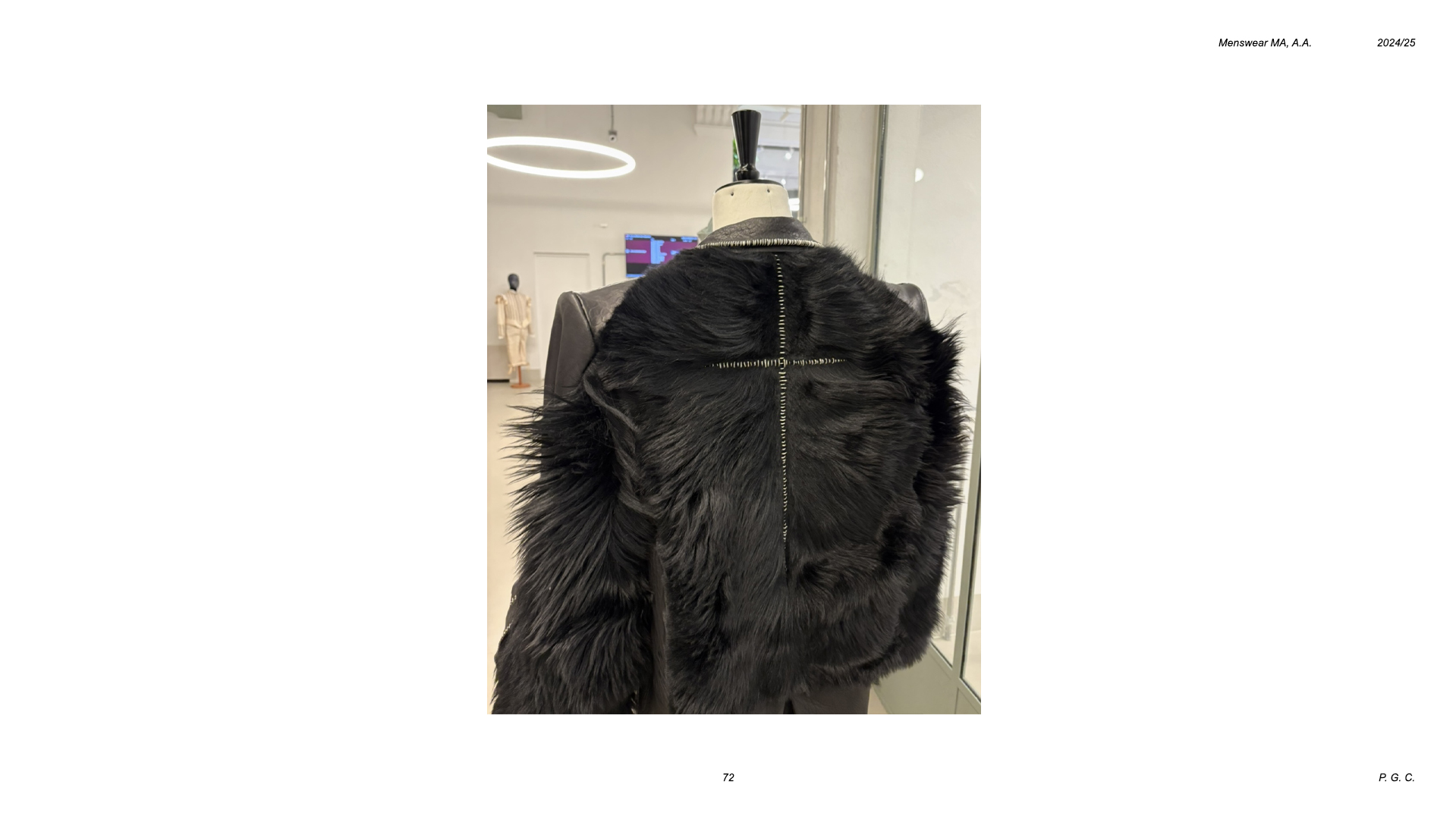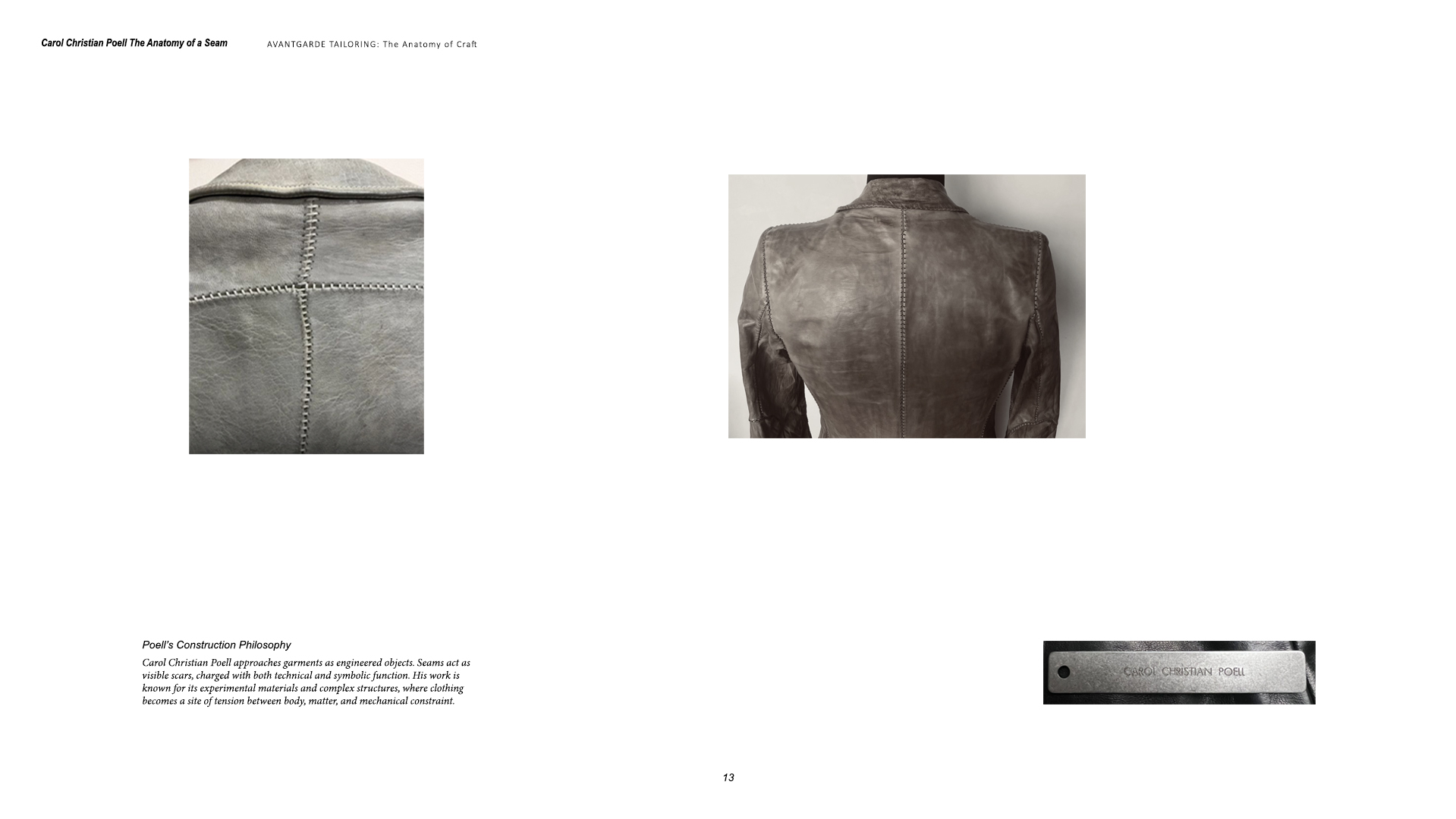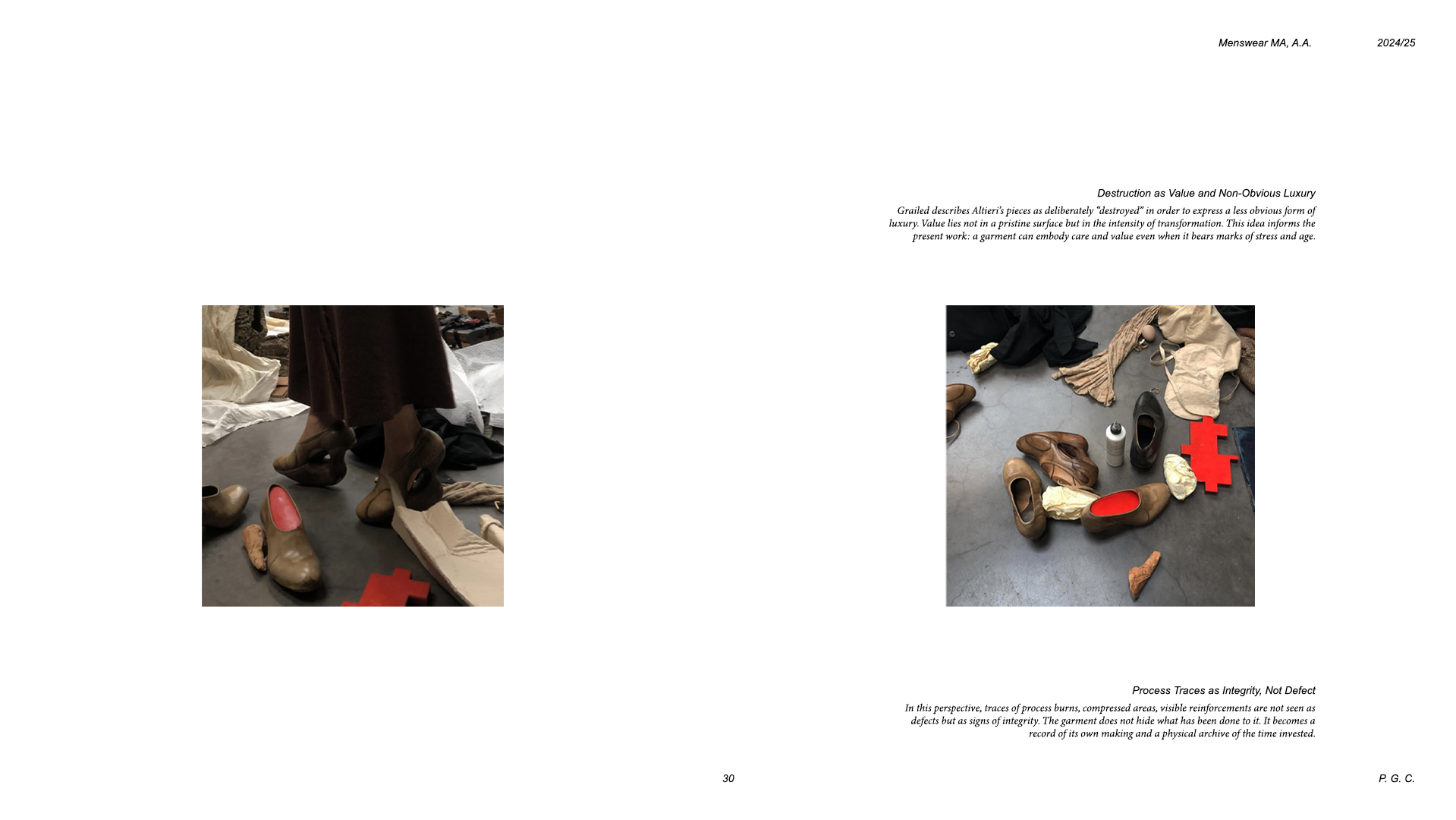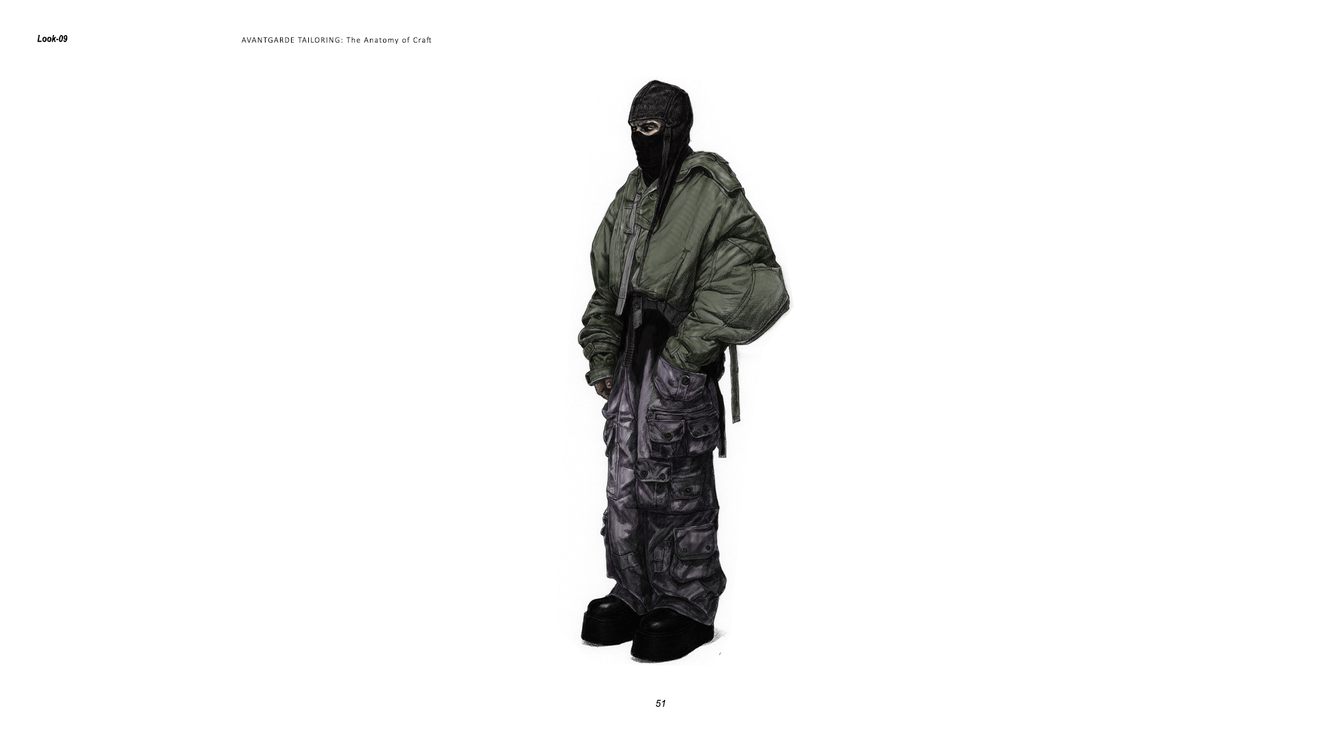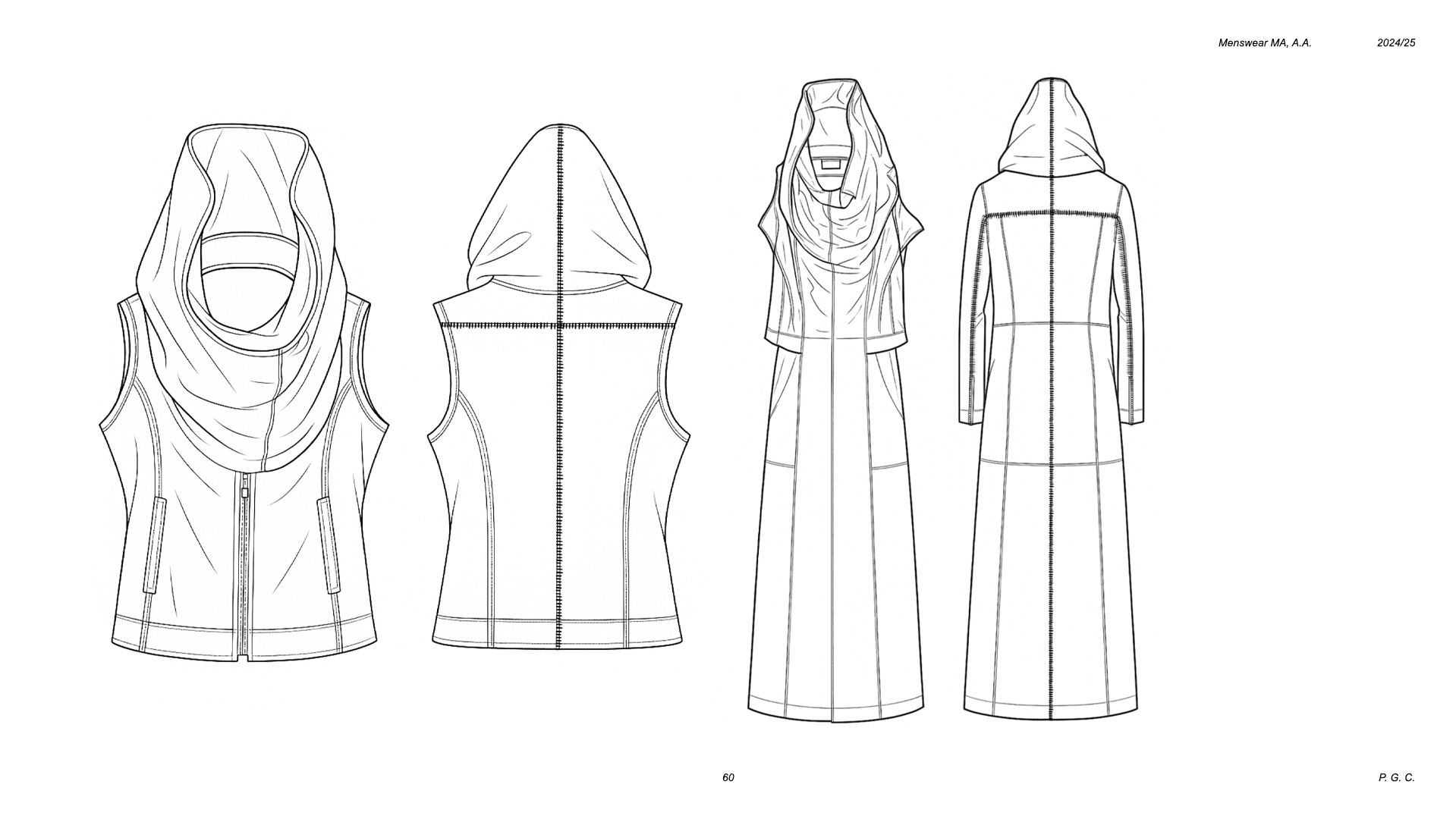 Abstract: This project investigates the intersection between avantgarde aesthetics and contemporary high-level tailoring. The aim is to redefine the relationship between experimentation, construction, and quality in menswear, while resisting the industrial standardisation that dominates the current fashion system. The research originates from direct experience inside Brioni's factory in Penne, where more than six hundred manual steps and over seventy hours of work are required to complete a single jacket. Observing the coexistence of Brioni's artisanal production and Gucci's industrial jackets within the same facility revealed a clear contrast between human precision and mechanical efficiency. This duality became the conceptual foundation of the work. The collection draws inspiration from designers such as Carol Christian Poell, Maurizio Amadei, Maurizio Altieri, and Rick Owens, whose practices merge brutalist aesthetics with deep material sensi-tivity. Through a year-long technical investigation, the project reconstructs and adapts Poell-inspired construction techniques on leather, in particular the Overlock Seam: a three-step process combining overlock stitching on a Venus IDL 302, reinforcement with Juki MF7923 or Union Special 36200-PJ, and internal sealing with hot melt adhesive. This transforms the seam into a living architectural element that exposes, rather than hides, its own structure. Each garment becomes an object of construction and memory, shaped in leather or fabric, cut, burned, and hand-finished. The work rejects decorative luxury and proposes a vision in which precision and imperfection coexist as an authentic language of making. Avantgarde Tailoring: The Anatomy of Craft stands as a manifesto for radical and contemporary craftsmanship, positioning the tailor not as a nostalgic figure, but as a contemporary author who, through gesture and material, redefines the anatomy of menswear.