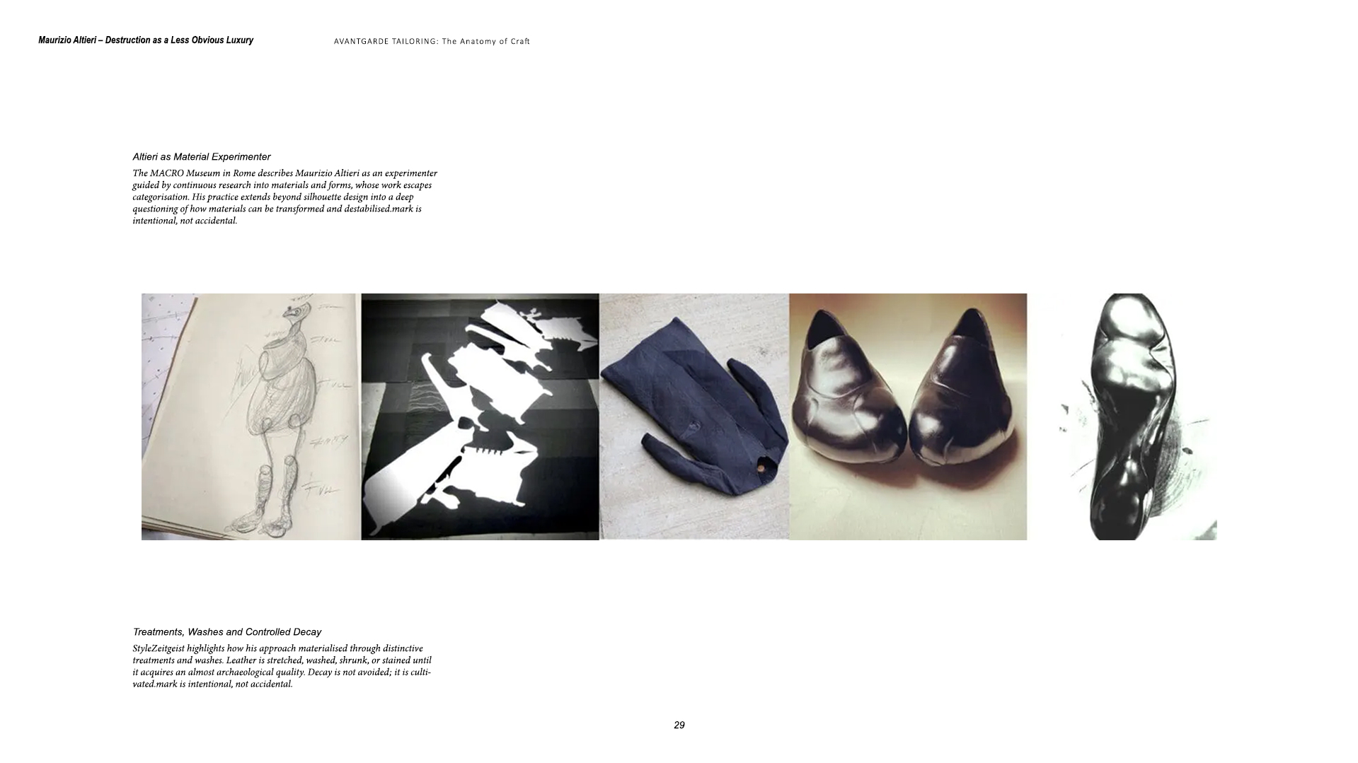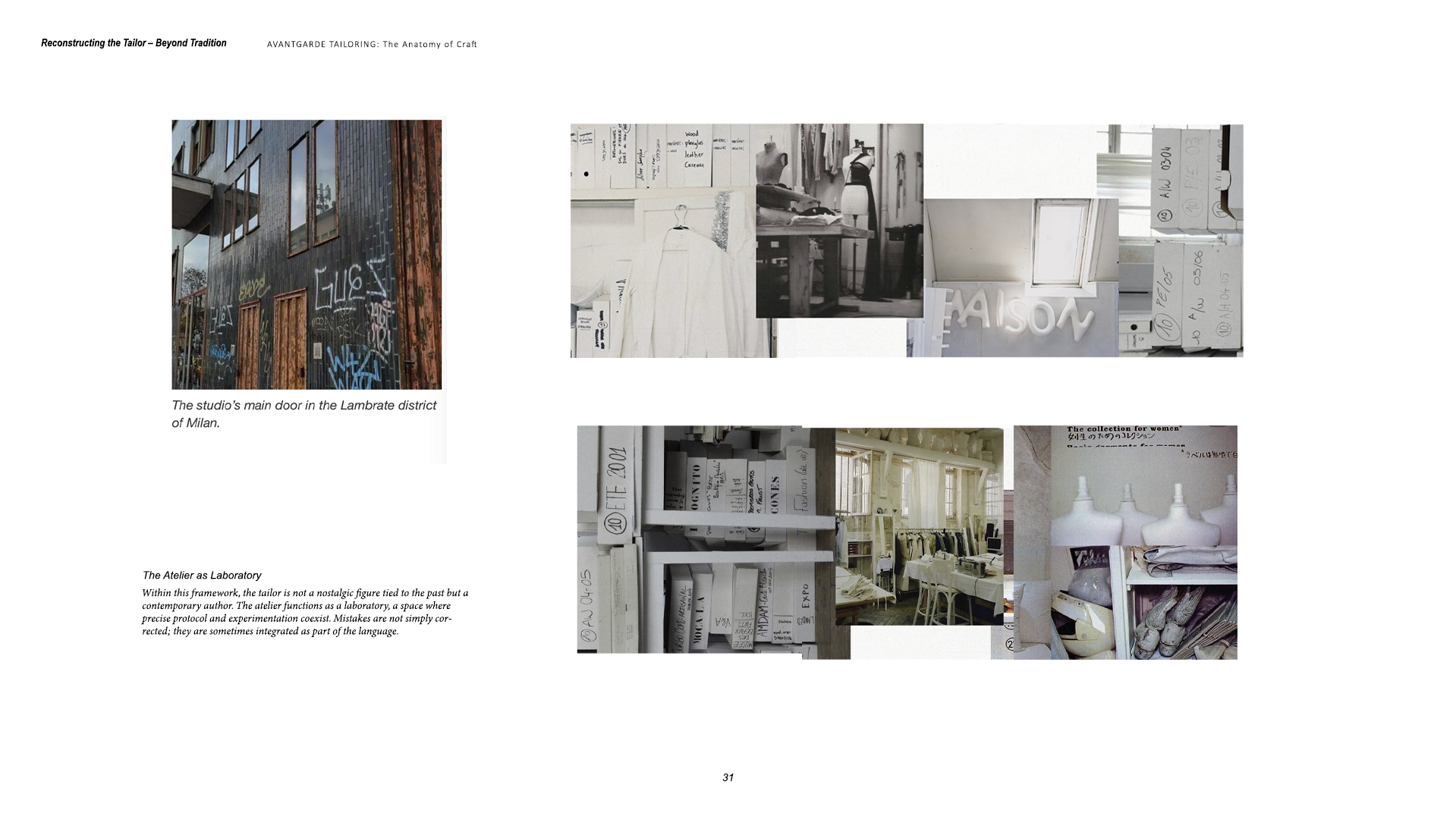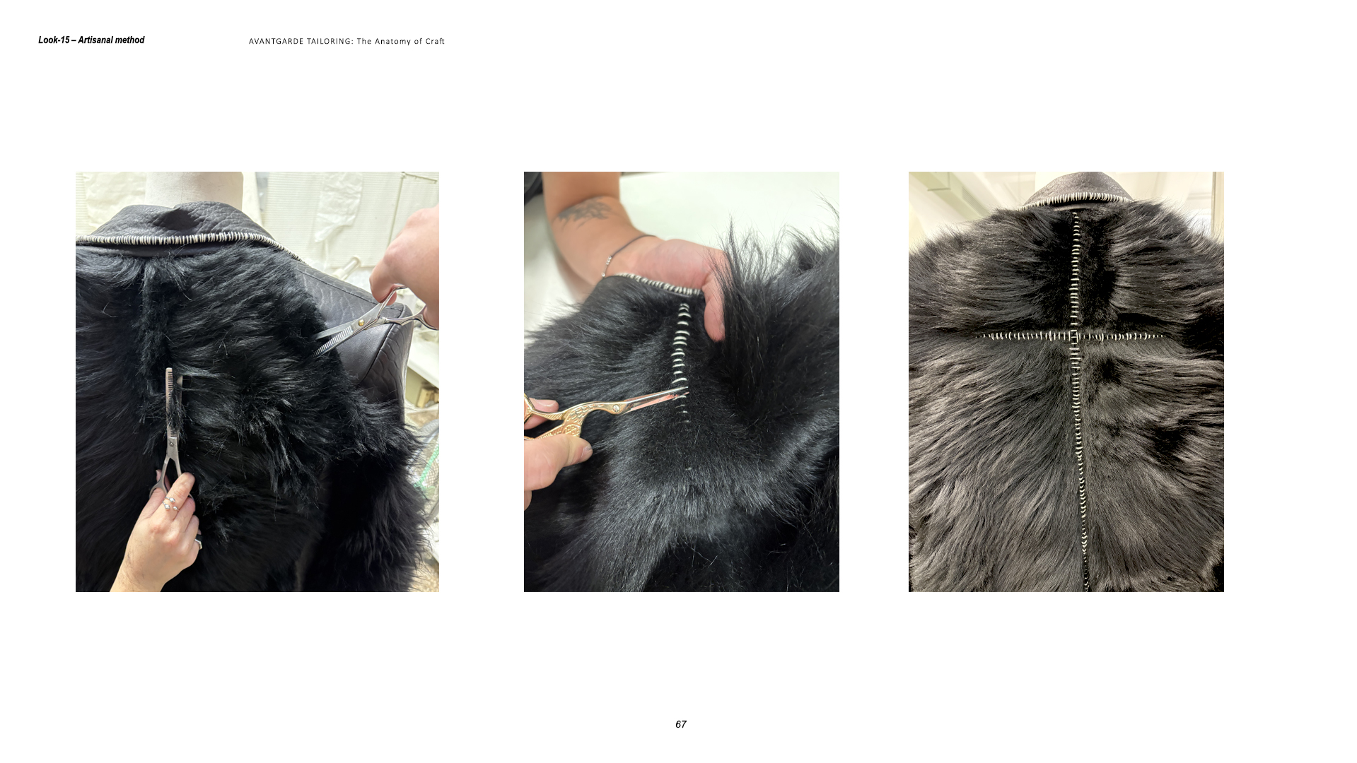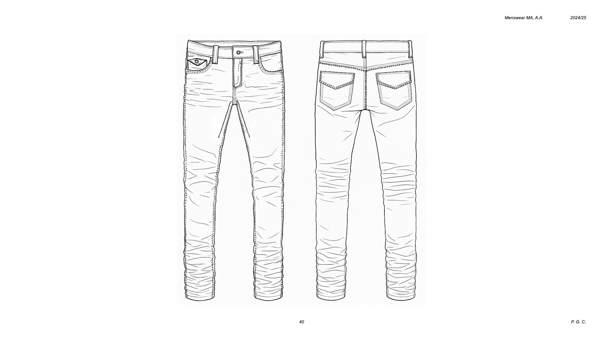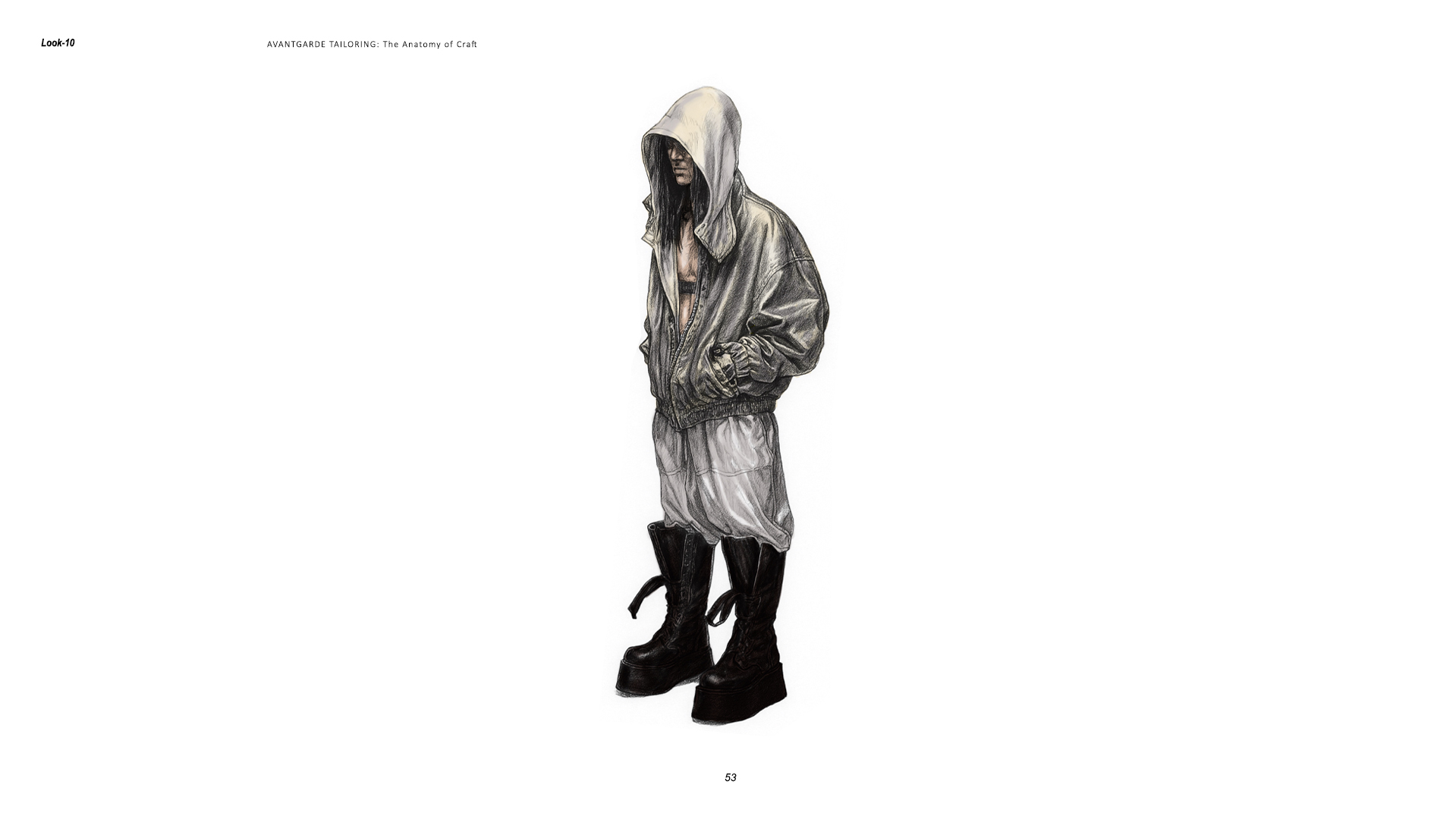 Abstract: This project investigates the intersection between avantgarde aesthetics and contemporary high-level tailoring. The aim is to redefine the relationship between experimentation, construction, and quality in menswear, while resisting the industrial standardisation that dominates the current fashion system. The research originates from direct experience inside Brioni's factory in Penne, where more than six hundred manual steps and over seventy hours of work are required to complete a single jacket. Observing the coexistence of Brioni's artisanal production and Gucci's industrial jackets within the same facility revealed a clear contrast between human precision and mechanical efficiency. This duality became the conceptual foundation of the work. The collection draws inspiration from designers such as Carol Christian Poell, Maurizio Amadei, Maurizio Altieri, and Rick Owens, whose practices merge brutalist aesthetics with deep material sensi-tivity. Through a year-long technical investigation, the project reconstructs and adapts Poell-inspired construction techniques on leather, in particular the Overlock Seam: a three-step process combining overlock stitching on a Venus IDL 302, reinforcement with Juki MF7923 or Union Special 36200-PJ, and internal sealing with hot melt adhesive. This transforms the seam into a living architectural element that exposes, rather than hides, its own structure. Each garment becomes an object of construction and memory, shaped in leather or fabric, cut, burned, and hand-finished. The work rejects decorative luxury and proposes a vision in which precision and imperfection coexist as an authentic language of making. Avantgarde Tailoring: The Anatomy of Craft stands as a manifesto for radical and contemporary craftsmanship, positioning the tailor not as a nostalgic figure, but as a contemporary author who, through gesture and material, redefines the anatomy of menswear.