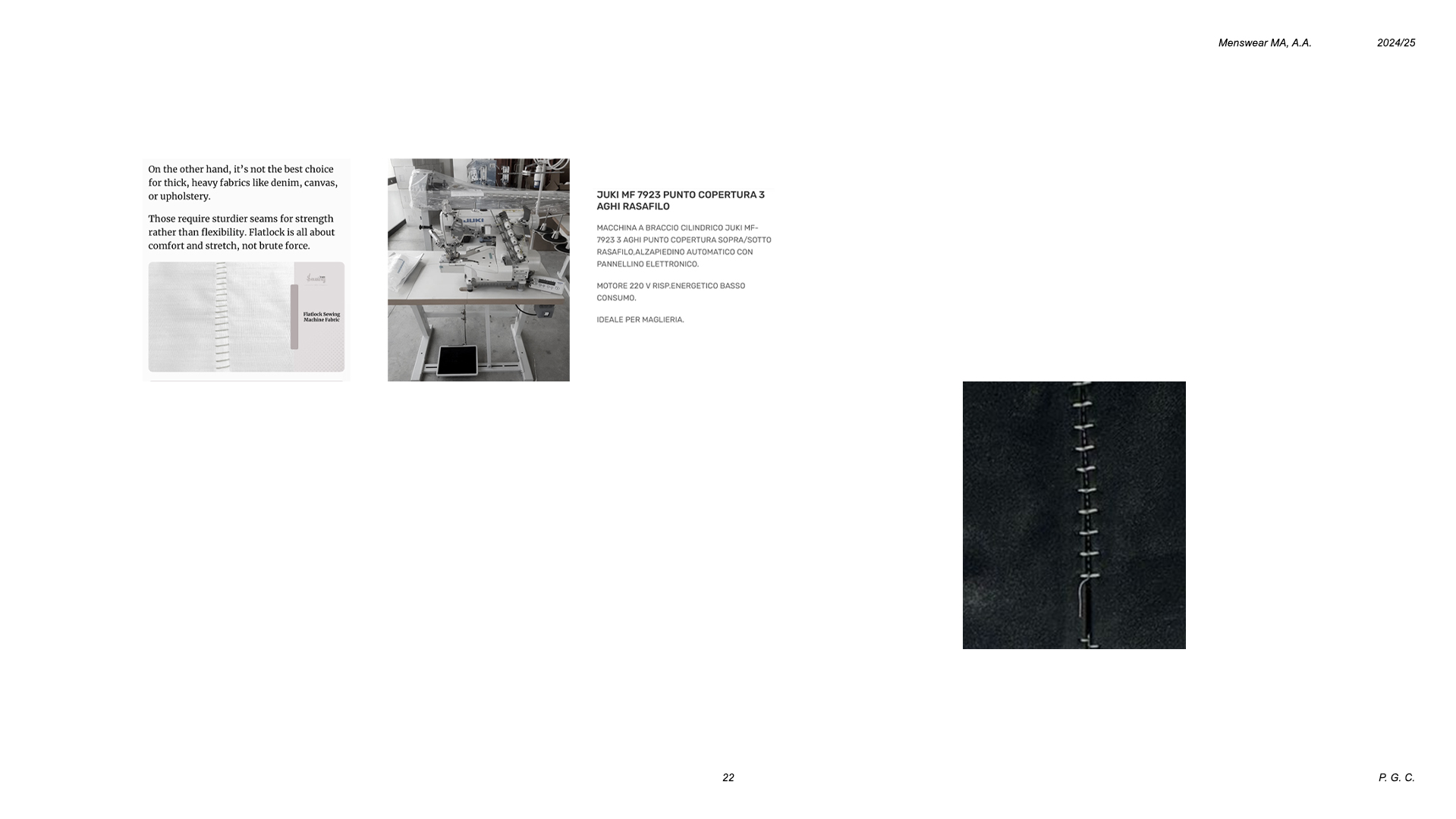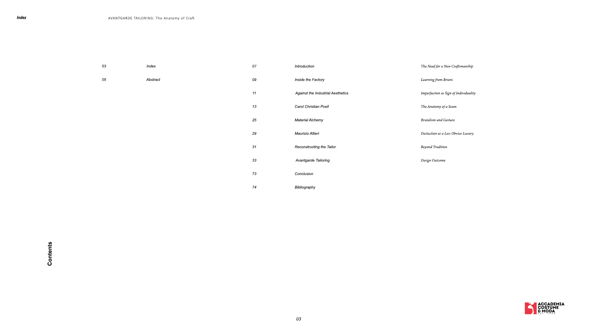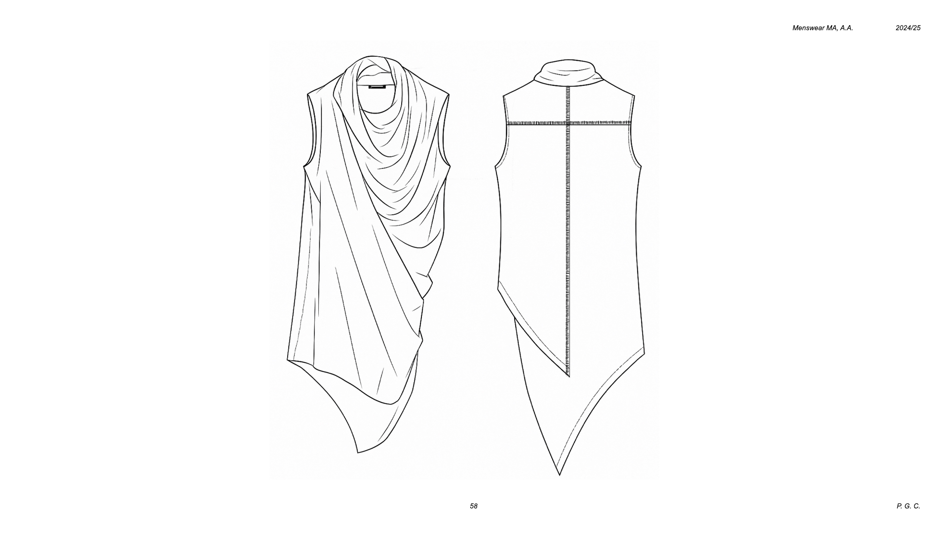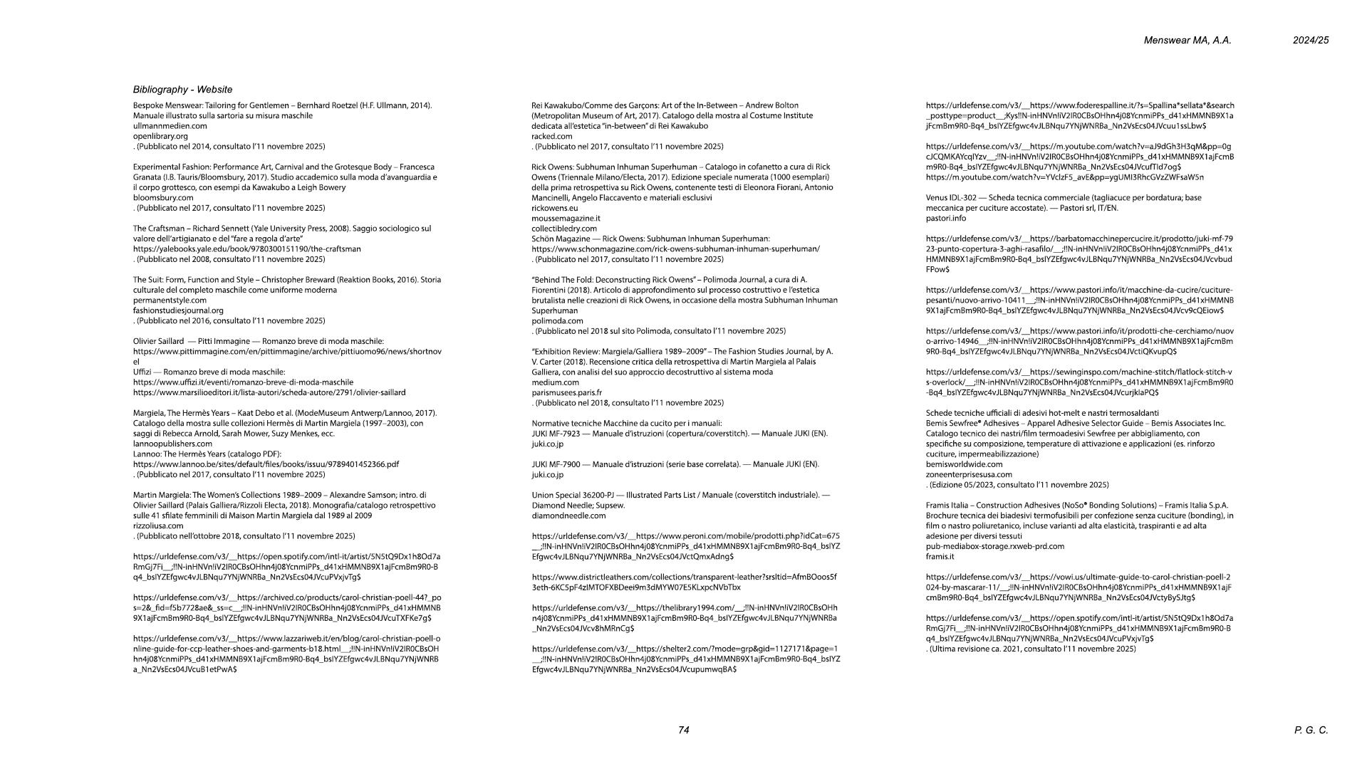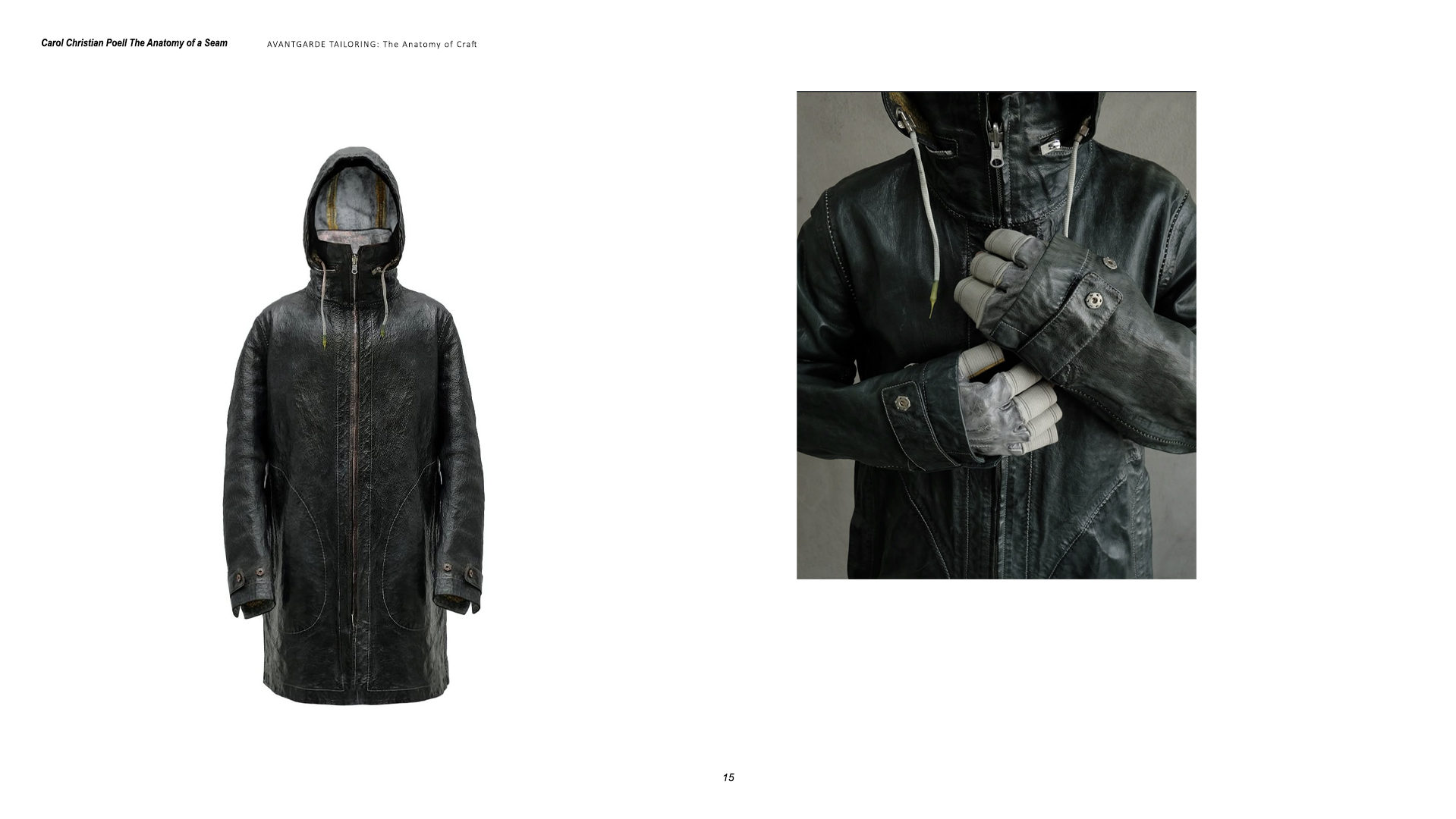 Abstract: This project investigates the intersection between avantgarde aesthetics and contemporary high-level tailoring. The aim is to redefine the relationship between experimentation, construction, and quality in menswear, while resisting the industrial standardisation that dominates the current fashion system. The research originates from direct experience inside Brioni's factory in Penne, where more than six hundred manual steps and over seventy hours of work are required to complete a single jacket. Observing the coexistence of Brioni's artisanal production and Gucci's industrial jackets within the same facility revealed a clear contrast between human precision and mechanical efficiency. This duality became the conceptual foundation of the work. The collection draws inspiration from designers such as Carol Christian Poell, Maurizio Amadei, Maurizio Altieri, and Rick Owens, whose practices merge brutalist aesthetics with deep material sensi-tivity. Through a year-long technical investigation, the project reconstructs and adapts Poell-inspired construction techniques on leather, in particular the Overlock Seam: a three-step process combining overlock stitching on a Venus IDL 302, reinforcement with Juki MF7923 or Union Special 36200-PJ, and internal sealing with hot melt adhesive. This transforms the seam into a living architectural element that exposes, rather than hides, its own structure. Each garment becomes an object of construction and memory, shaped in leather or fabric, cut, burned, and hand-finished. The work rejects decorative luxury and proposes a vision in which precision and imperfection coexist as an authentic language of making. Avantgarde Tailoring: The Anatomy of Craft stands as a manifesto for radical and contemporary craftsmanship, positioning the tailor not as a nostalgic figure, but as a contemporary author who, through gesture and material, redefines the anatomy of menswear.